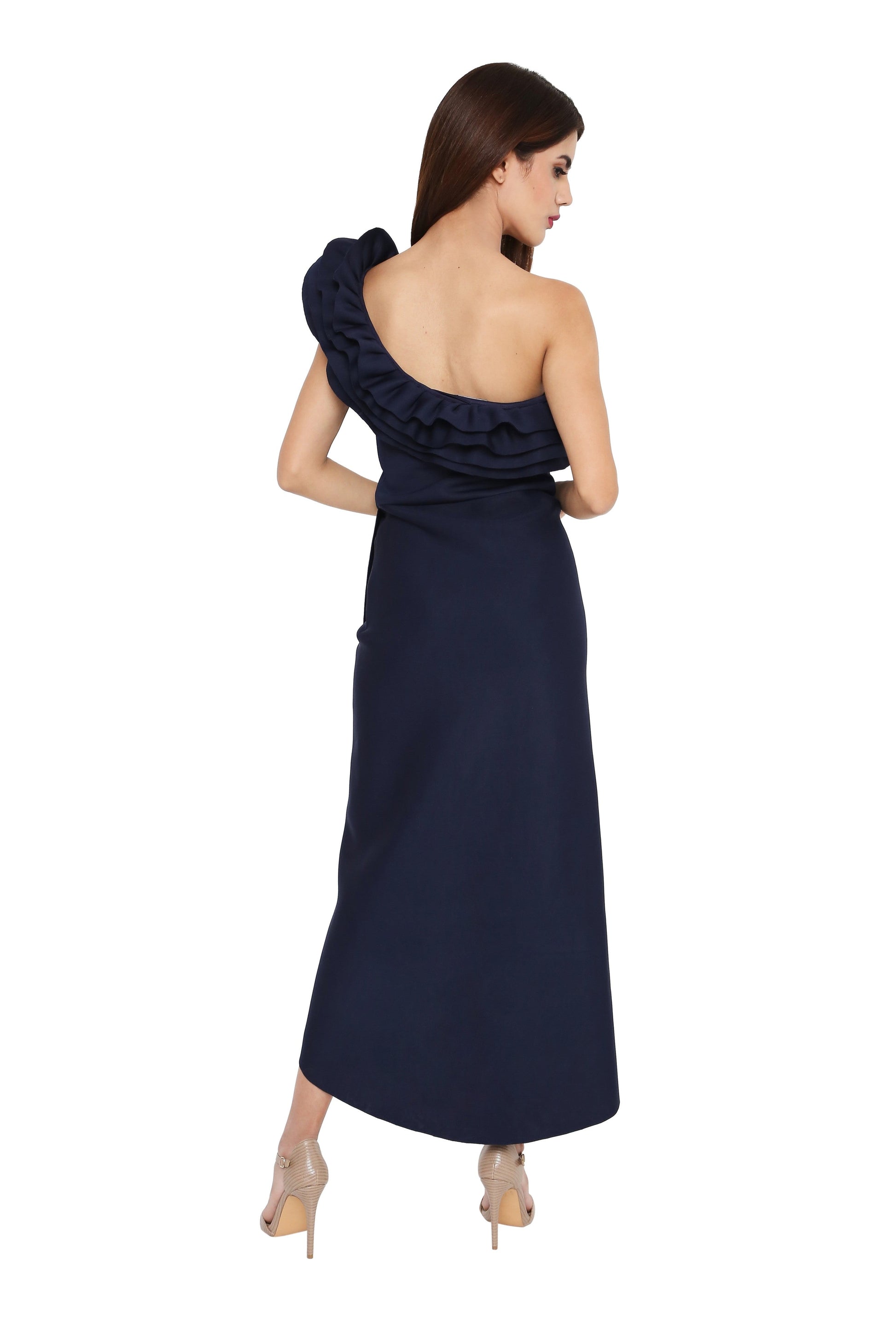 Featuring one shoulder ruffles that can be self attached via hooks and eyes.