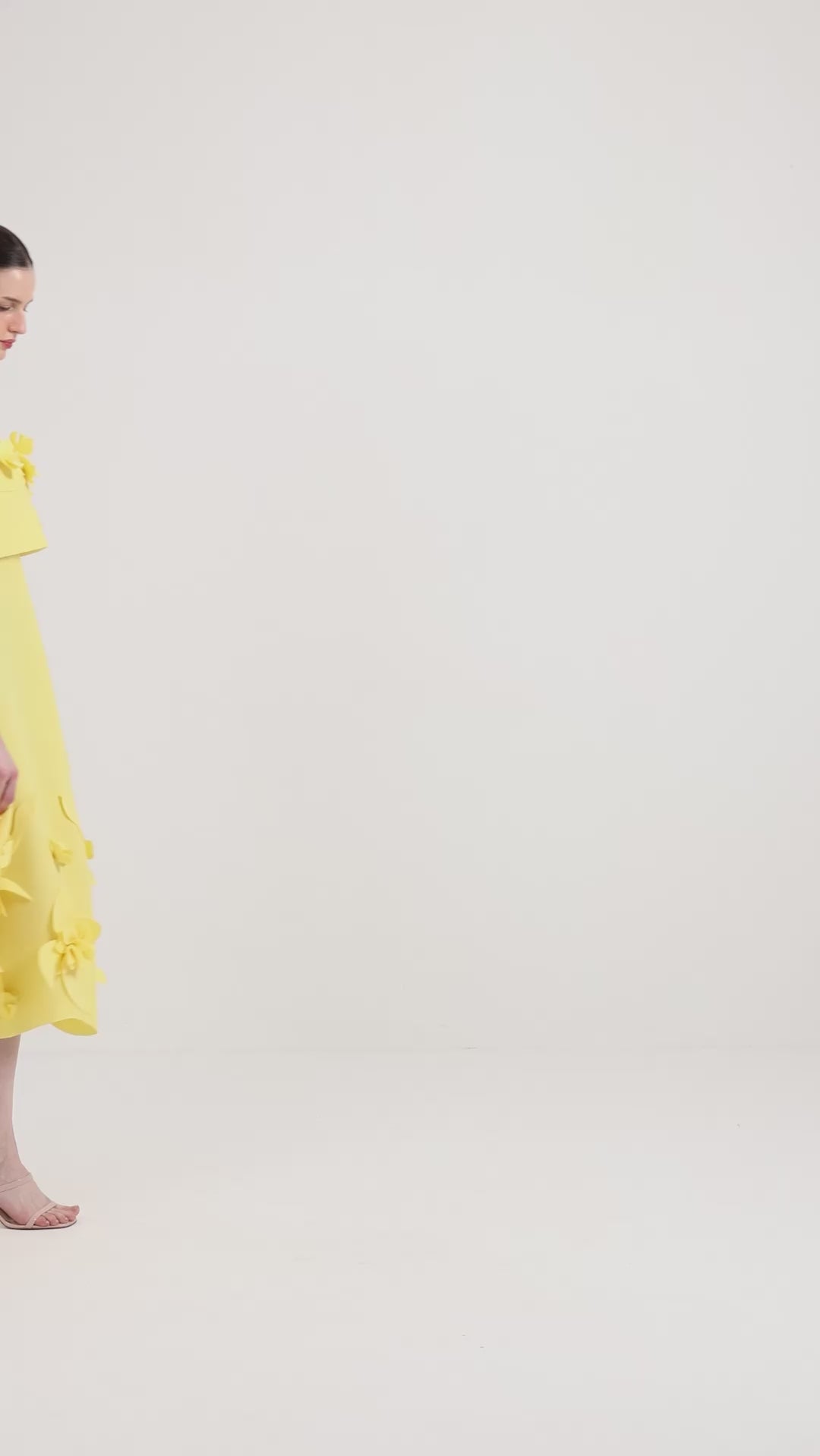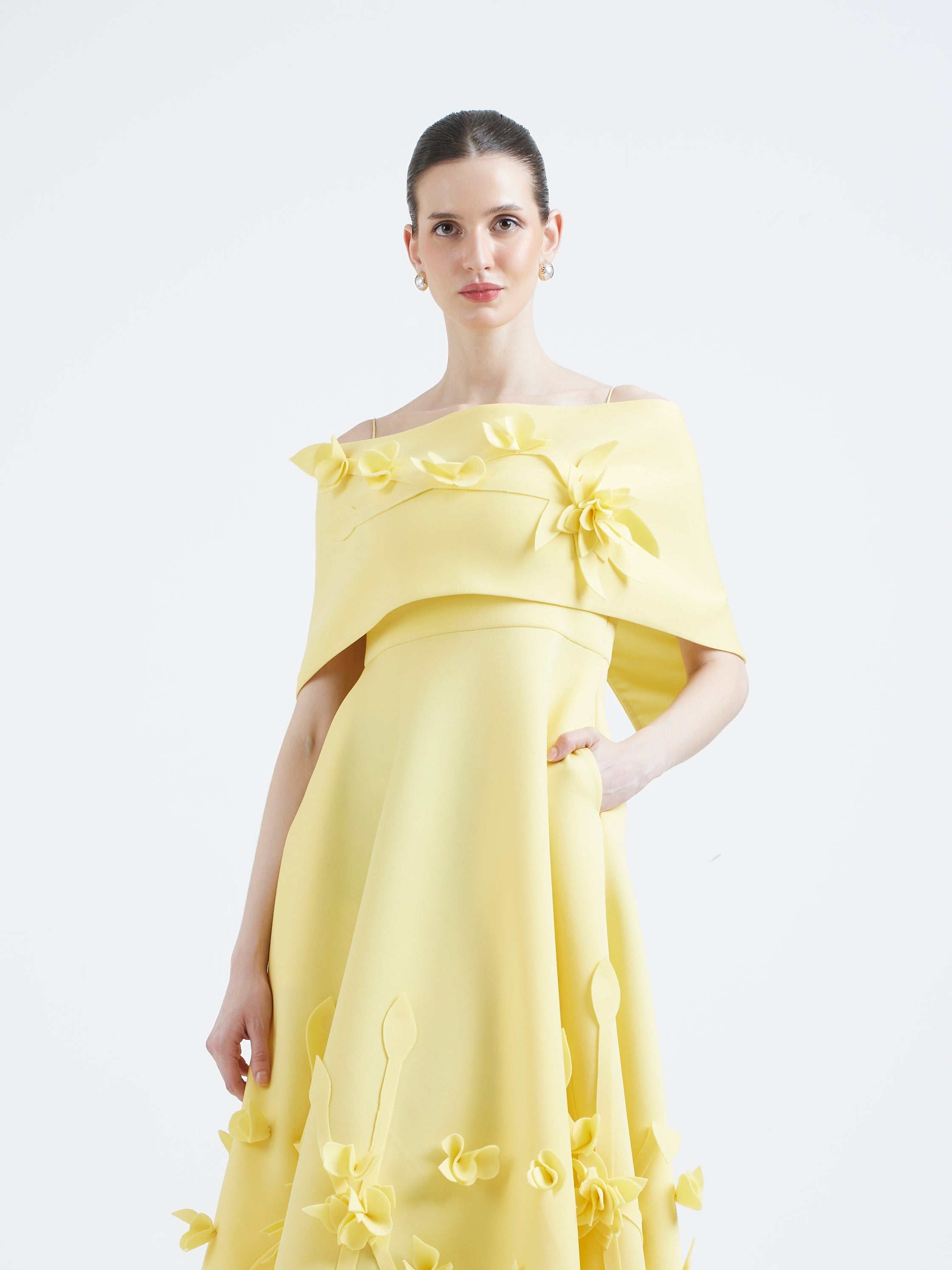 The detachable overlay adds a contemporary twist, gently draping across the bodice. Three-dimensional floral appliqués bloom across the neckline and hem, giving the piece a playful yet refined charm.
