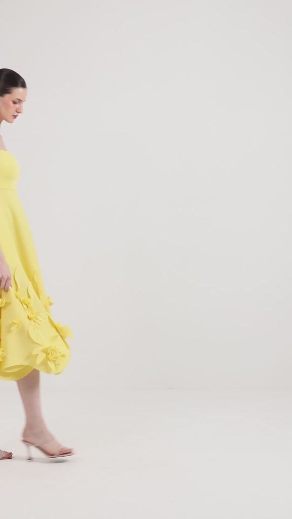 Radiating soft elegance, this sunshine-yellow dress is crafted in luxurious neoprene fabric that holds its shape beautifully while offering a smooth, sculpted fall.