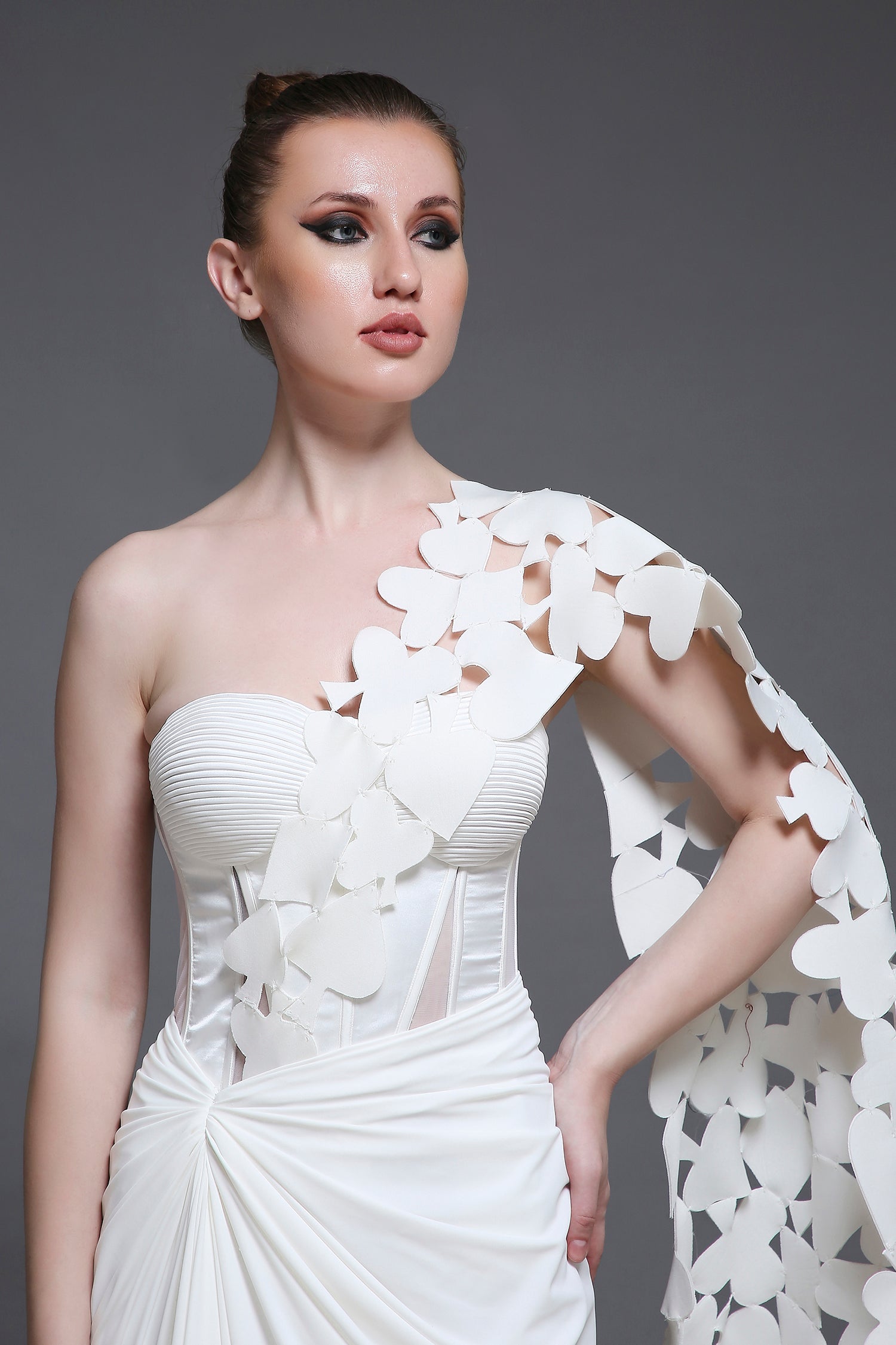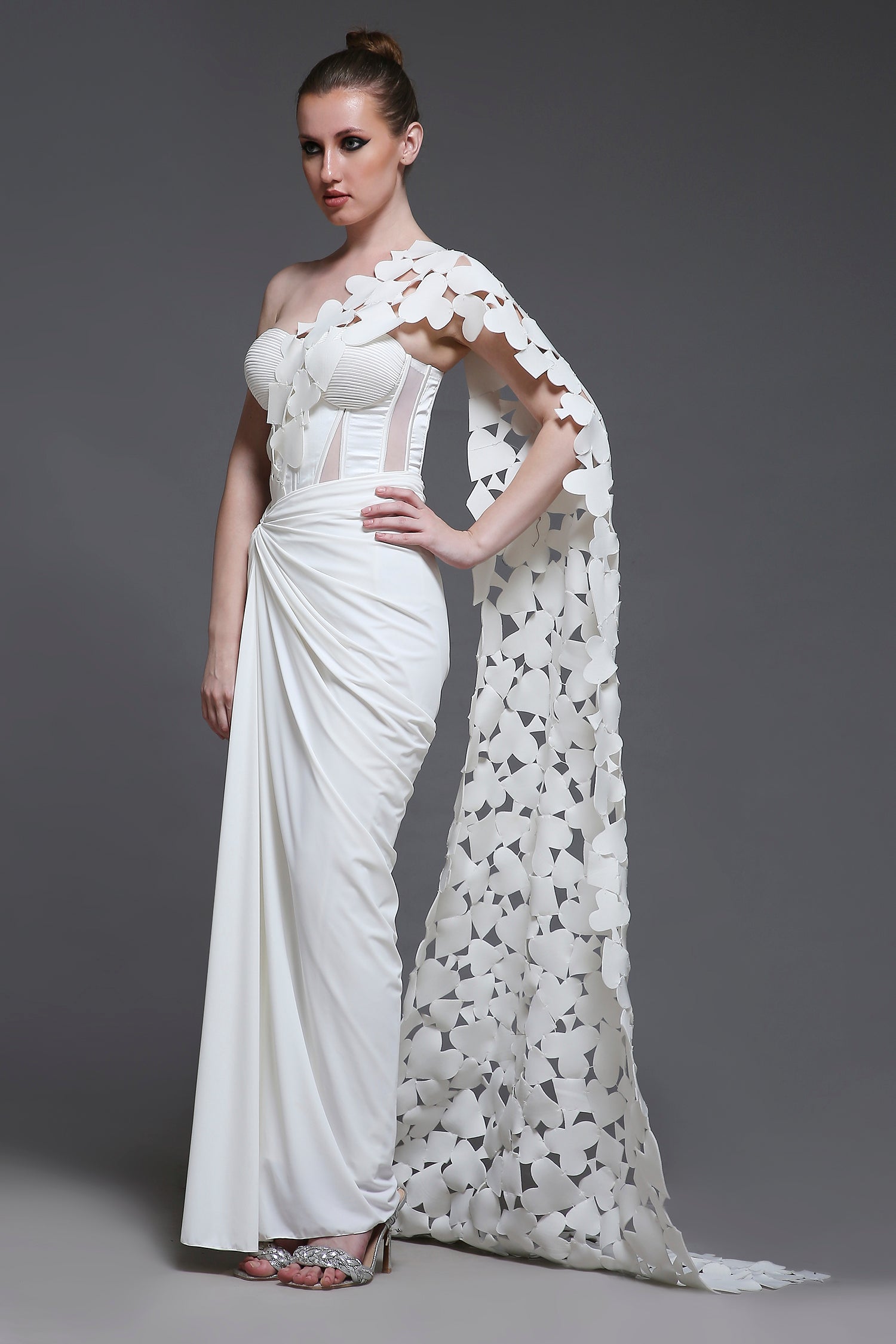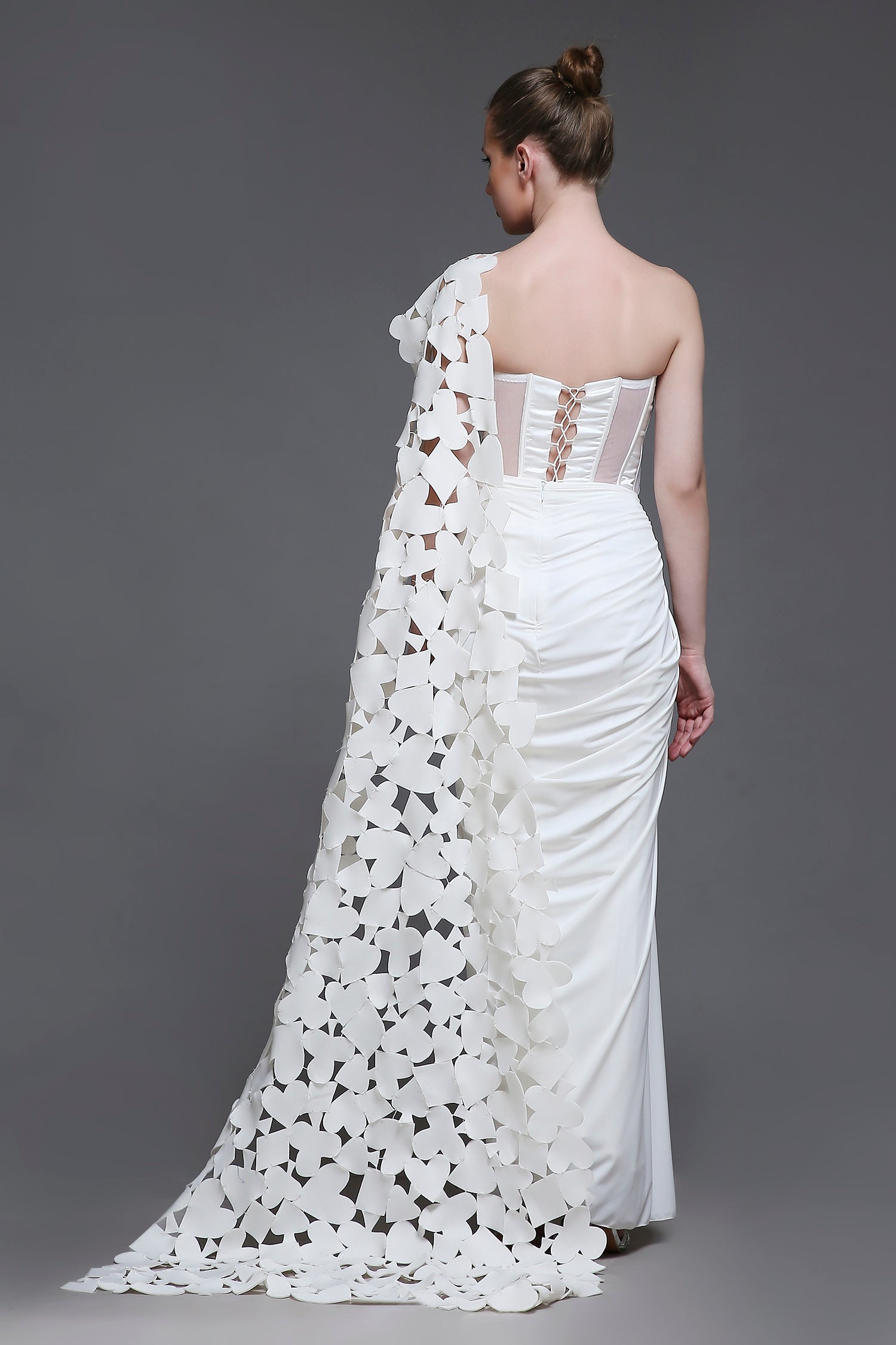 Completing the ensemble is a detachable drape with intricate cutwork patch detailing, adding a layer of elegance and artistry. Perfect for making a statement at any special occasion.