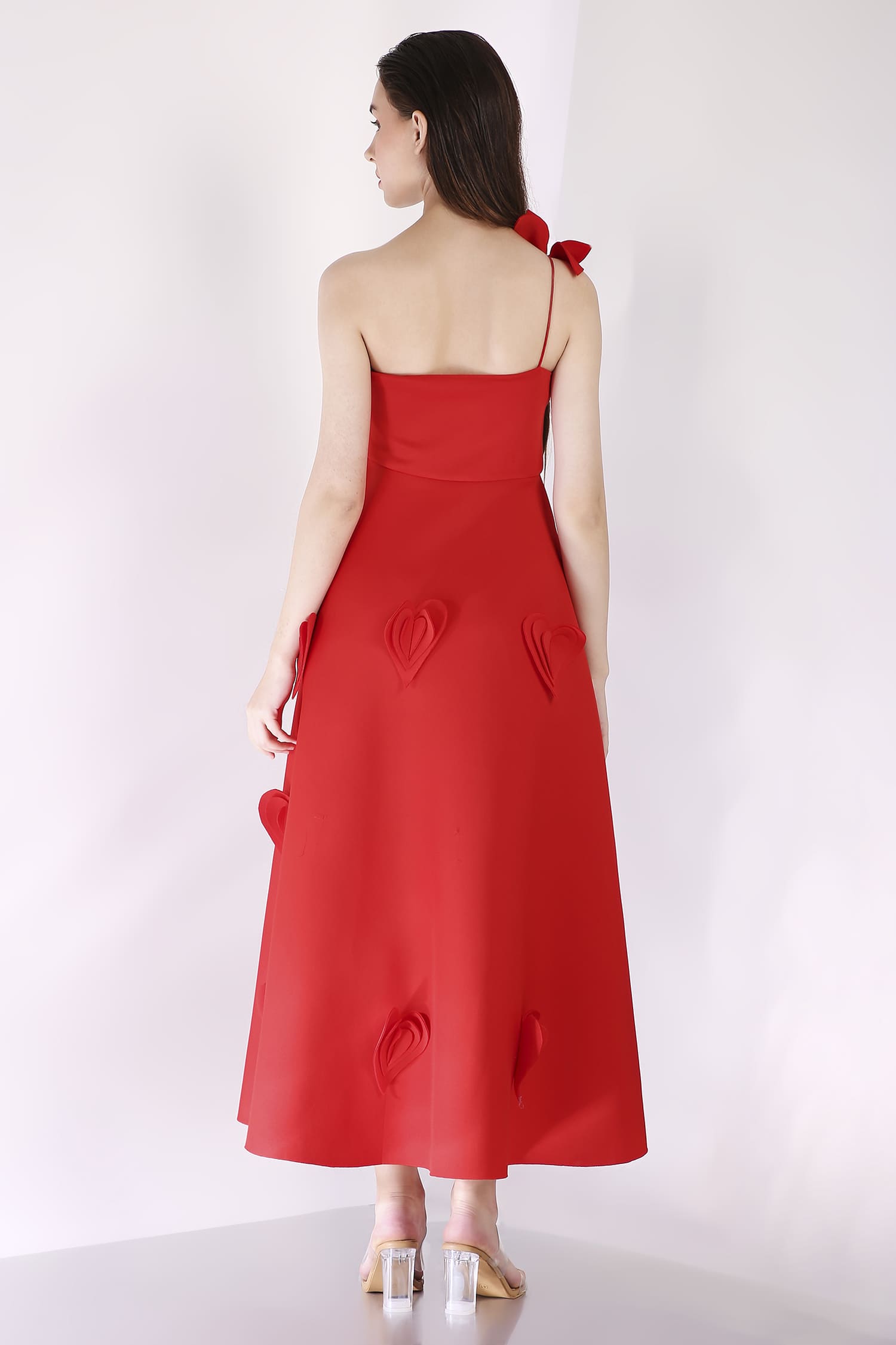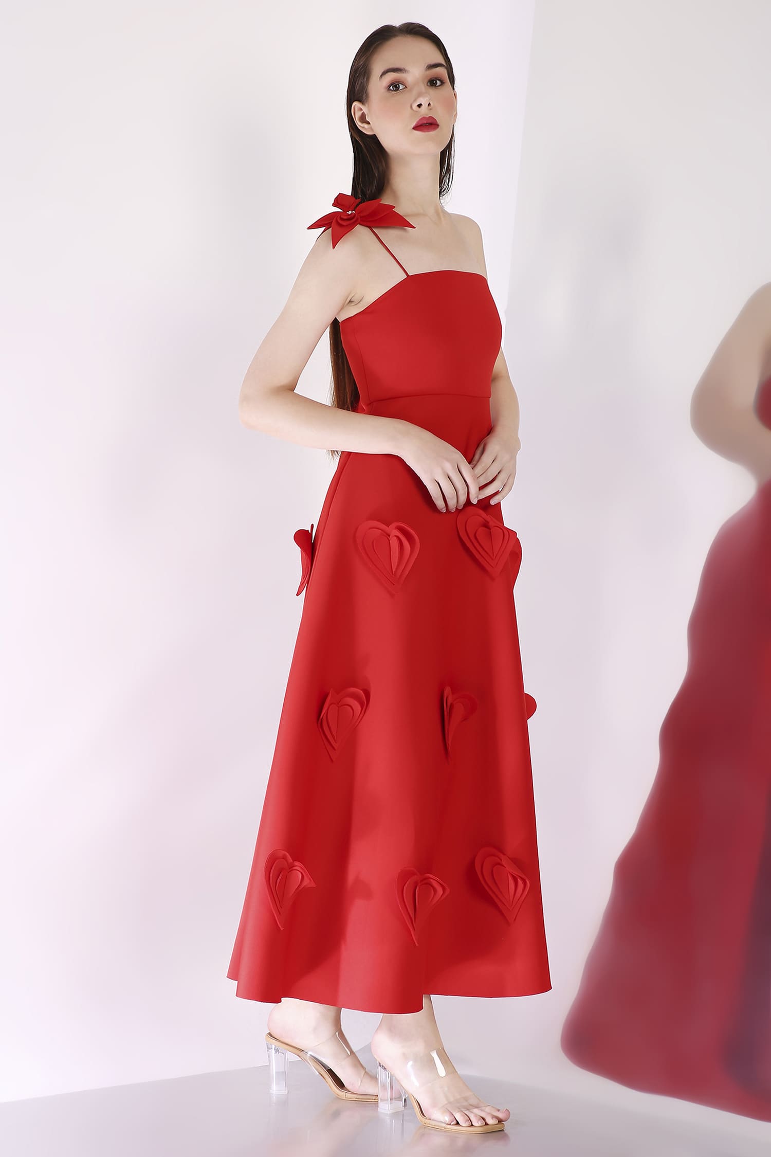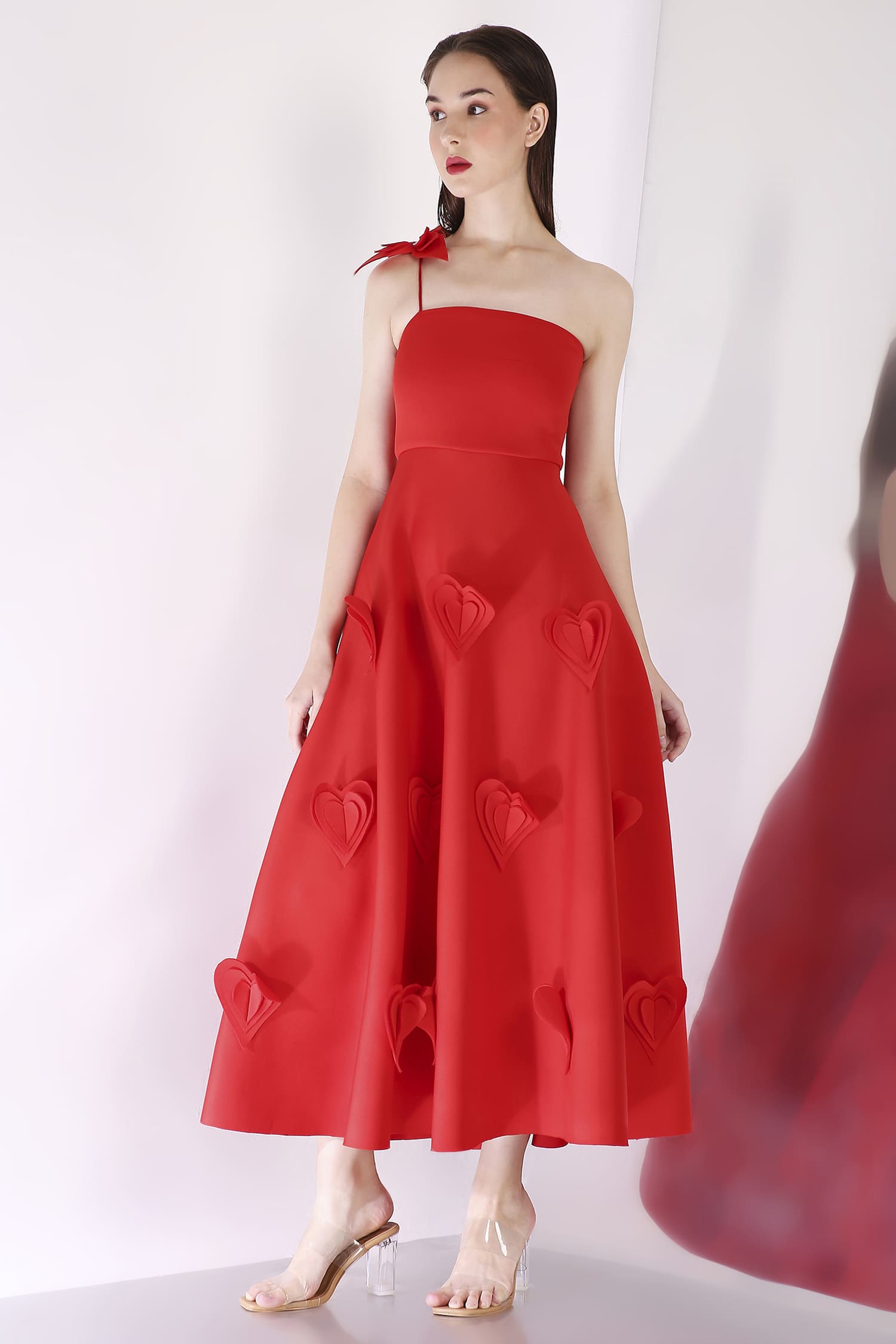 A mid-calf dress featuring heart-shaped 3D appliqués for a textured, romantic look, with a single shoulder strap adorned with a delicate flower motif.