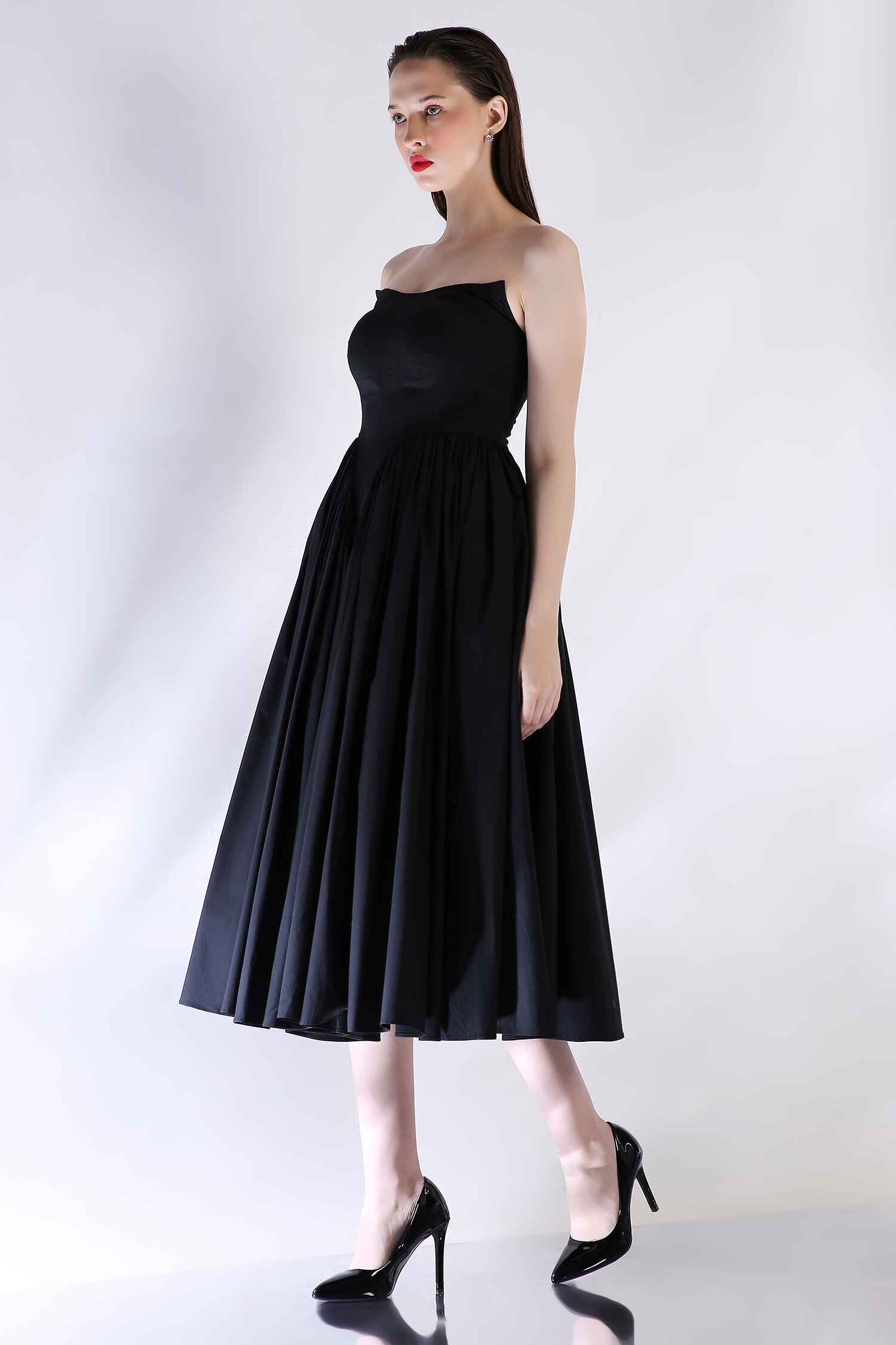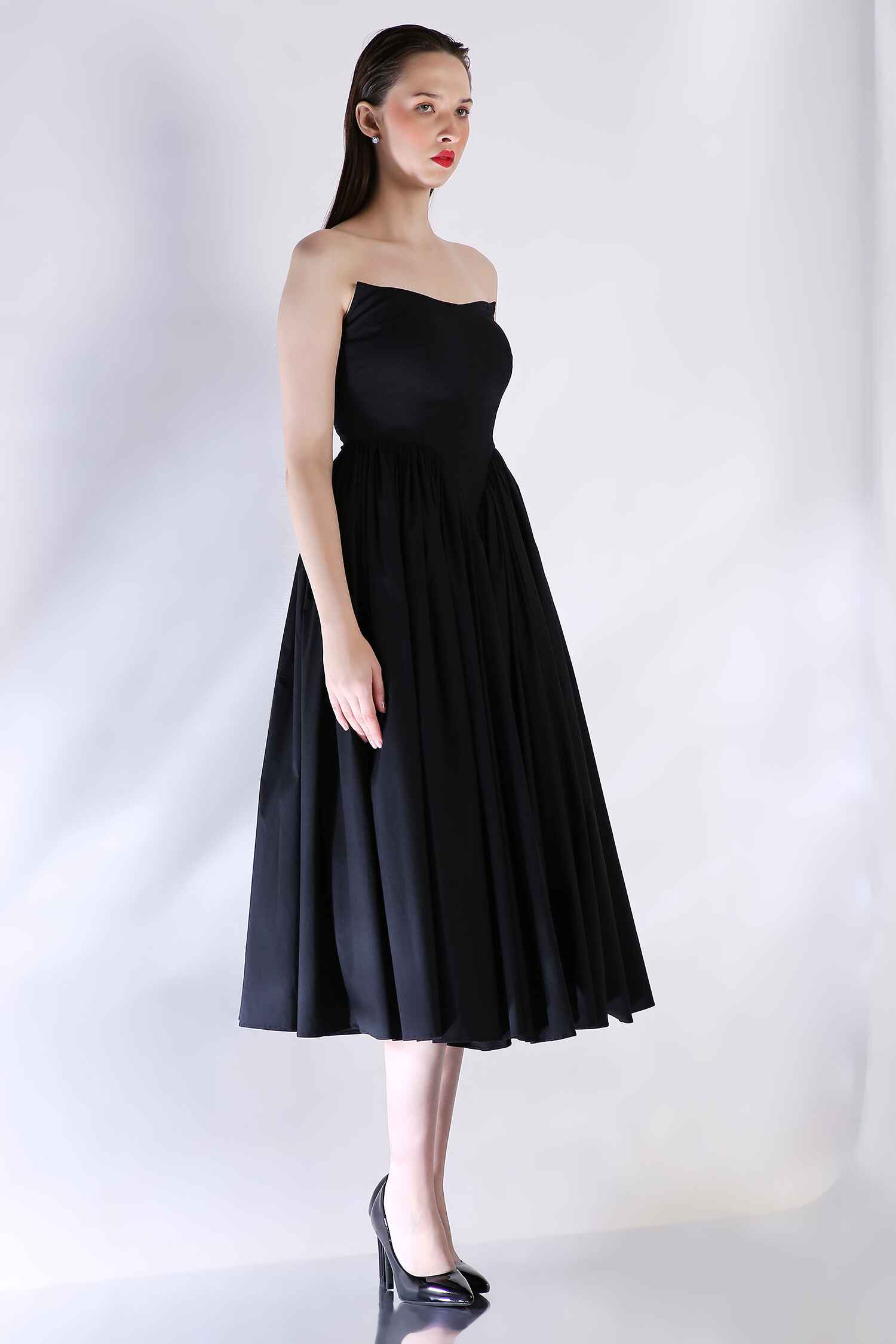 Step into sophistication with our black mid-calf length dress, designed with a gathered waistline that enhances your figure. This classic piece flows elegantly, making it an ideal choice for both casual outings and special events.