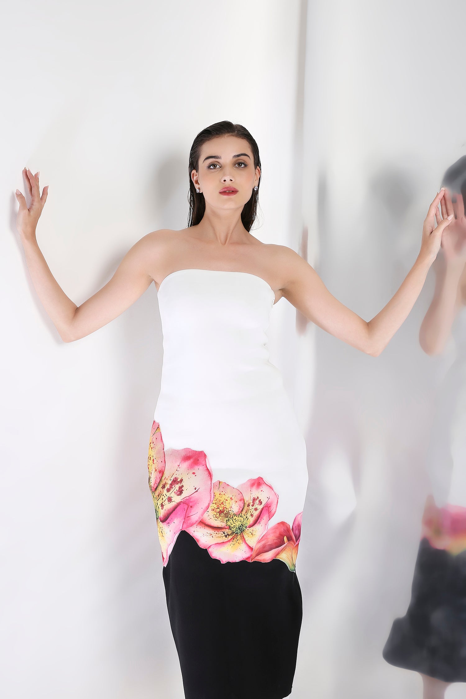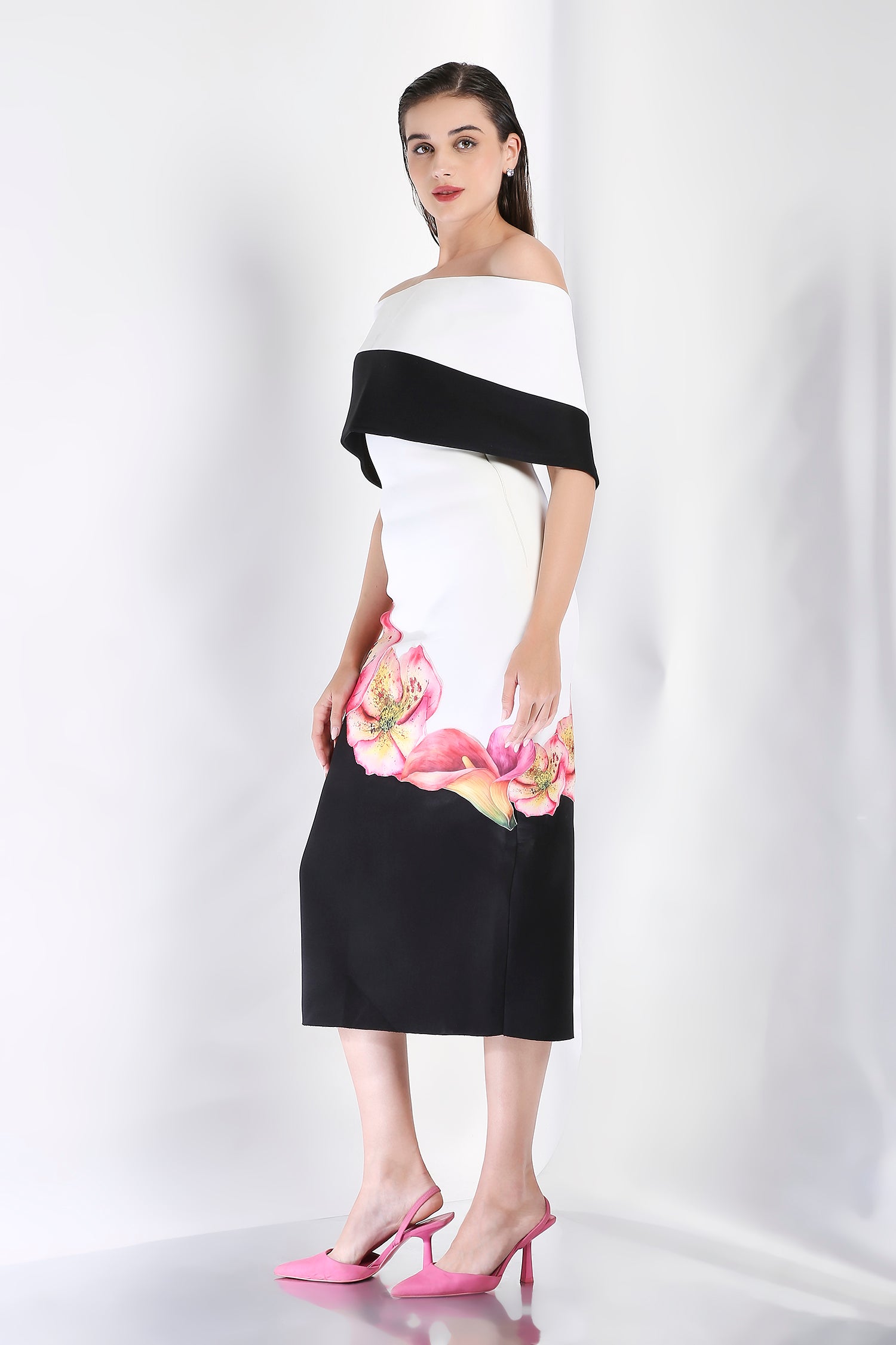 Meet the evolution of elegance. The Tulip Dress returns with a versatile detachable wrap overlay that softly frames the shoulders in bold contrast. Crafted in structured scuba, the black and white base seamlessly curves around a hand-patched tulip bloom that blossoms across the hips.