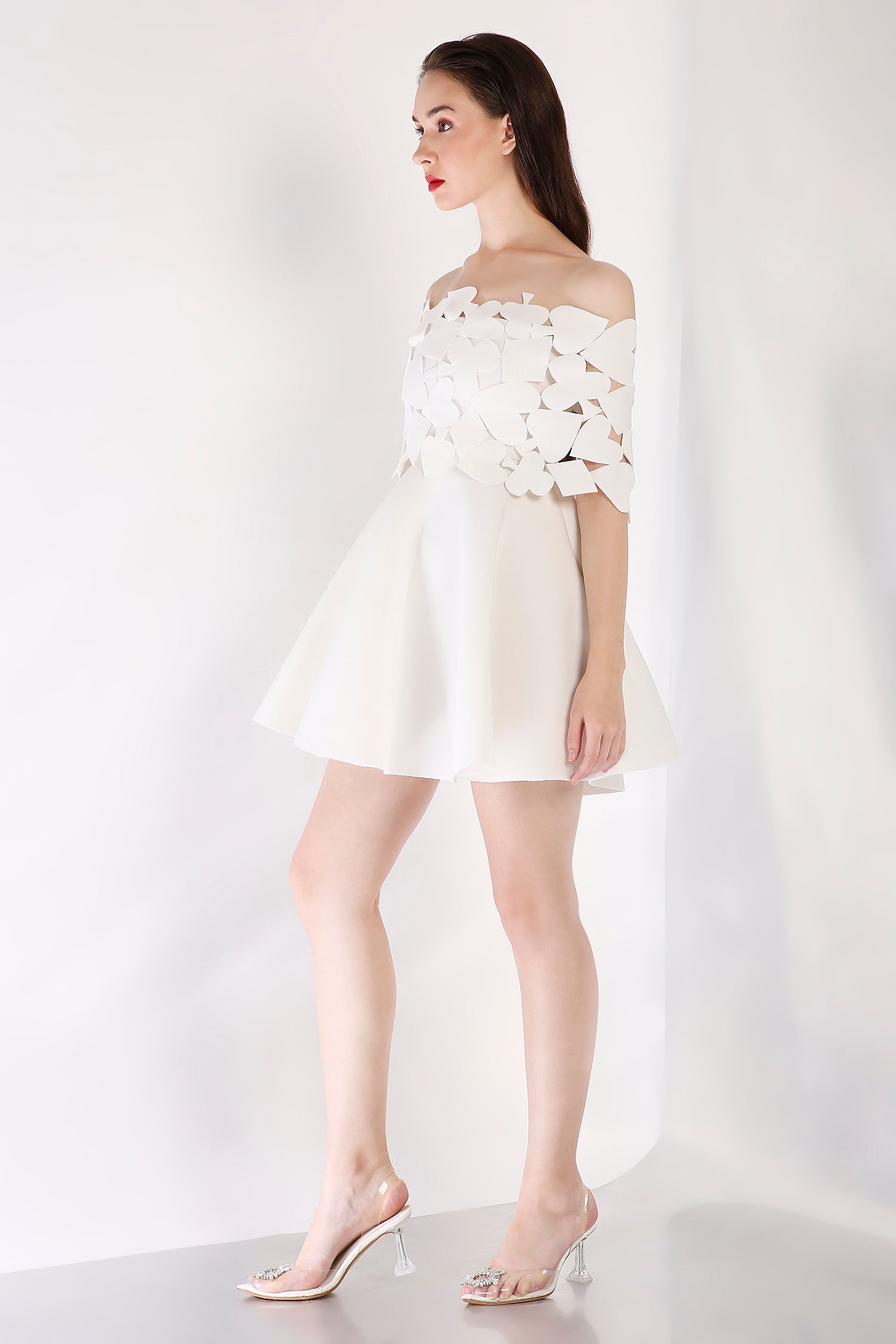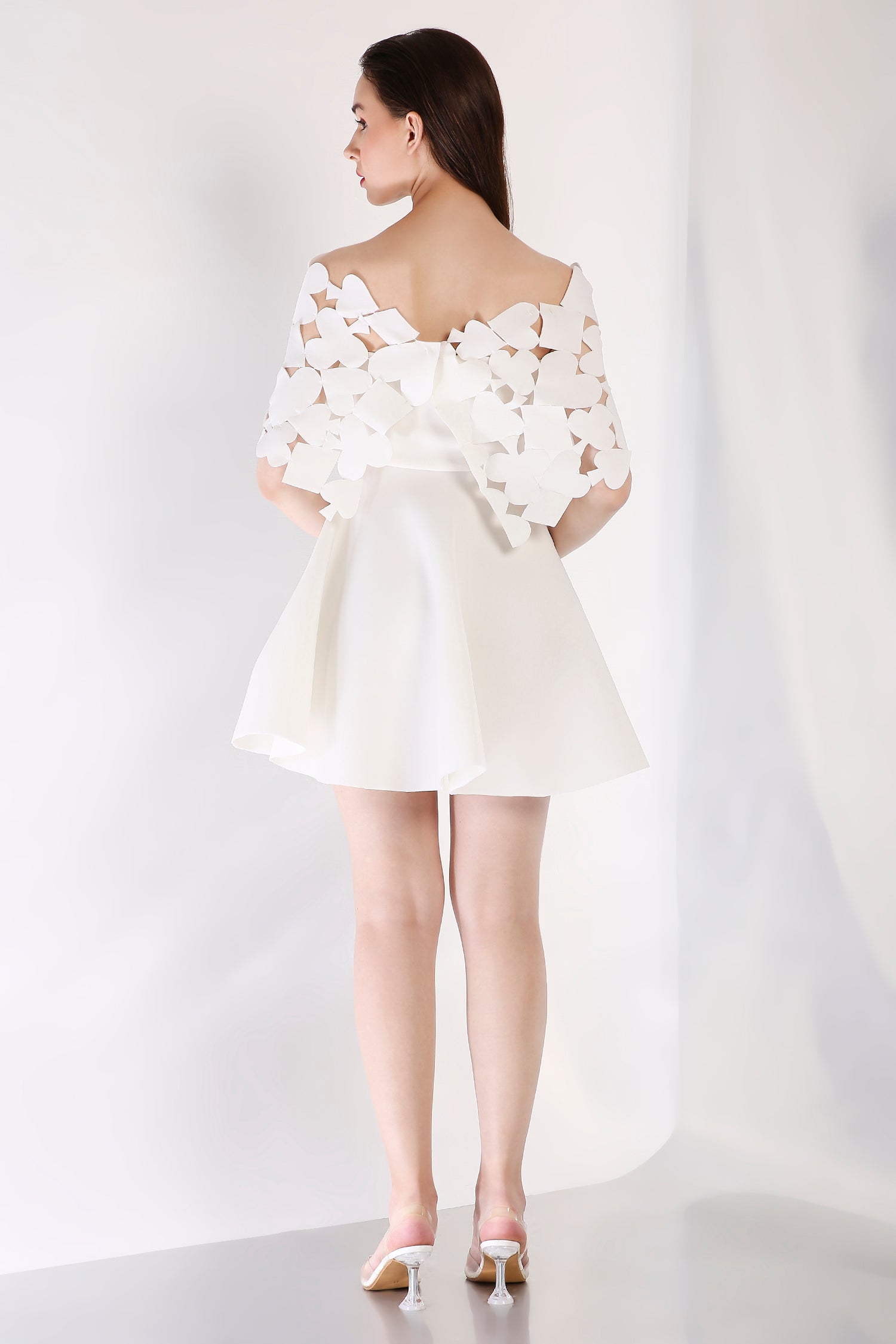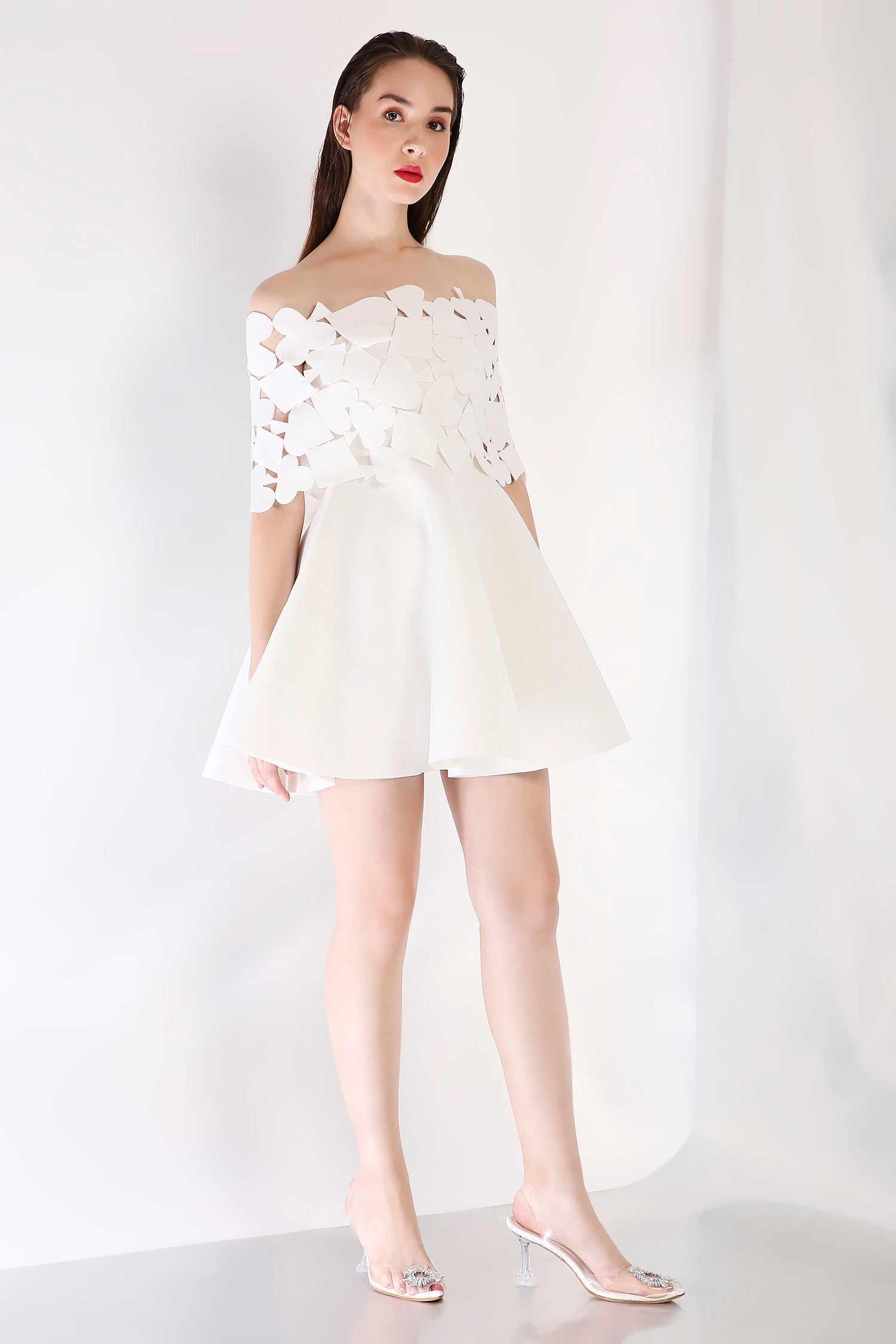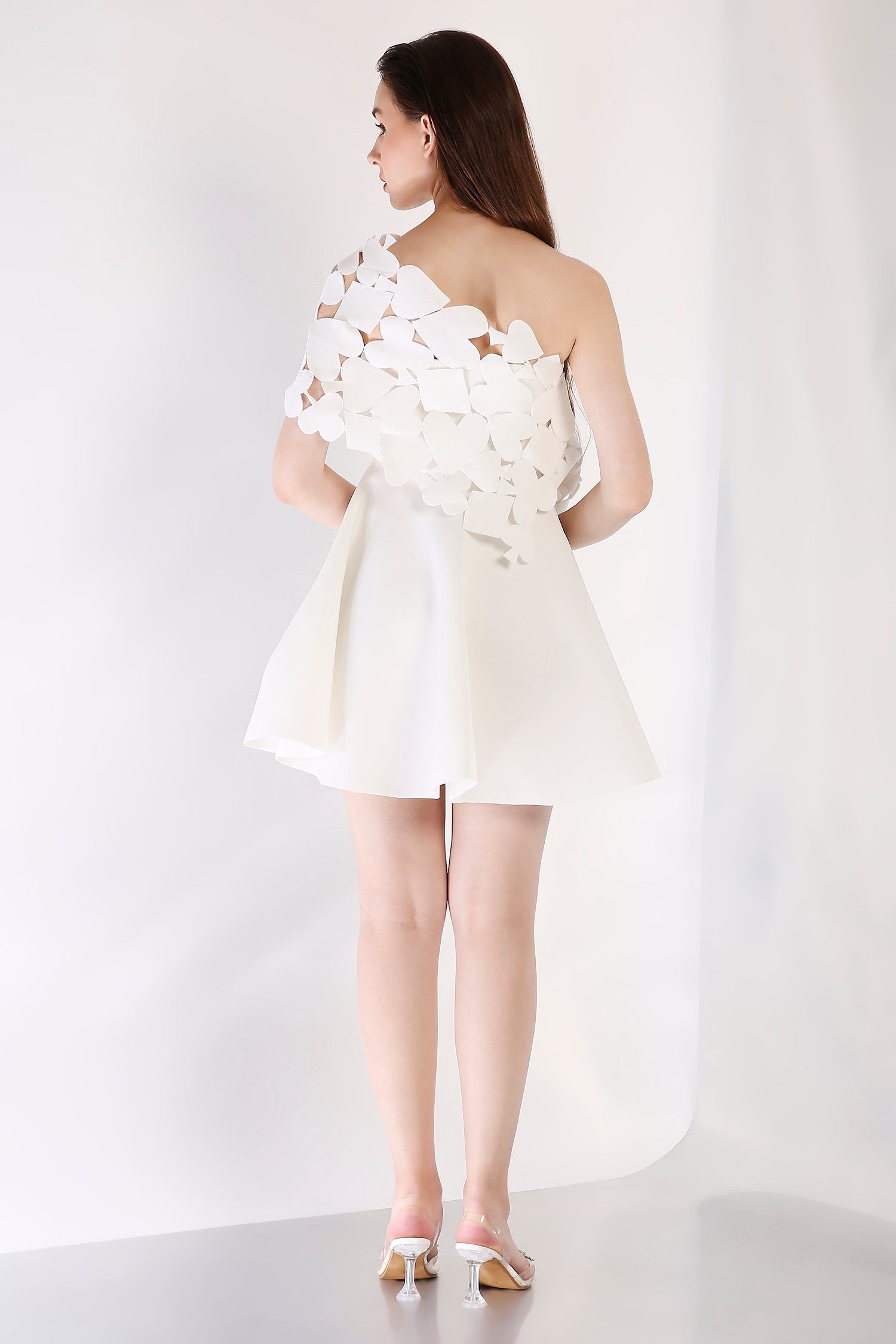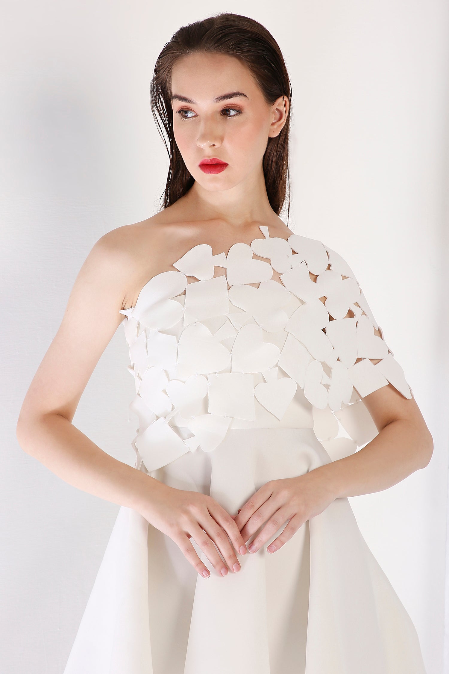 Designed for the modern muse, this strapless fit-and-flare short dress is paired with a sculptural ace cutout wrap. The versatile design allows for styling in both one-shoulder and off-shoulder variations, creating a bold yet elegant statement.