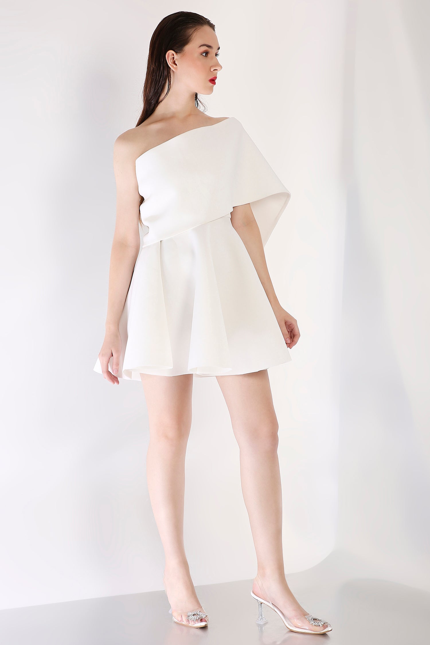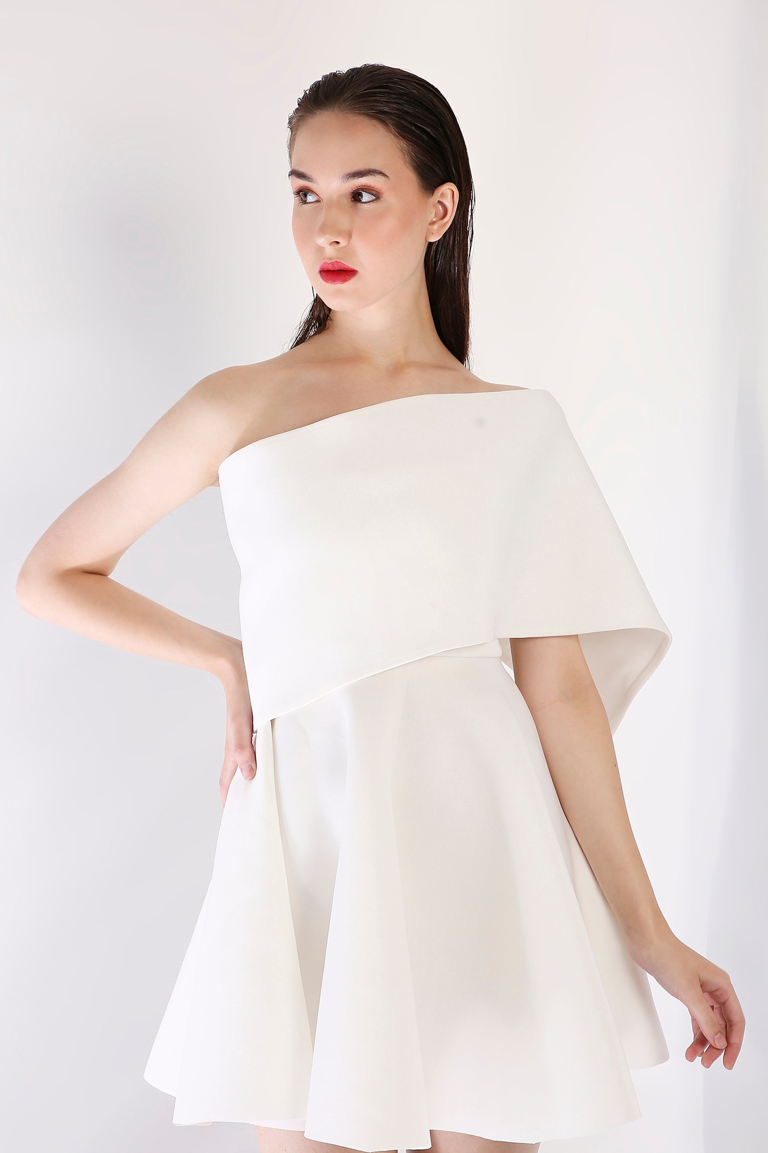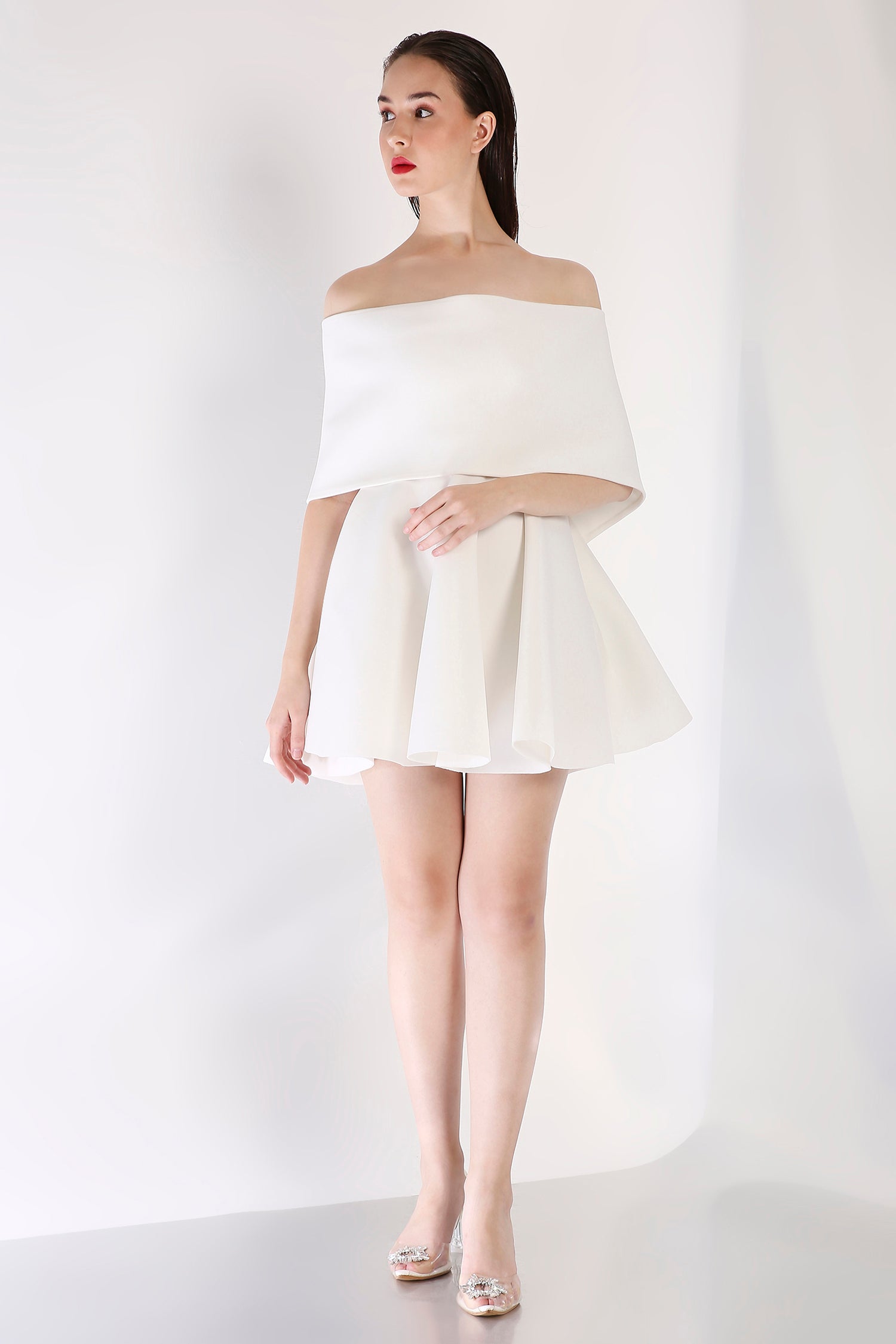 A refined take on timeless elegance, this strapless fit-and-flare short dress is paired with a versatile classic wrap. Designed to be styled both one-shoulder and off-shoulder, this ensemble transitions seamlessly from day to evening with effortless grace.