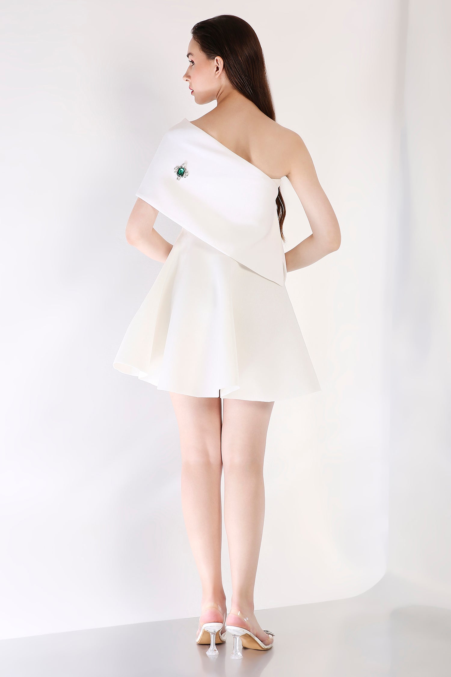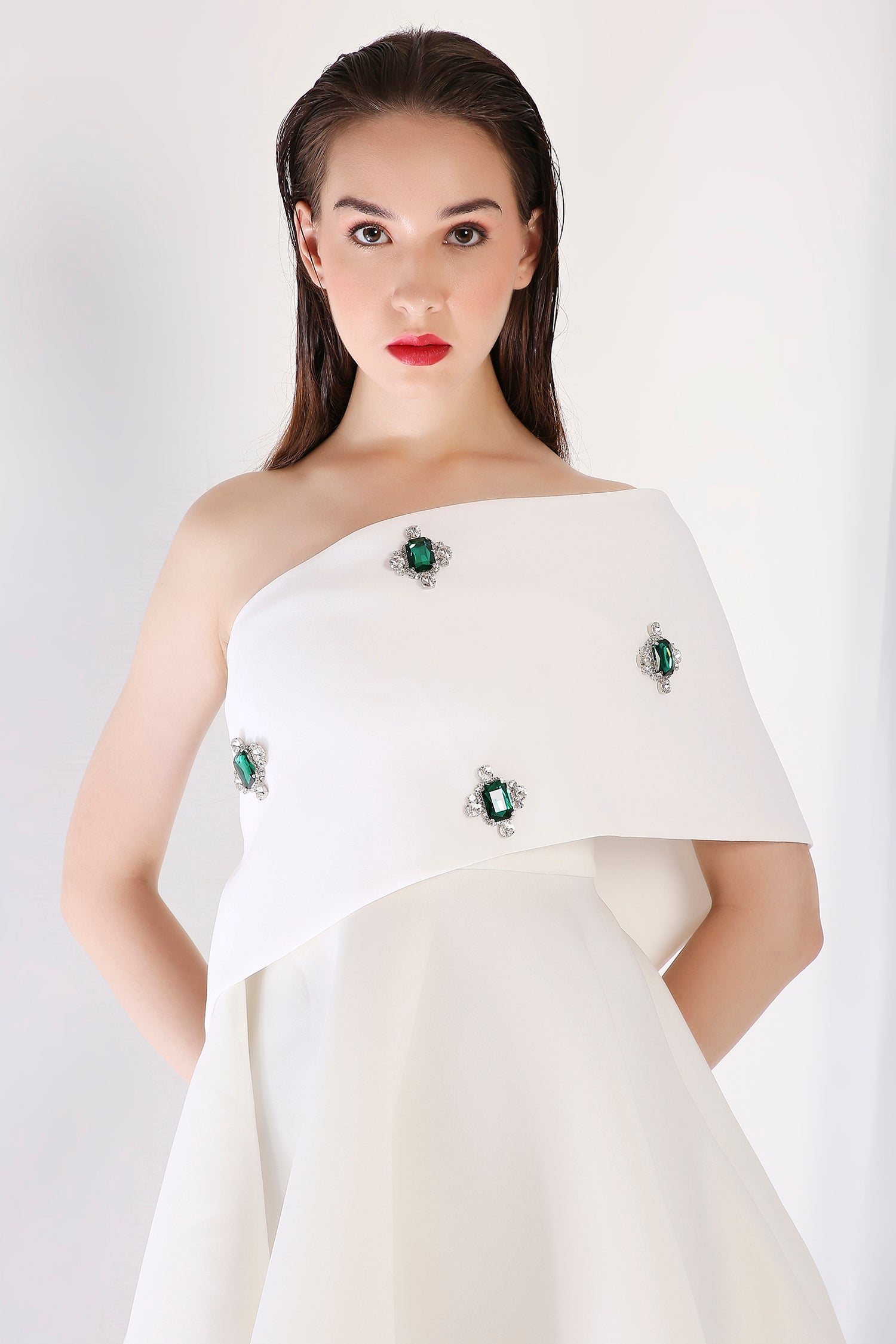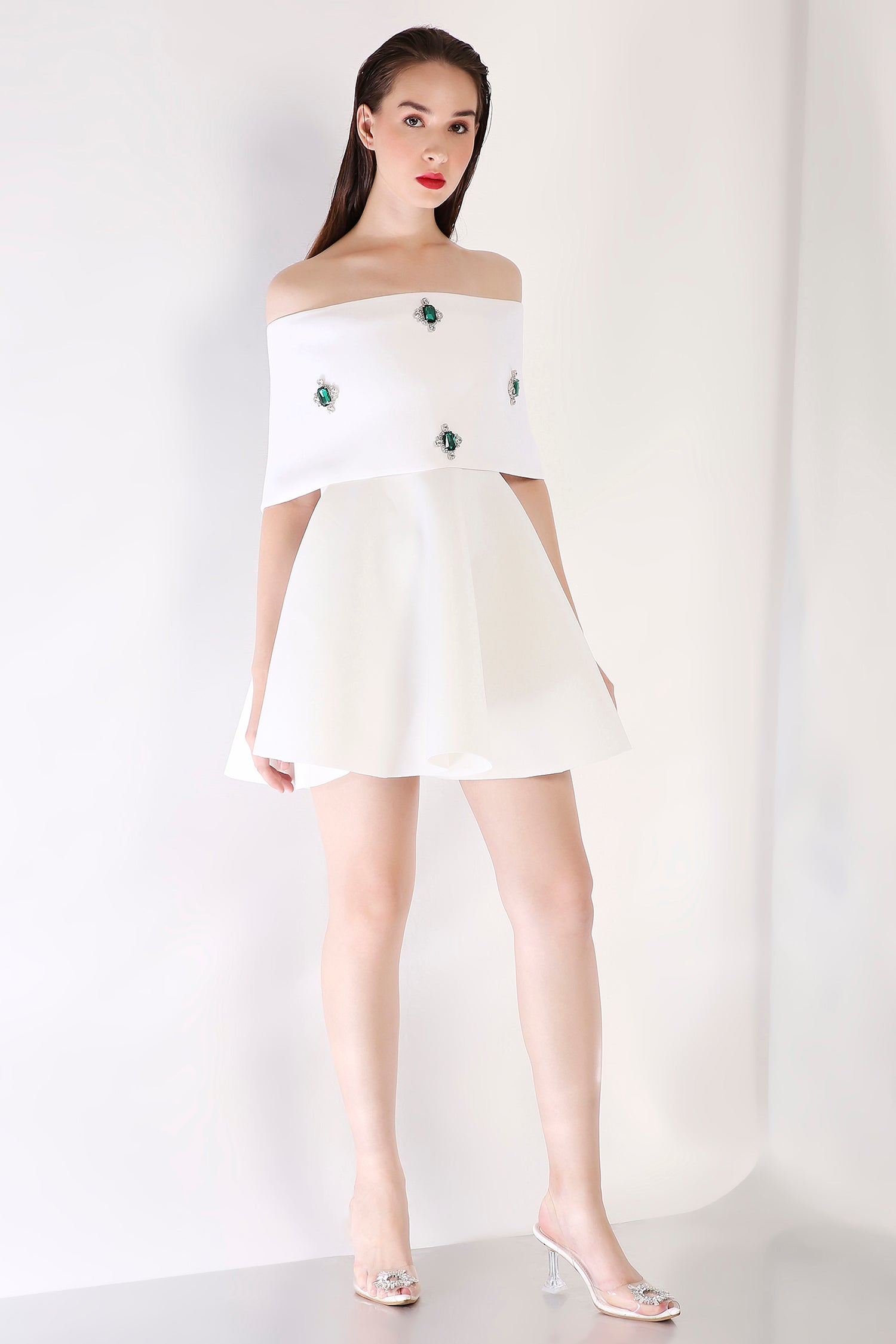 Elevate your look with this strapless fit-and-flare short dress, adorned with an emerald-studded wrap. Designed for versatility, the wrap can be worn one-shoulder or off-shoulder, lending a regal touch to this refined ensemble.