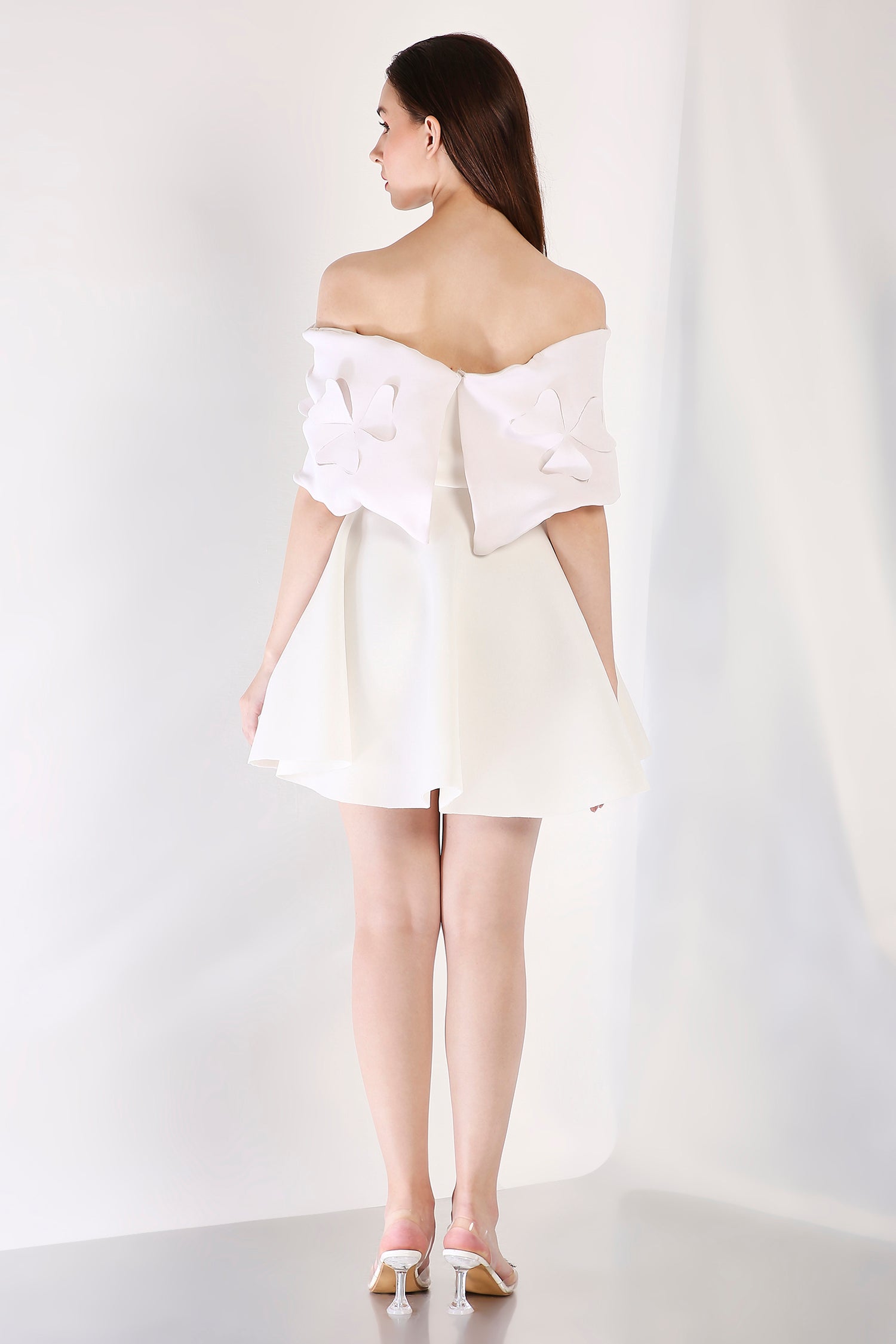 Sleek and sophisticated, this strapless fit-and-flare short dress is enhanced by a lyre cutout wrap. With the option to wear it one-shoulder or off-shoulder, this ensemble is a statement in modern elegance.