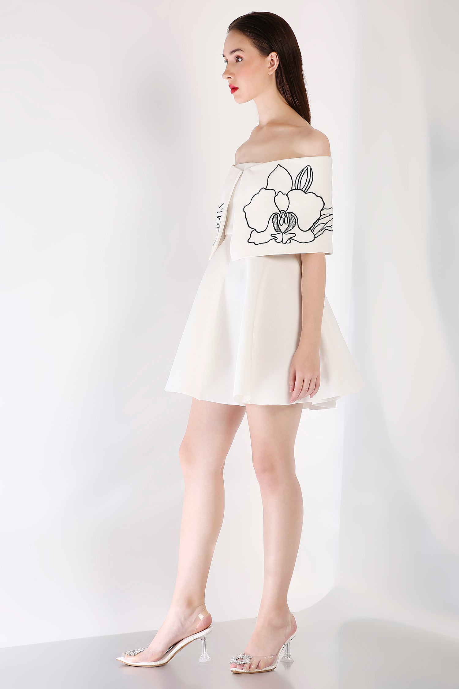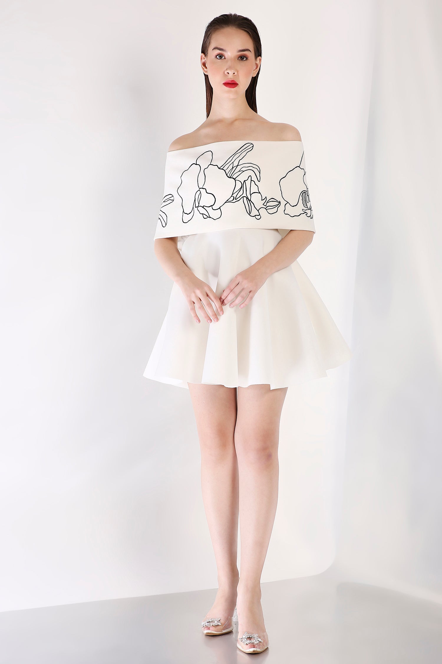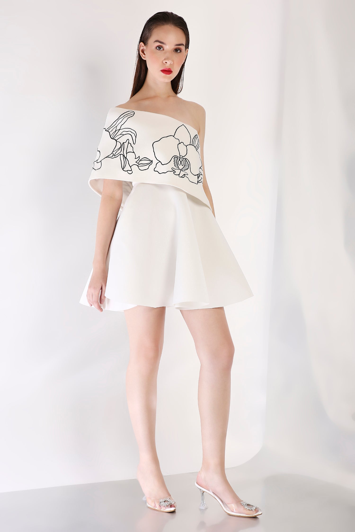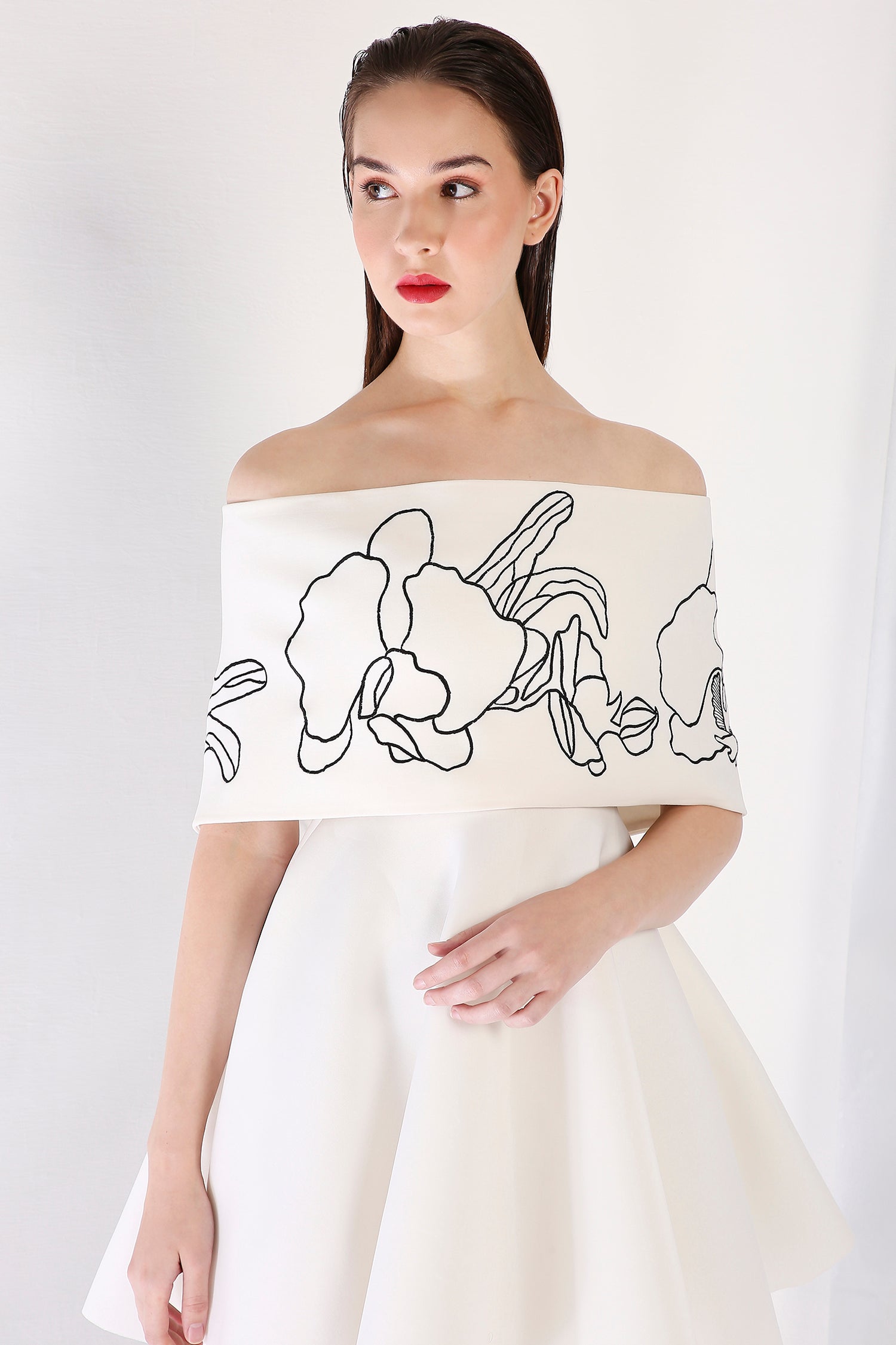 Intricately detailed, this strapless fit-and-flare short dress is complemented by a Vero embroidered wrap. Designed to be worn one-shoulder or off-shoulder, this ensemble strikes the perfect balance between artistry and contemporary refinement.