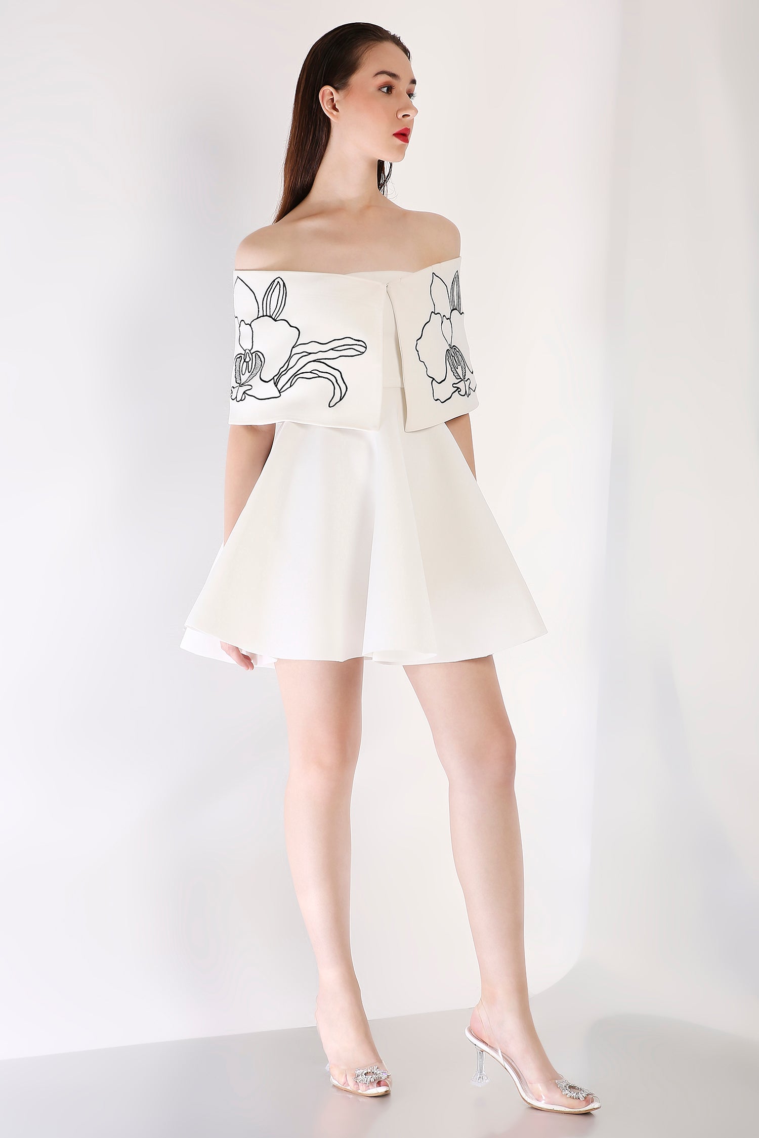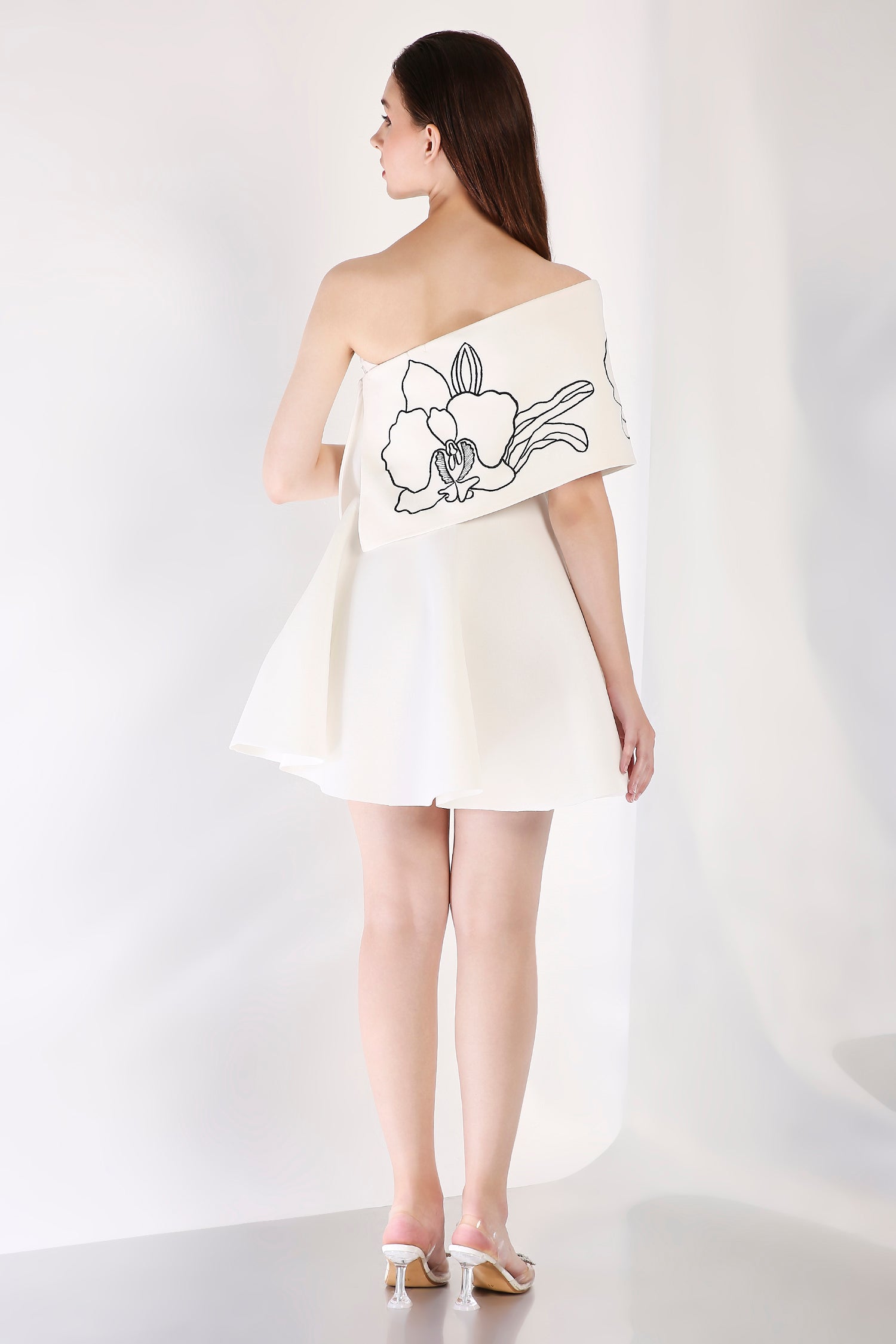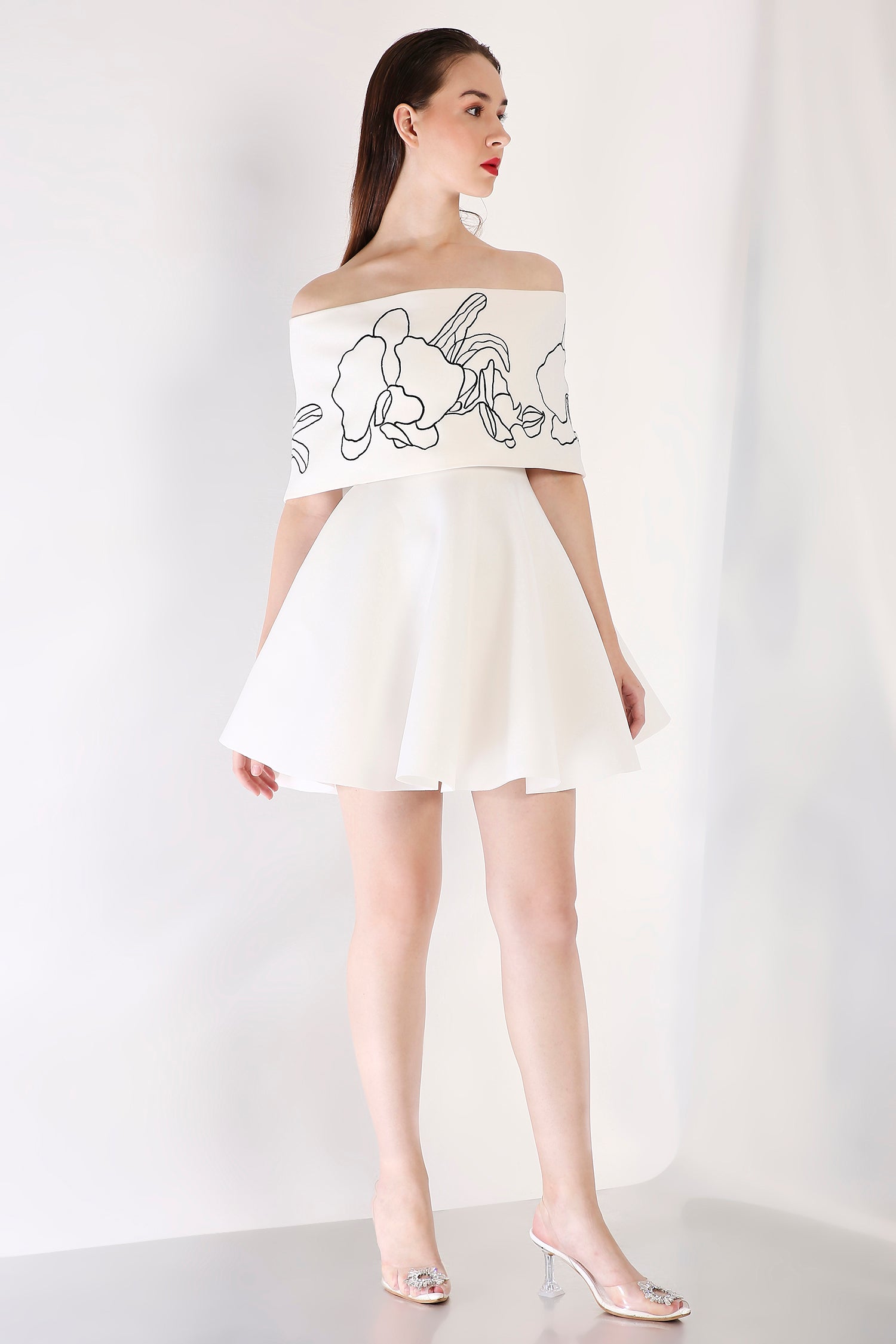 Intricately detailed, this strapless fit-and-flare short dress is complemented by a Vero embroidered wrap. Designed to be worn one-shoulder or off-shoulder, this ensemble strikes the perfect balance between artistry and contemporary refinement.
