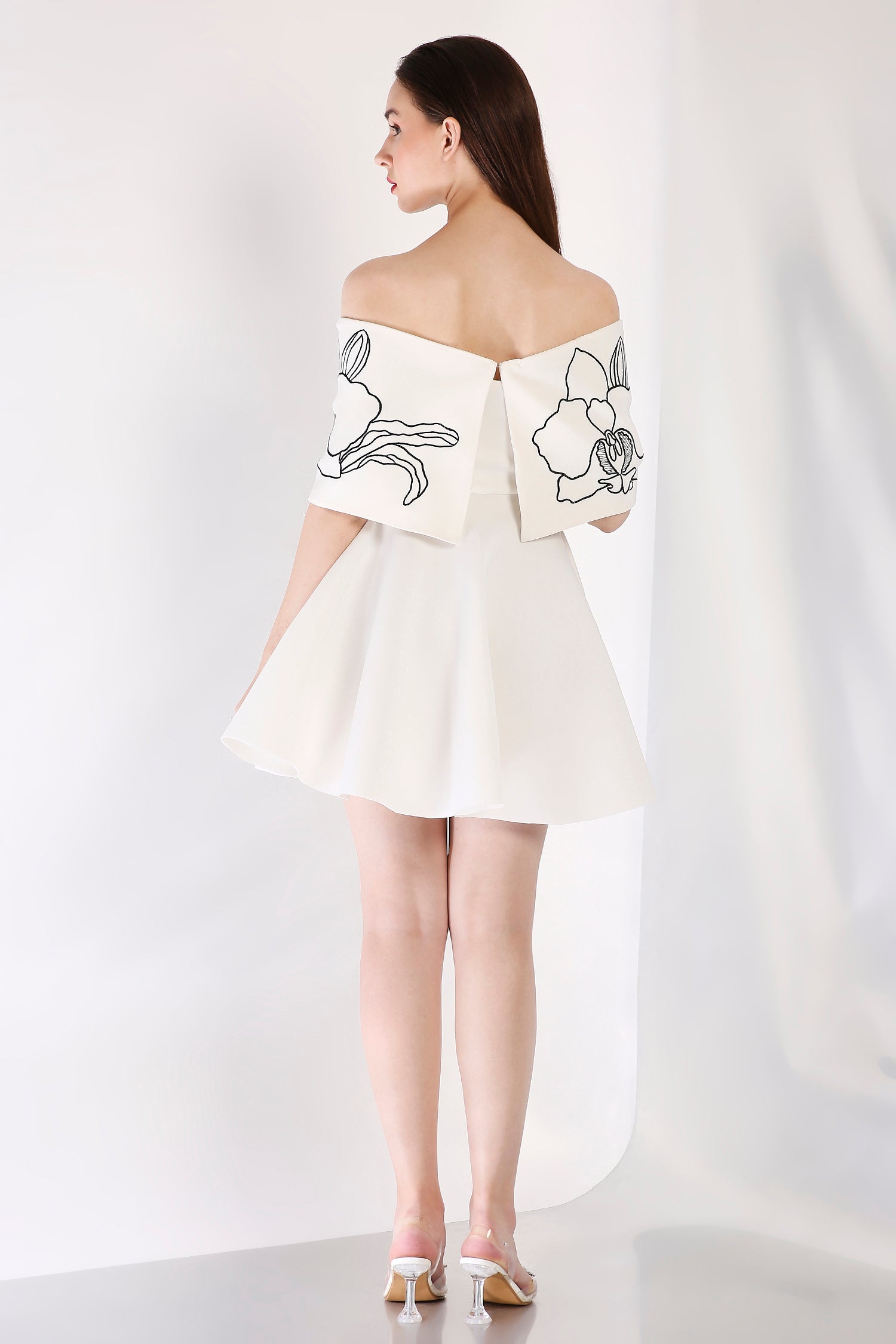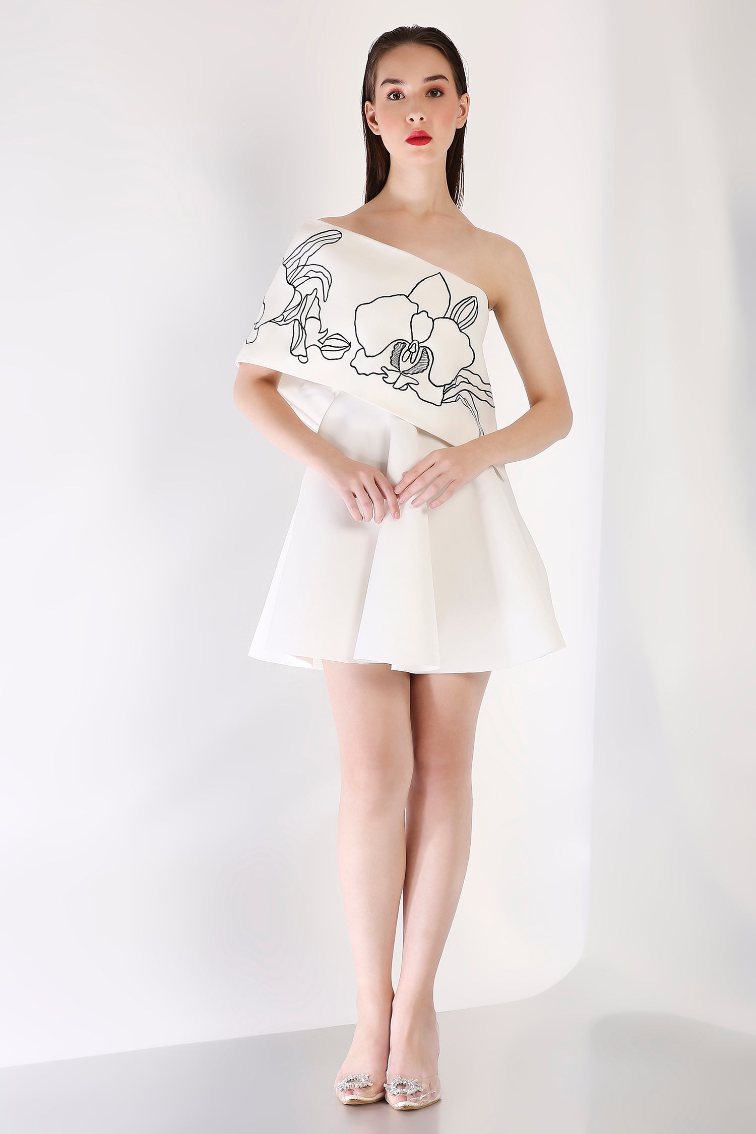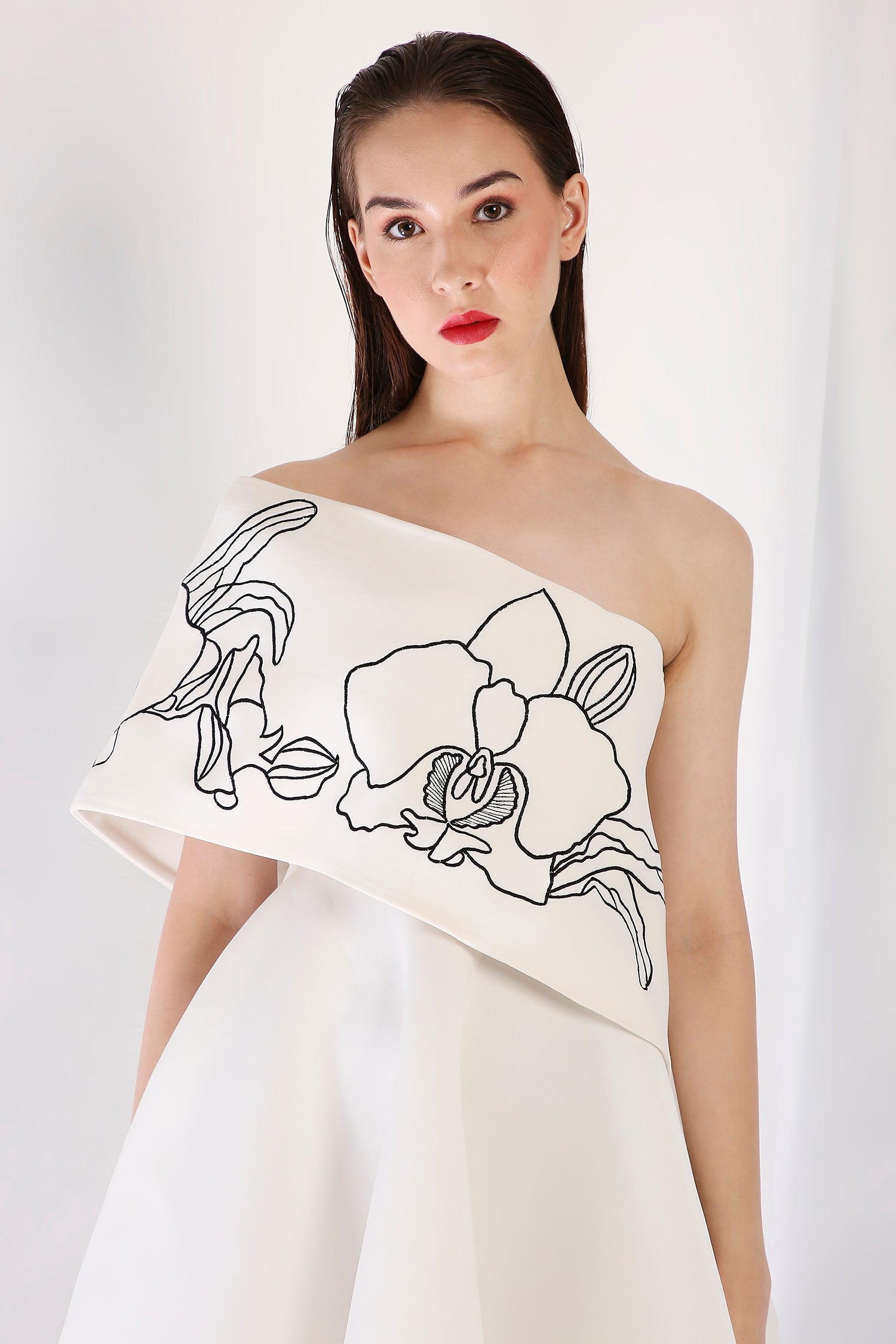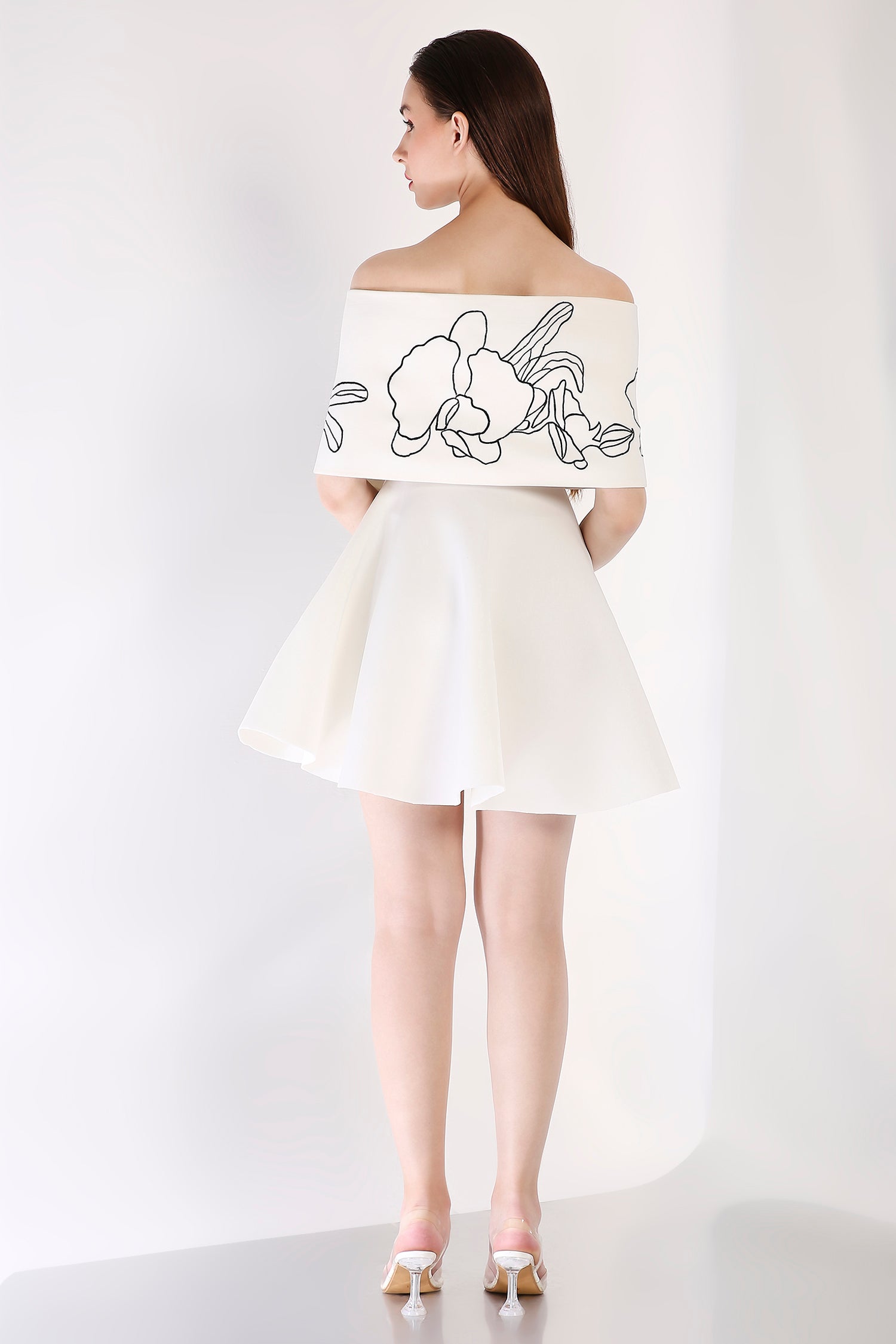 Intricately detailed, this strapless fit-and-flare short dress is complemented by a Vero embroidered wrap. Designed to be worn one-shoulder or off-shoulder, this ensemble strikes the perfect balance between artistry and contemporary refinement.