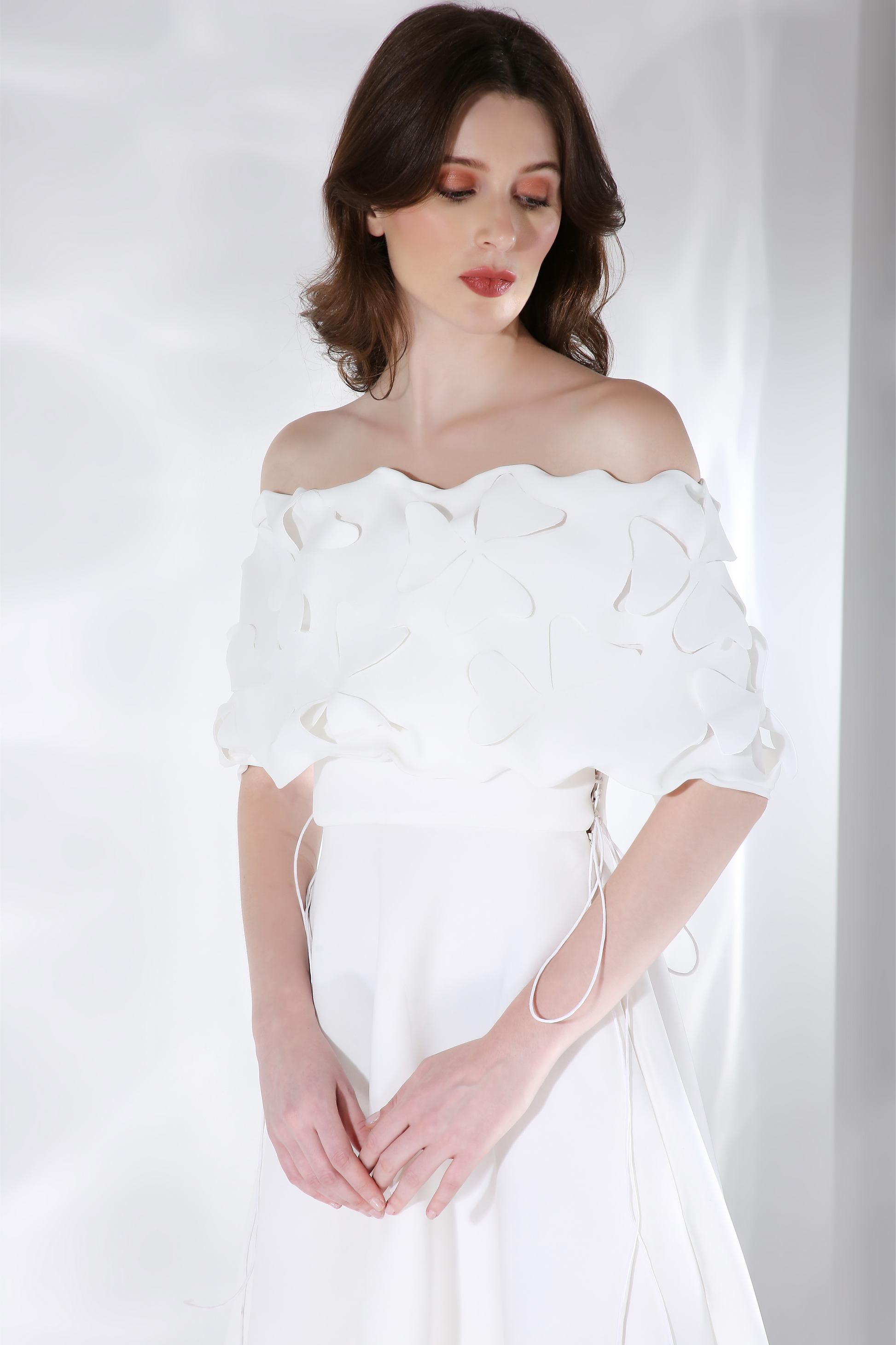 Featuring a fit and flare midi dress with floral cut-outs intricately done by hand. Wearable in two ways,