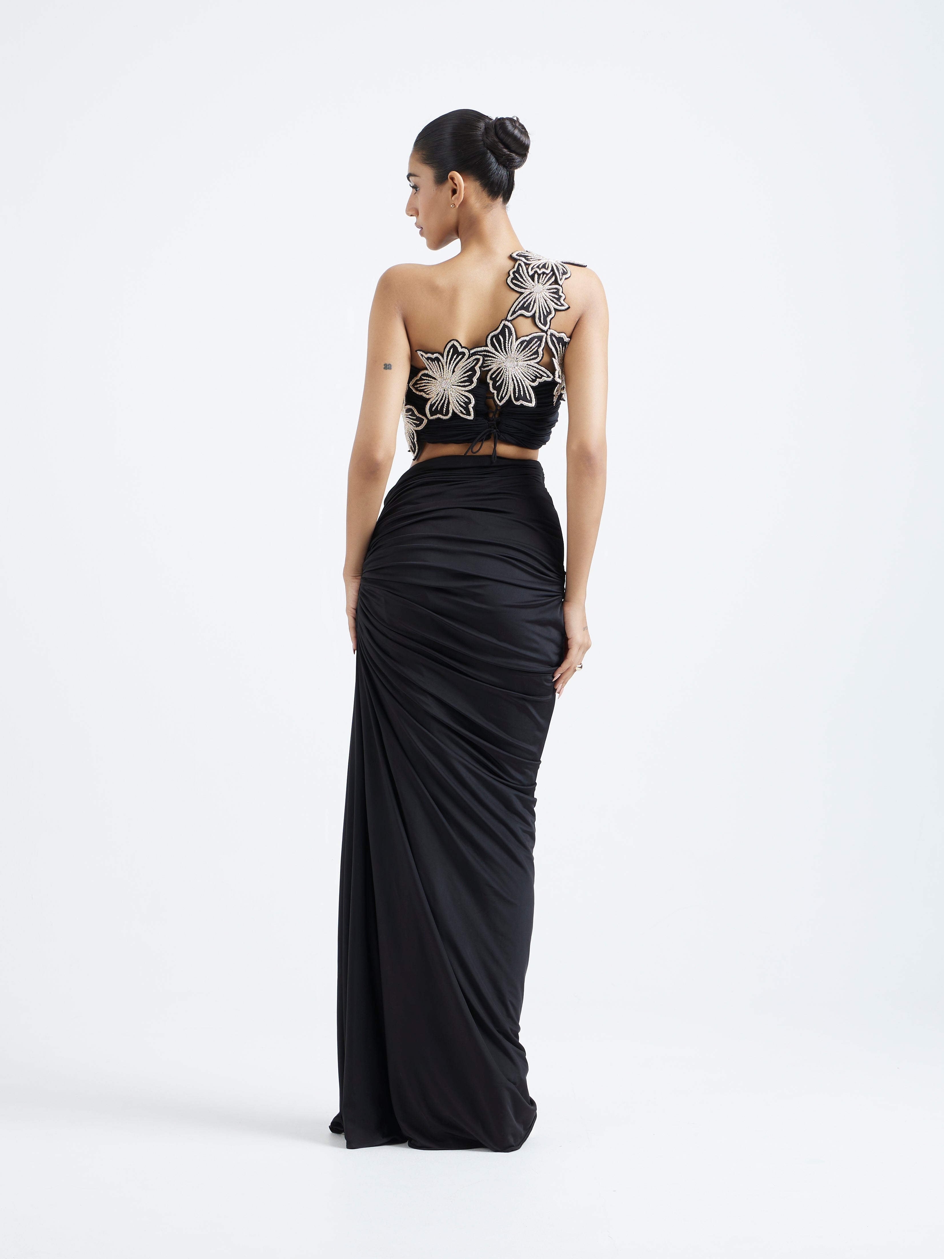 Set on a sleek scuba base, this piece is adorned with intricately hand-embroidered zardozi embroidery over florals, each motif shaped with precision and elevated with metallic detailing.