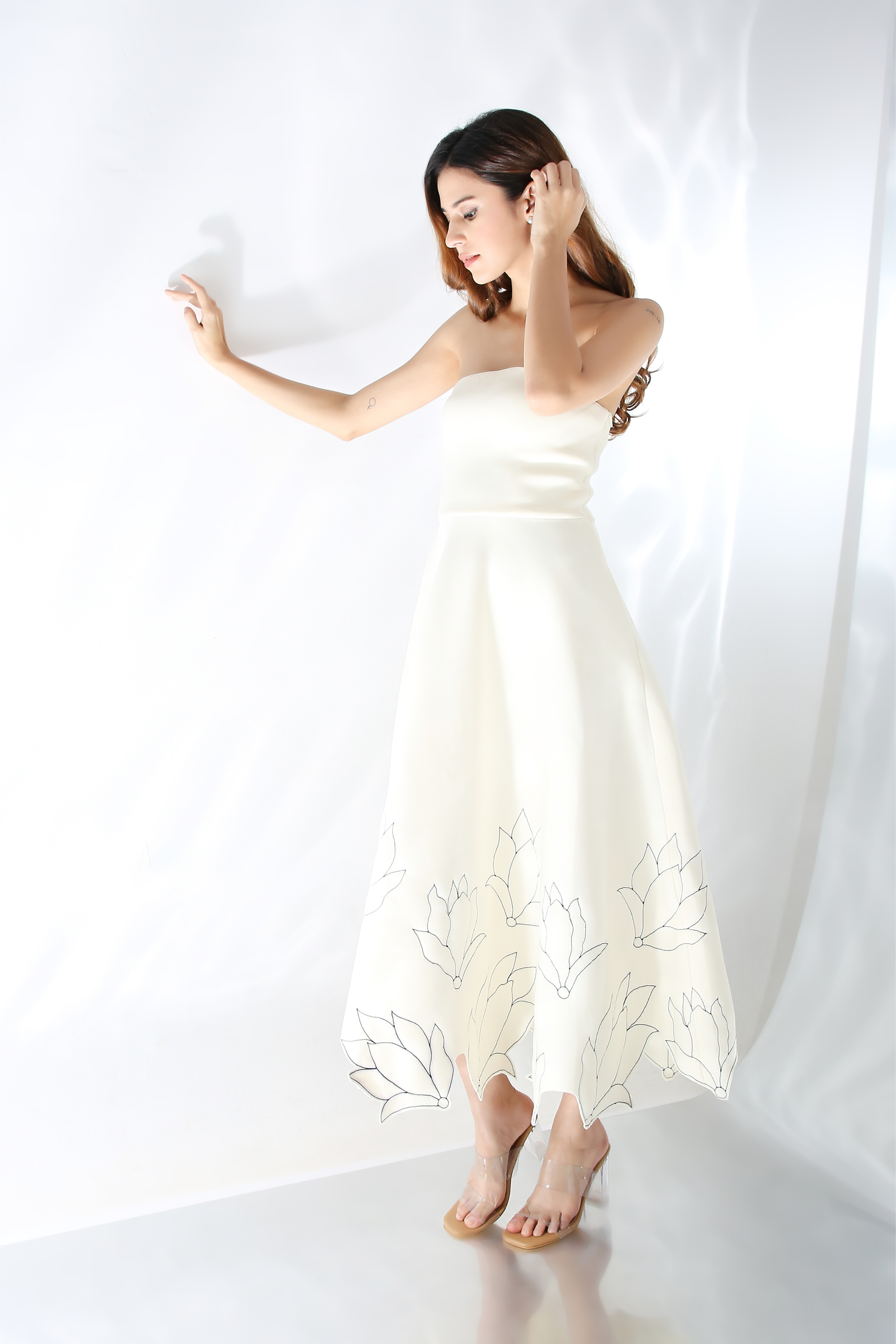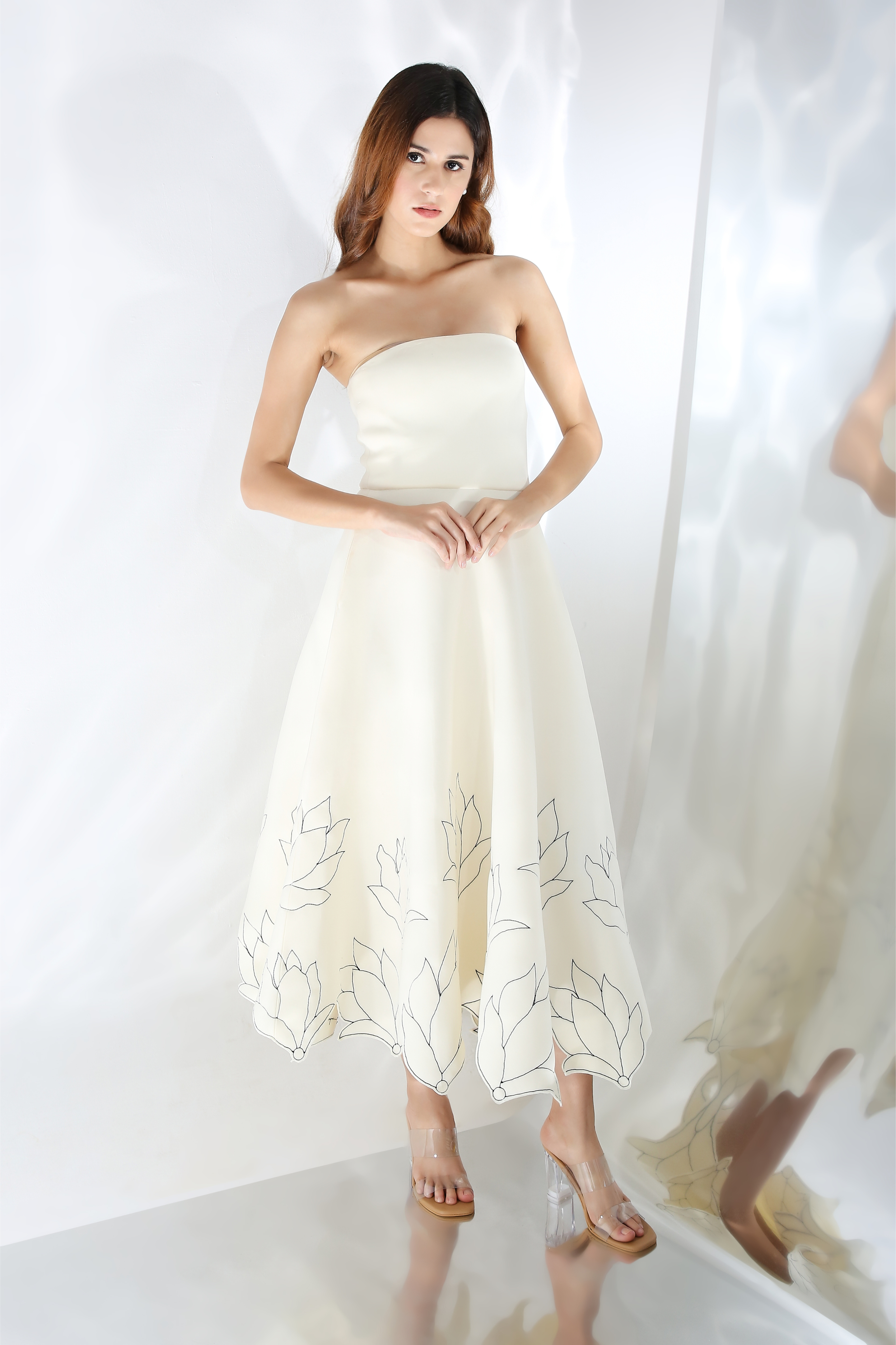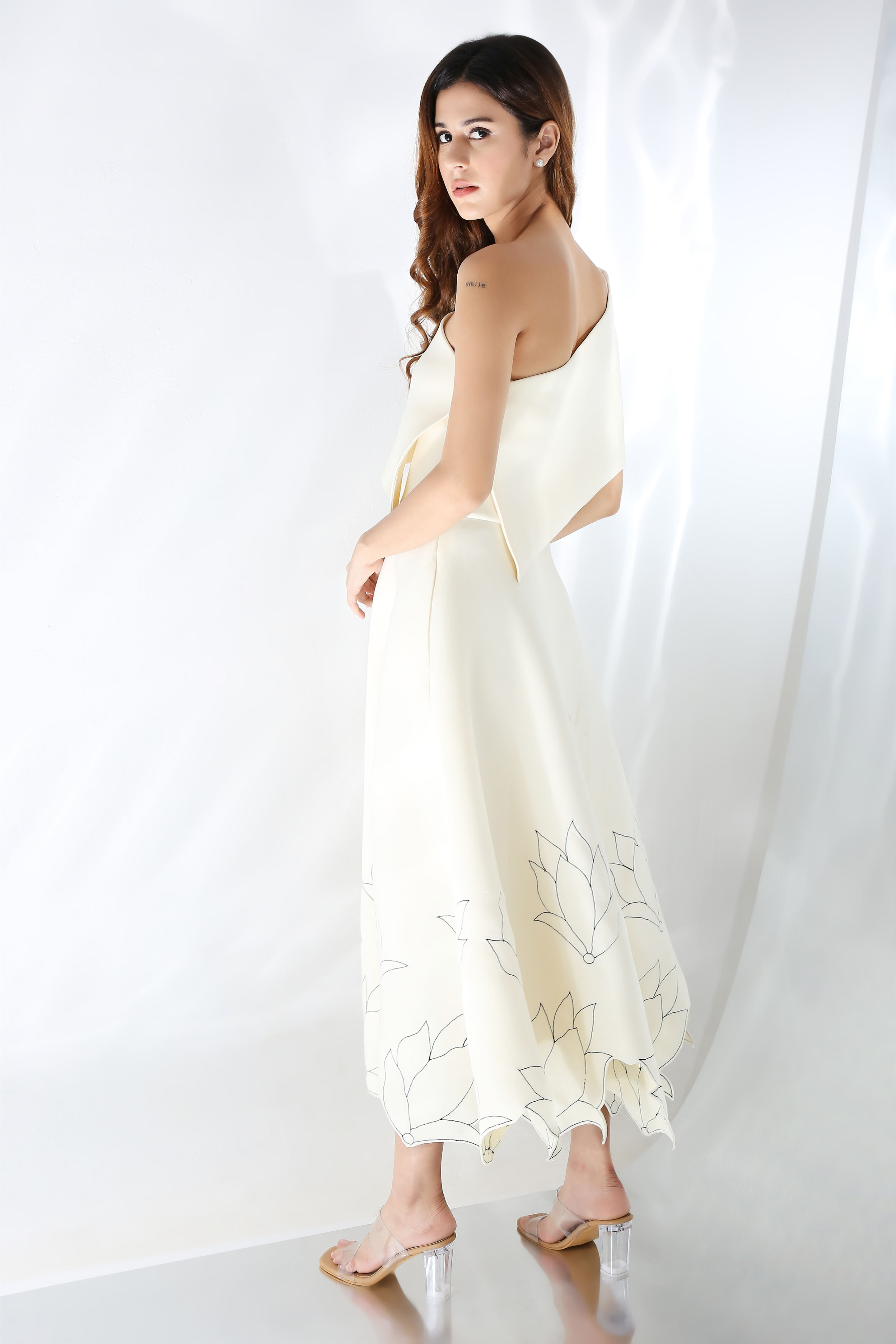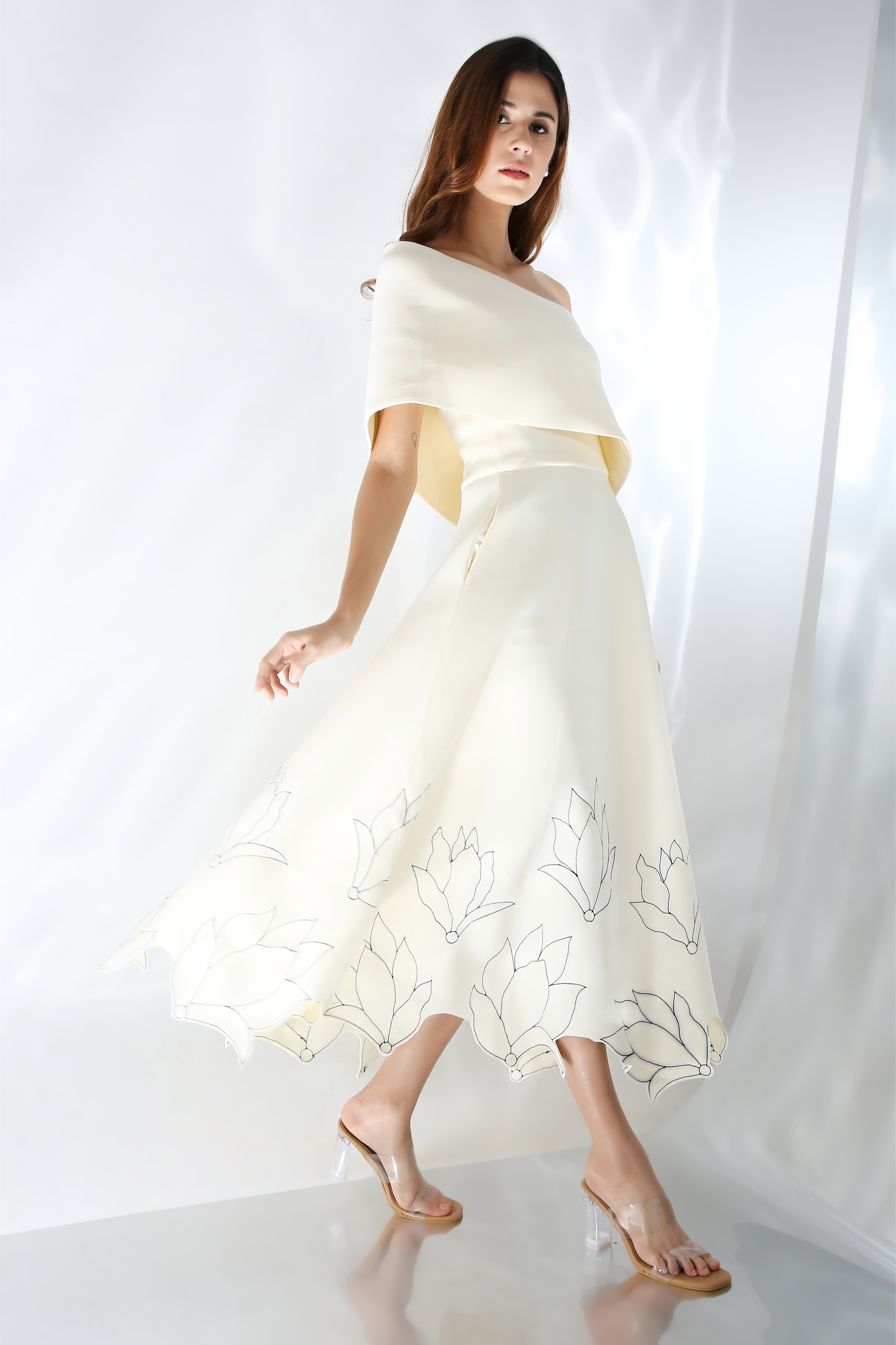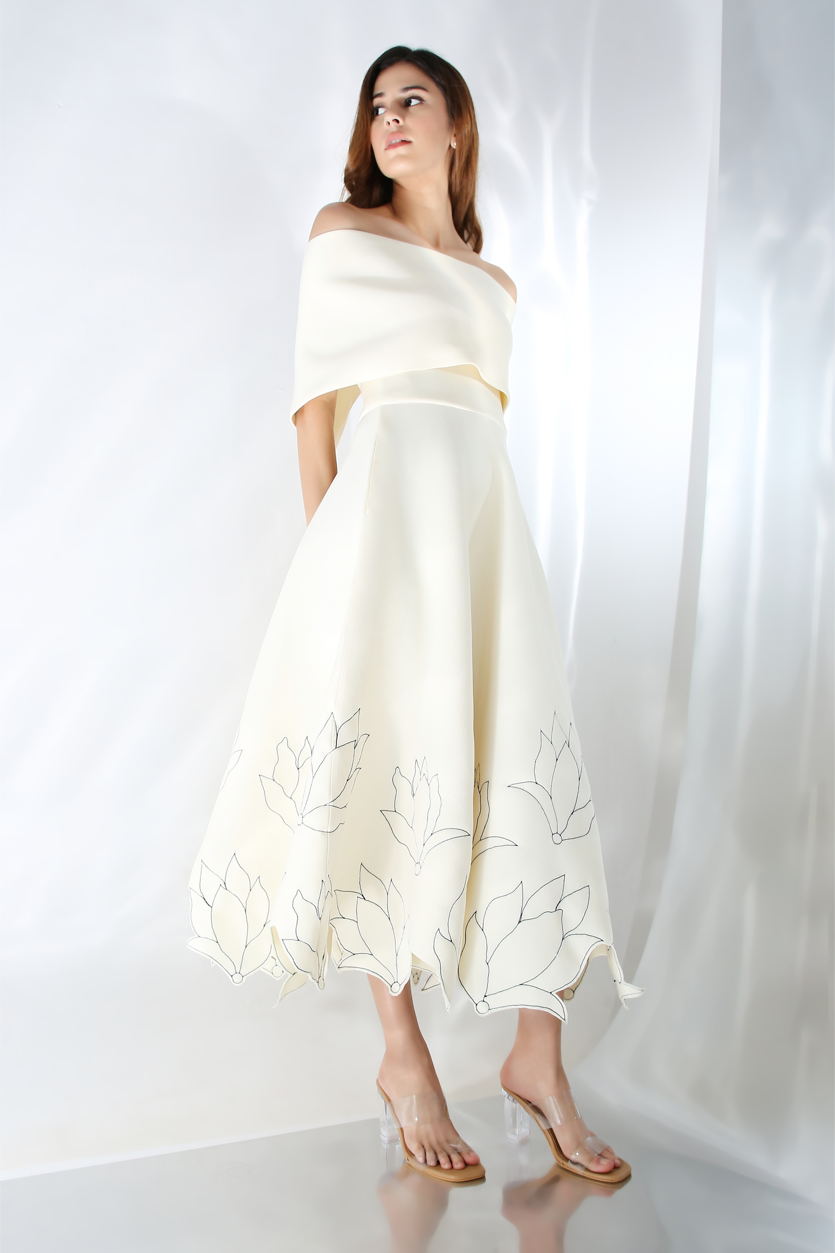 Featuring a fit and flare dress with floral hand embroidery and cutouts on the base dress. Wear it in two ways,