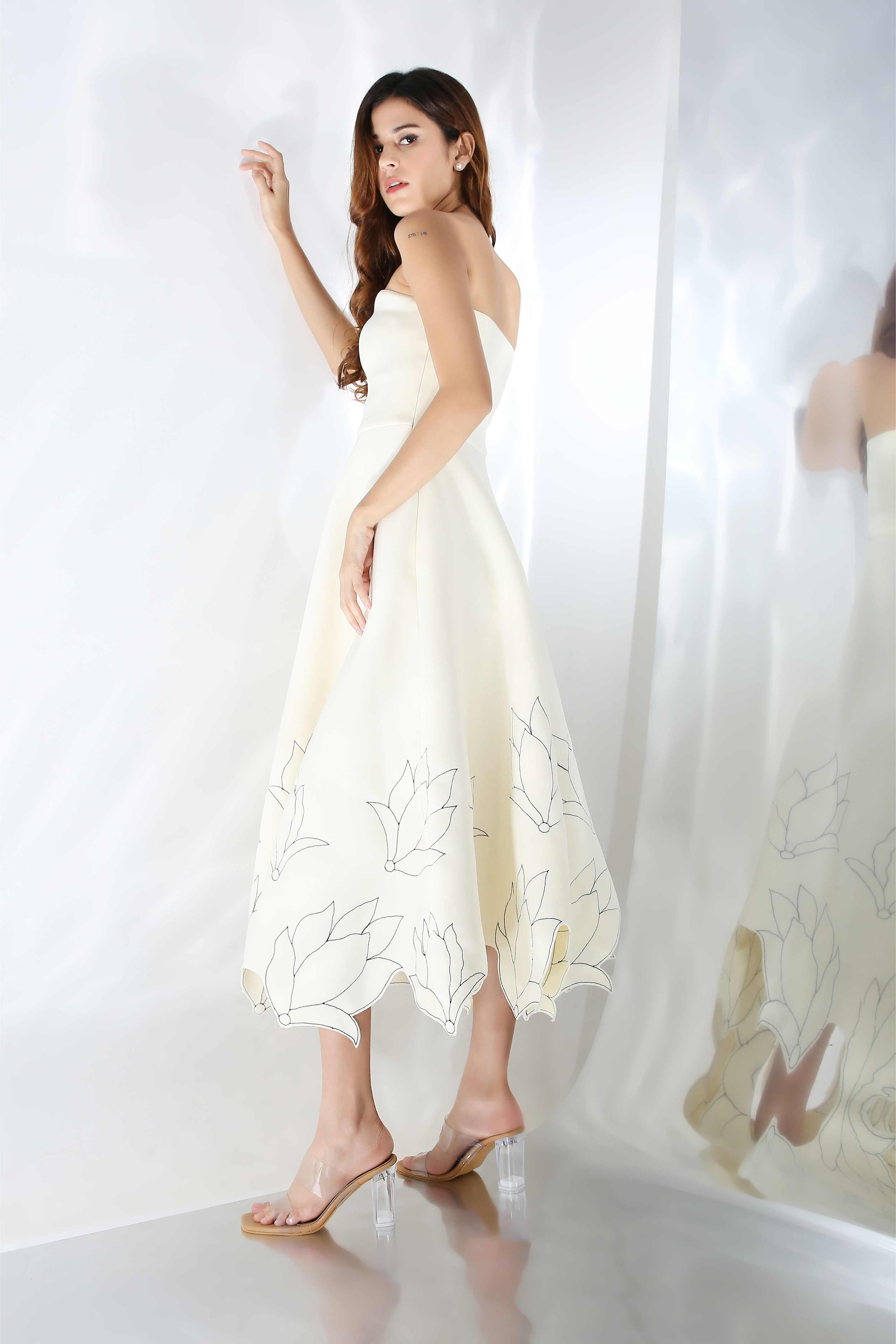 Featuring a fit and flare dress with floral hand embroidery on the base.