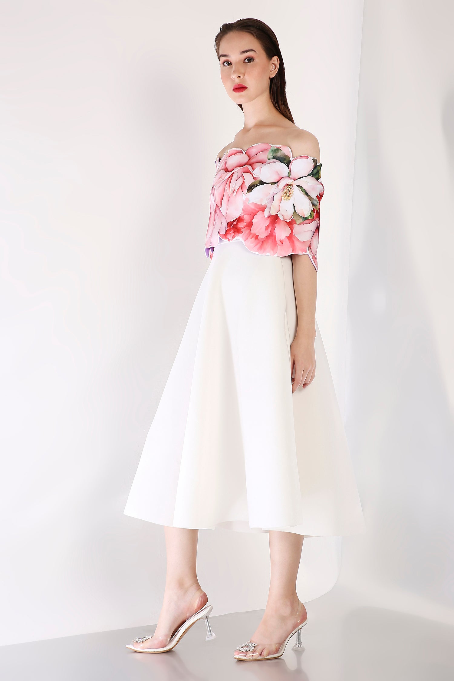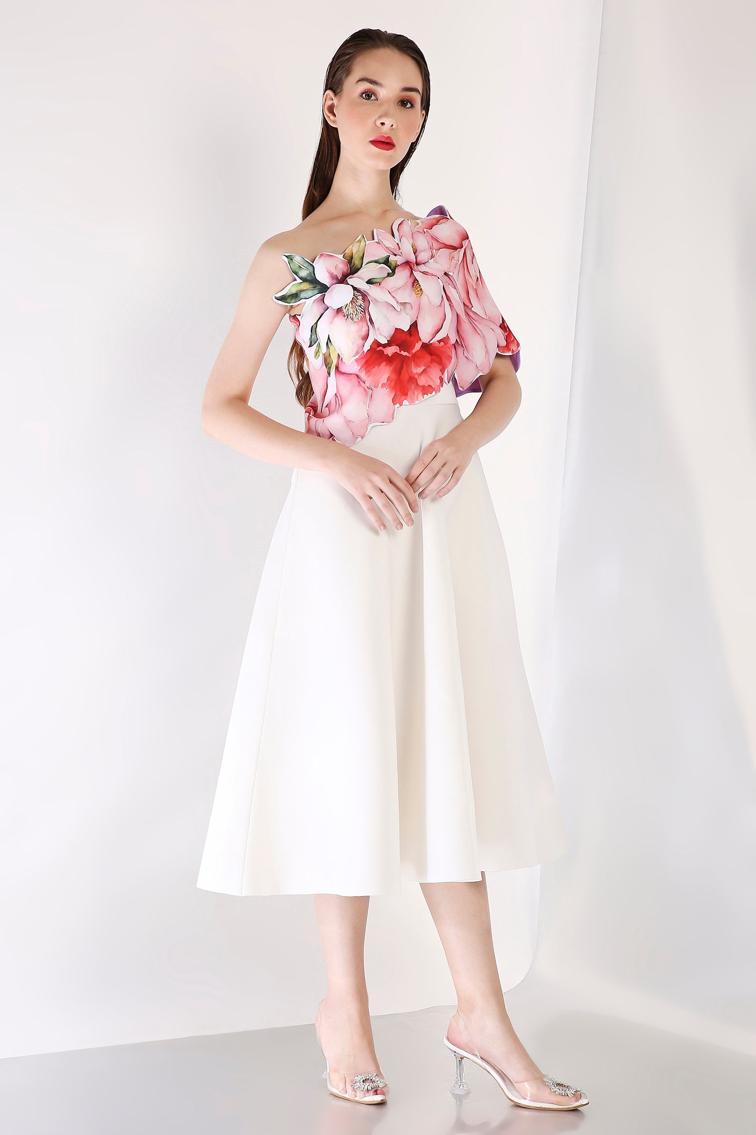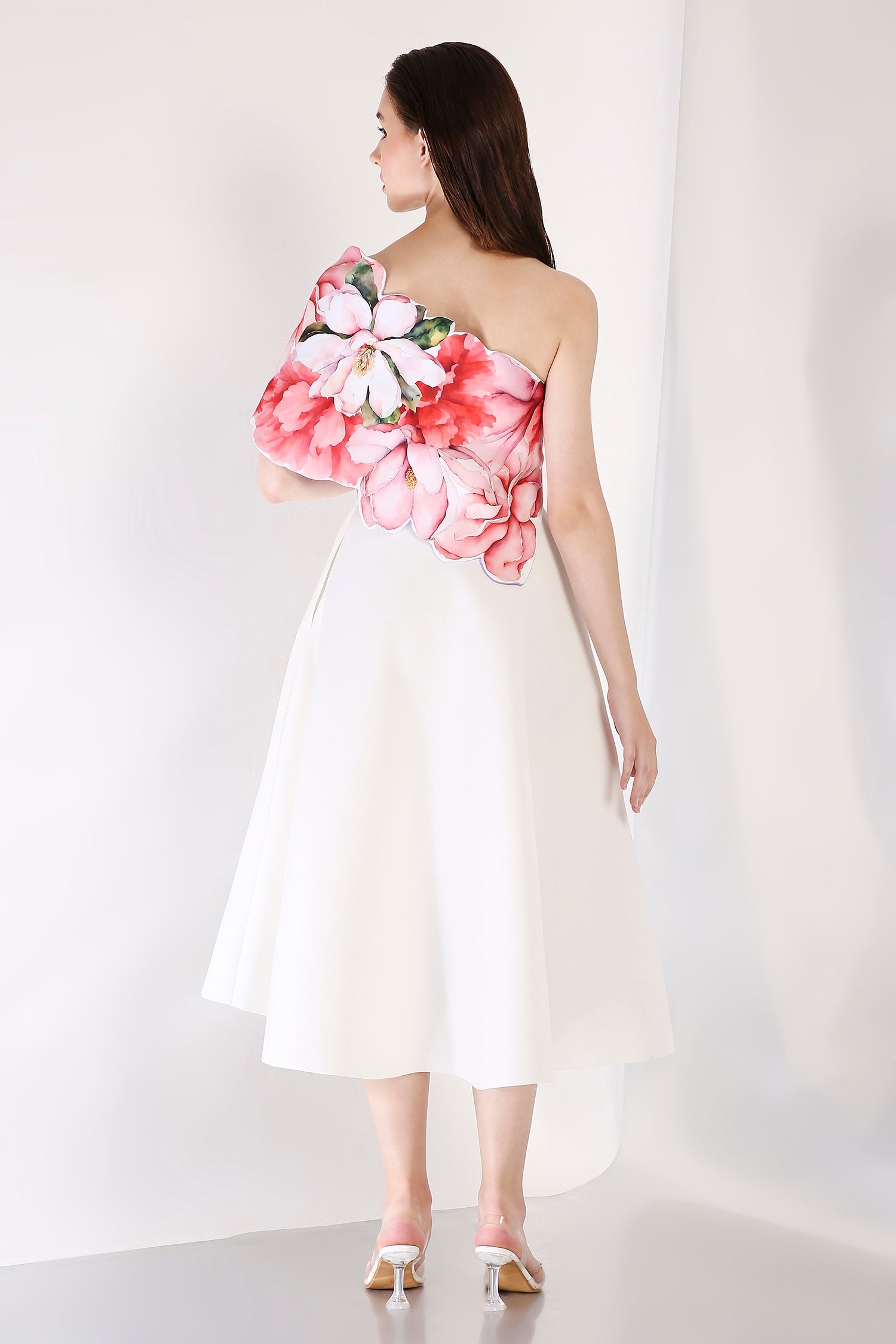 Refined femininity defines this strapless midi dress, beautifully complemented by a floral printed wrap. Styled one-shoulder or off-shoulder, it adds an enchanting touch to the silhouette.