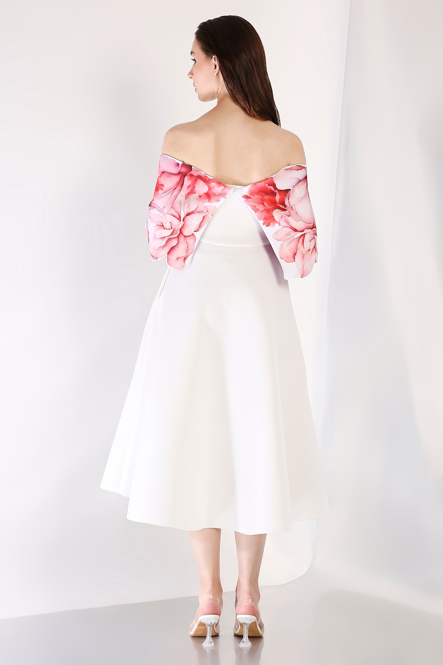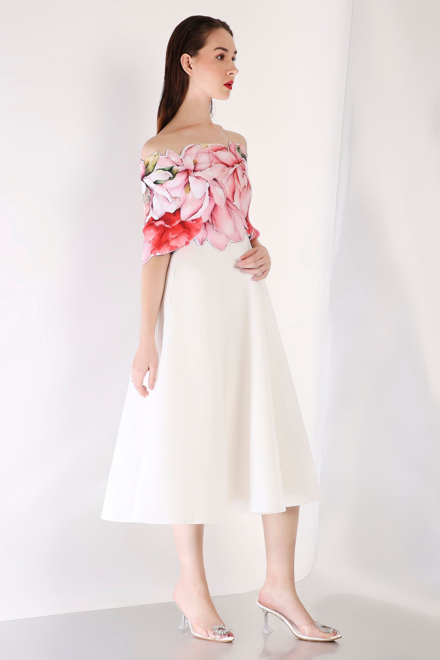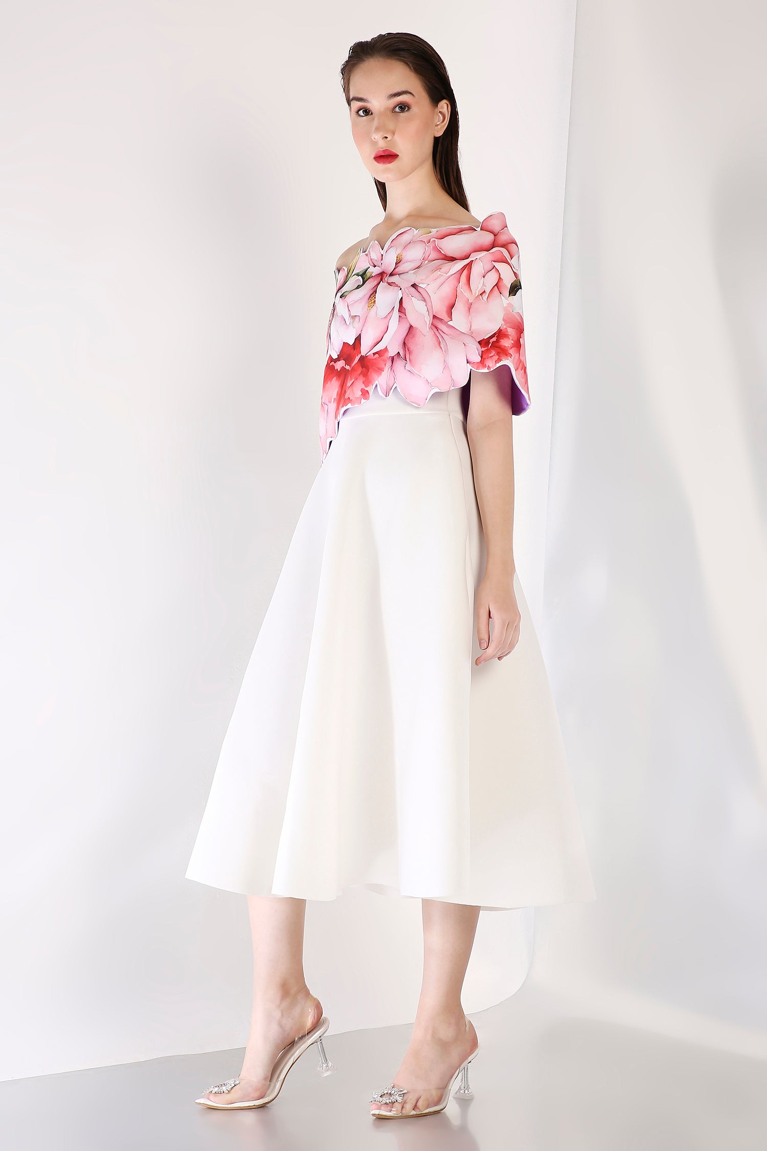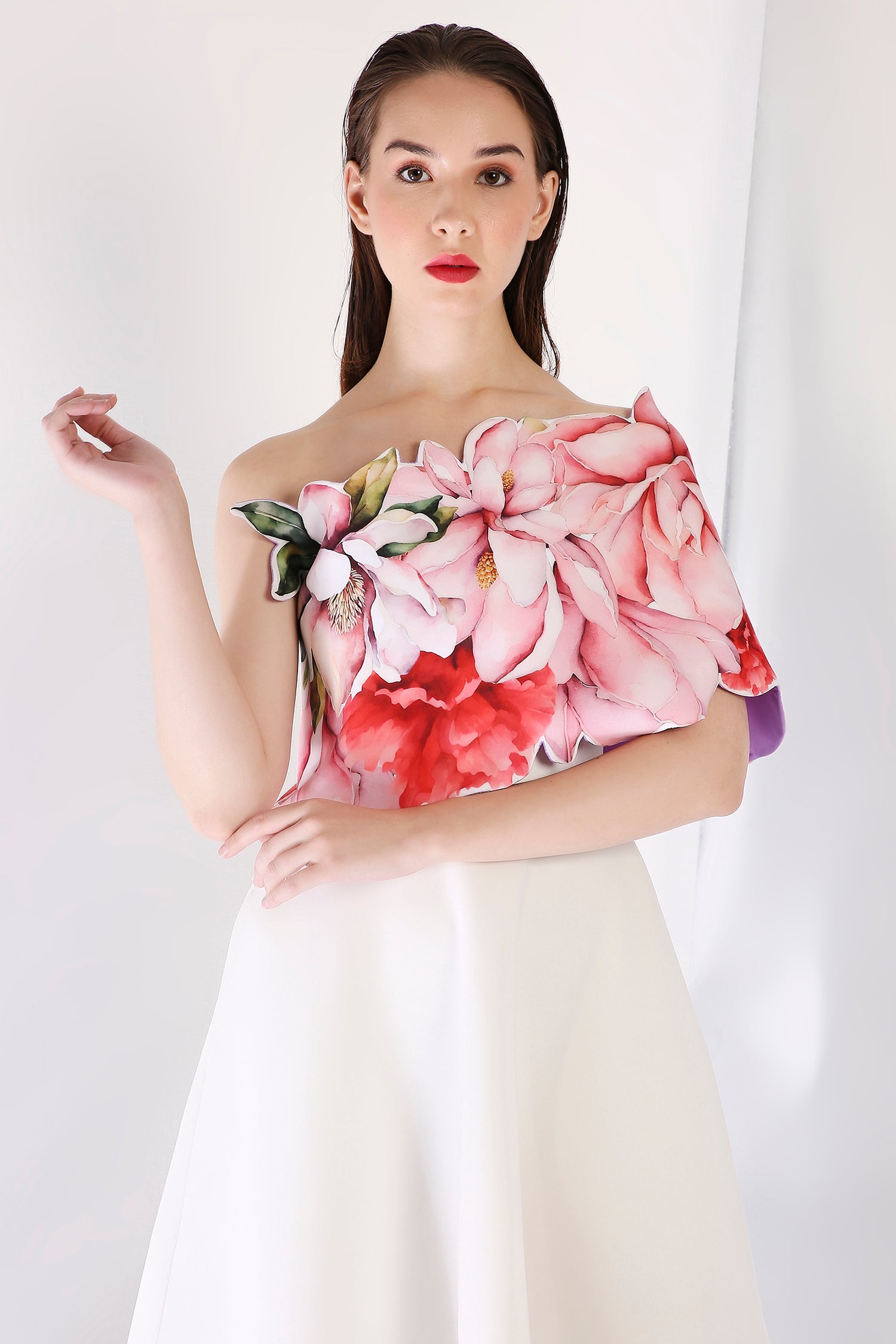 Refined femininity defines this strapless midi dress, beautifully complemented by a floral printed wrap. Styled one-shoulder or off-shoulder, it adds an enchanting touch to the silhouette.