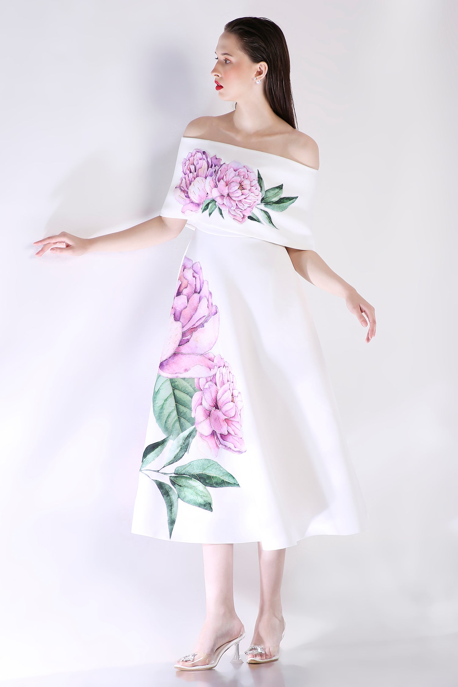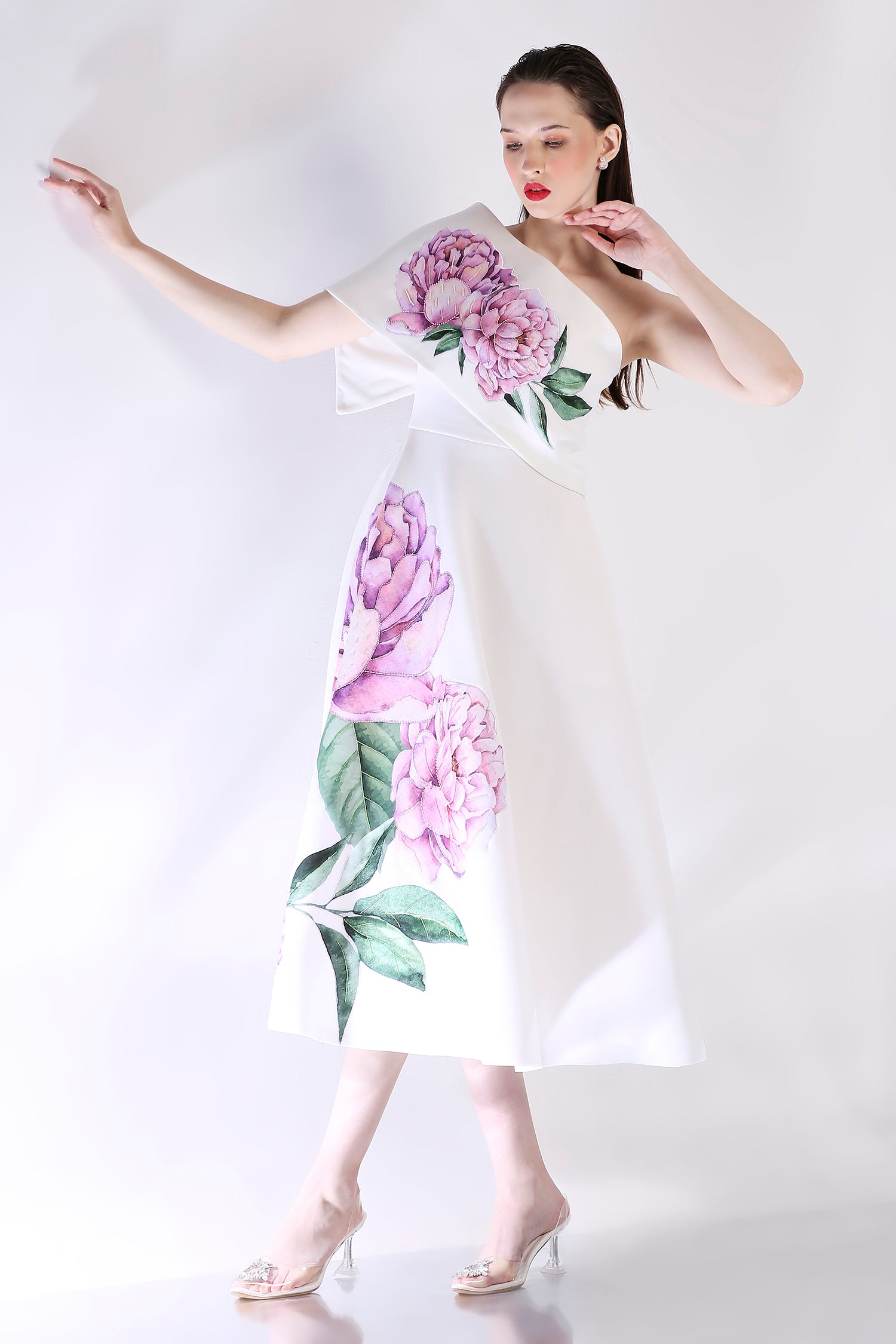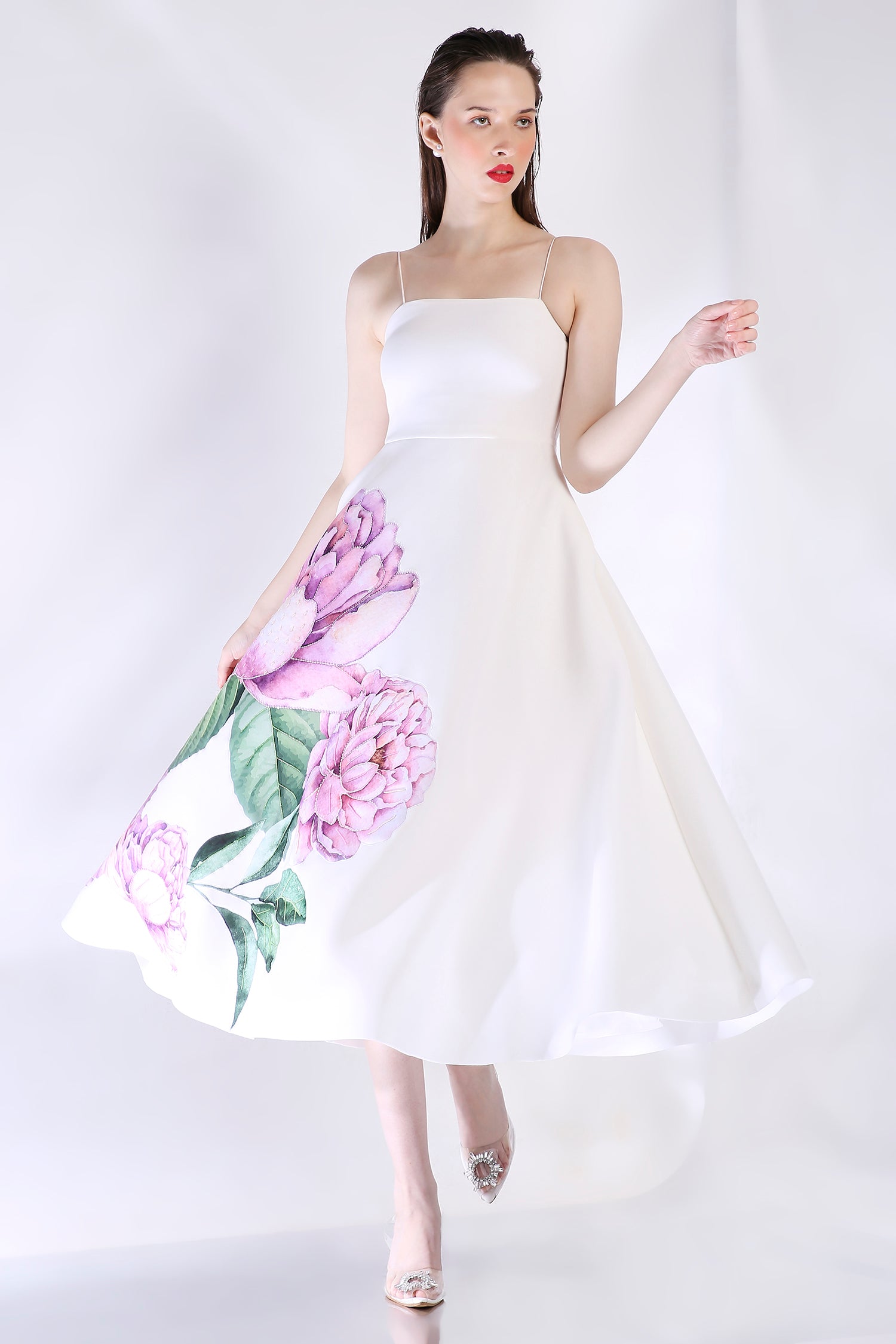 The Nyra dress embodies elegance with its floral design, emphasised with appliqué work and hand embroidered with beads and sequins.