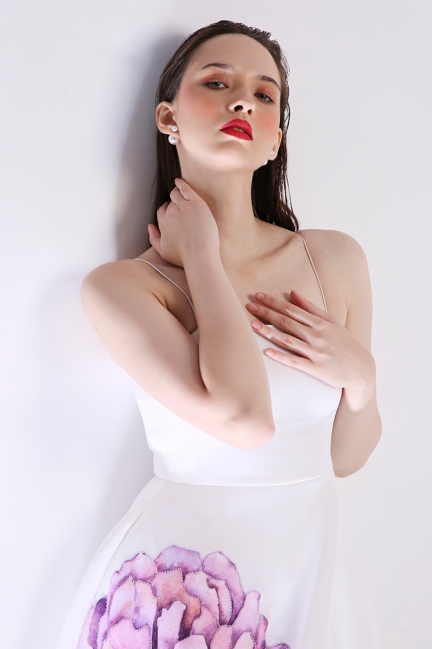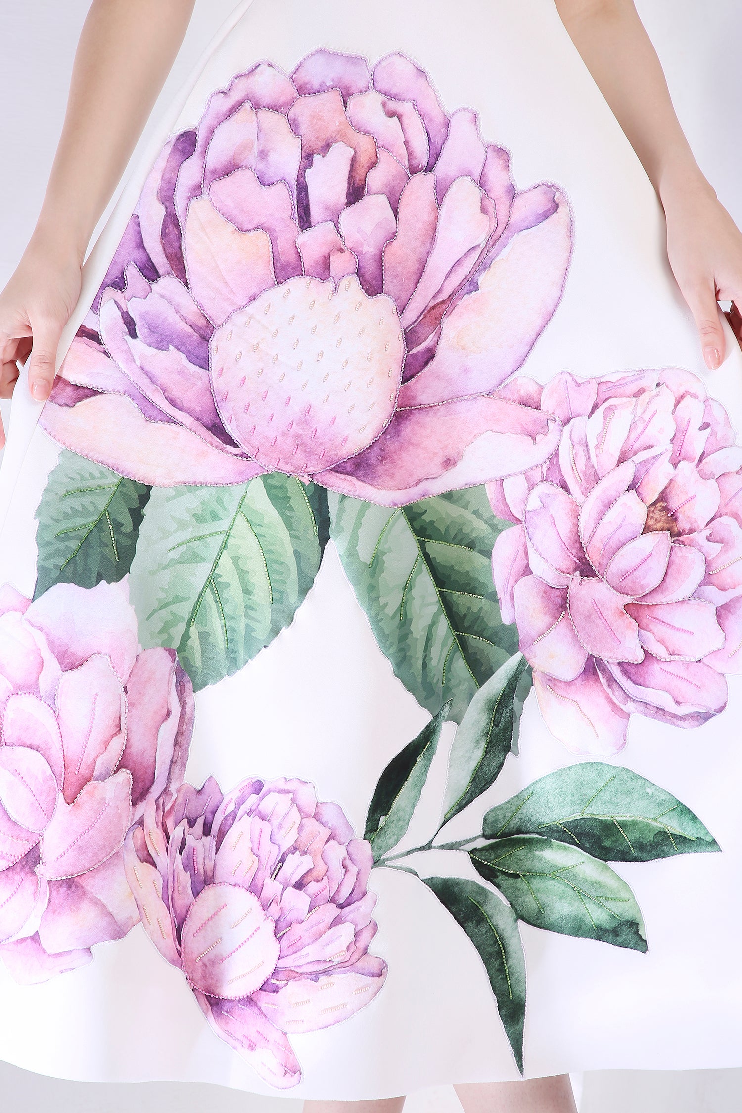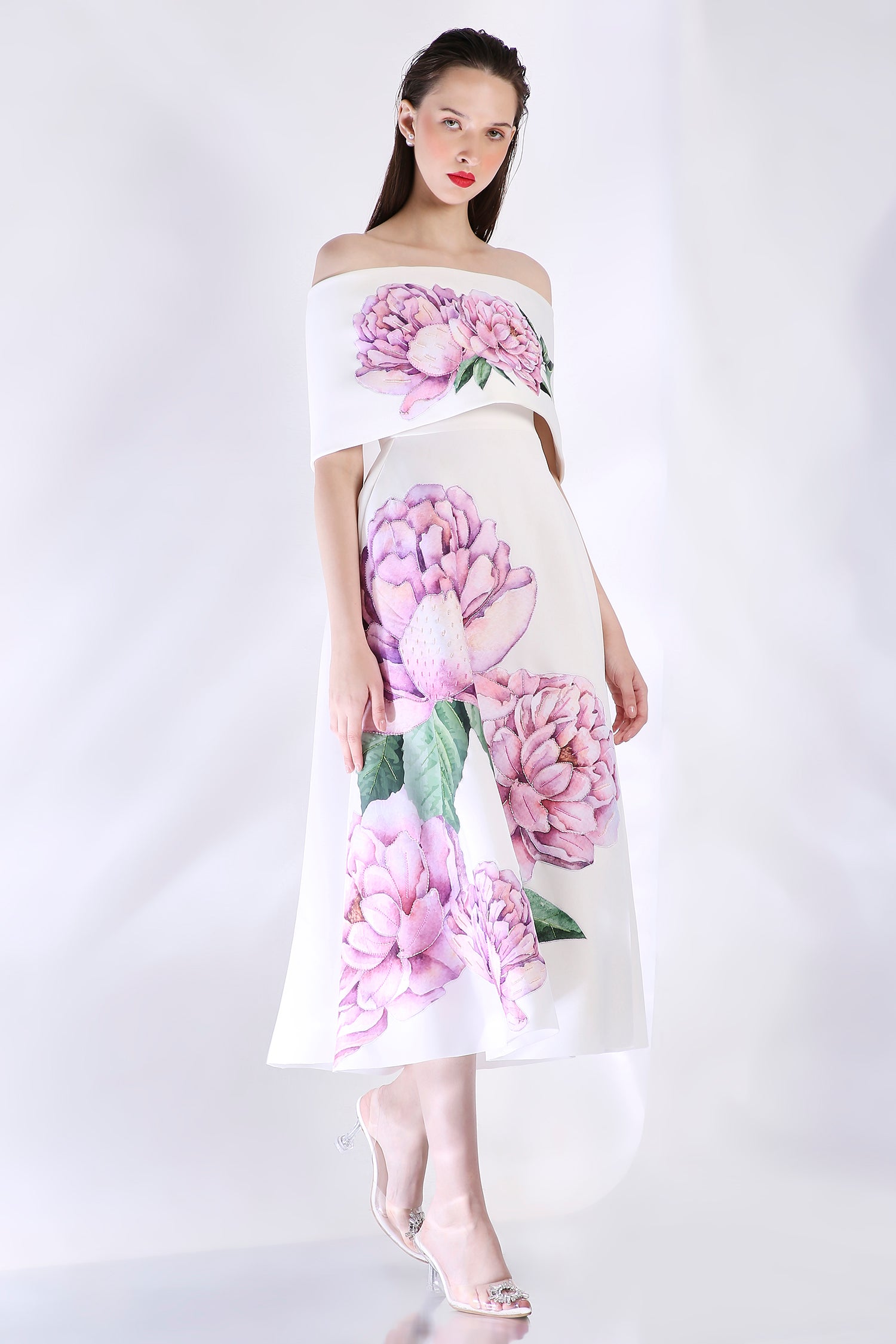 The Nyra dress embodies elegance with its floral design, emphasised with appliqué work and hand embroidered with beads and sequins.