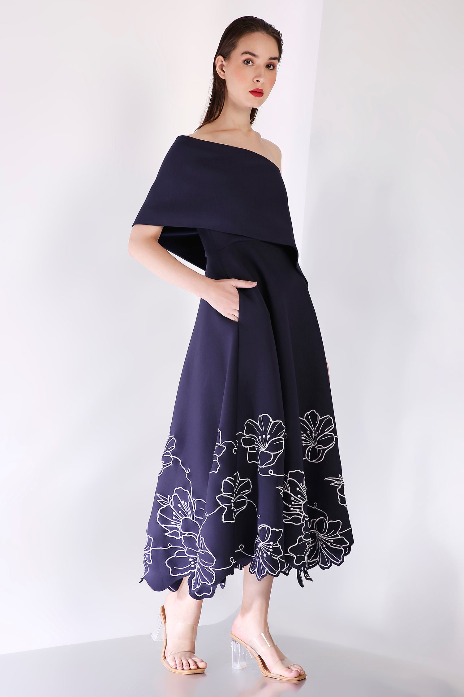 The ensemble is complemented by a versatile classic wrap, which can be styled one-shoulder or off-shoulder, offering the perfect blend of sophistication and flexibility—ideal for any formal occasion.