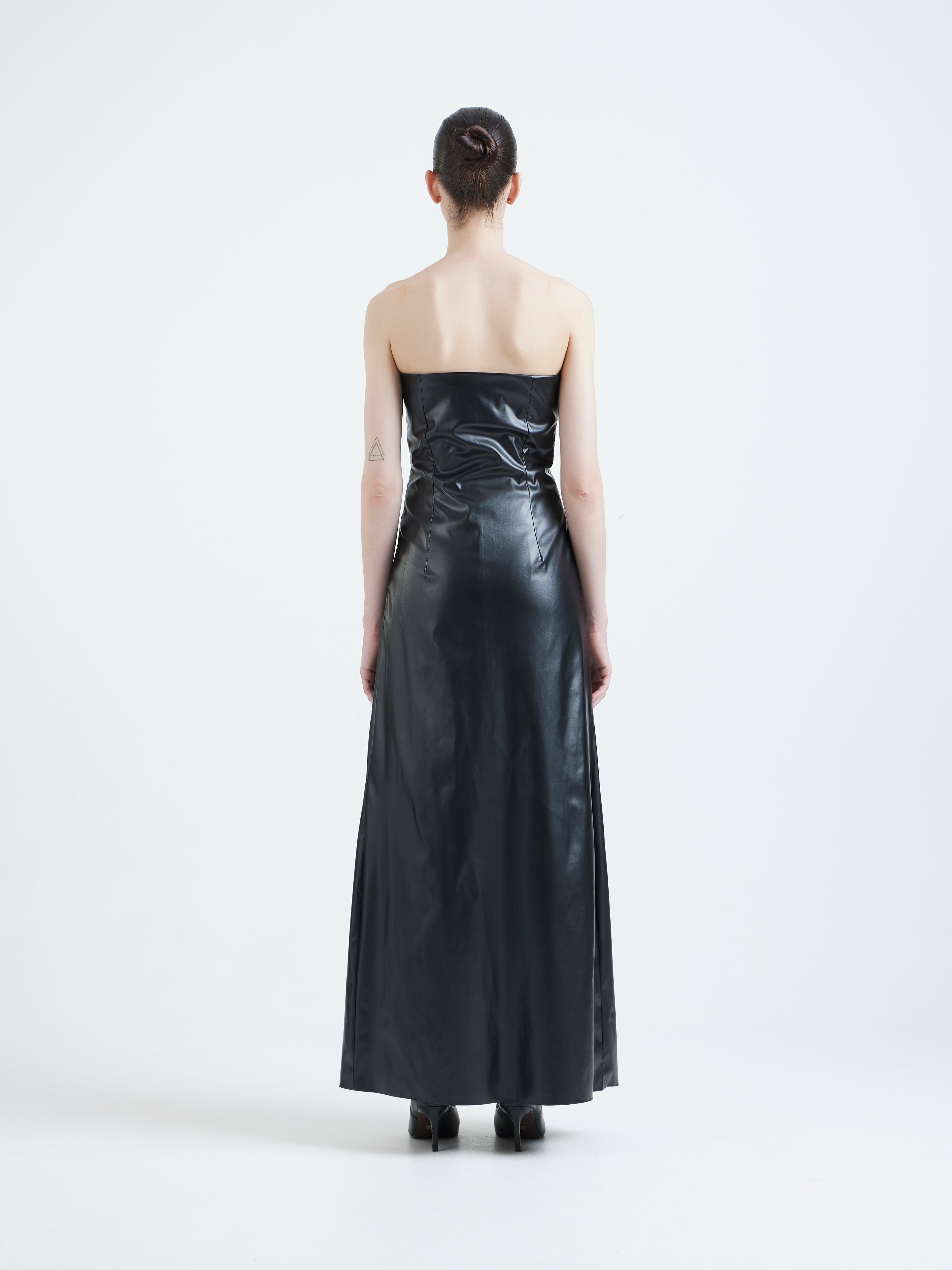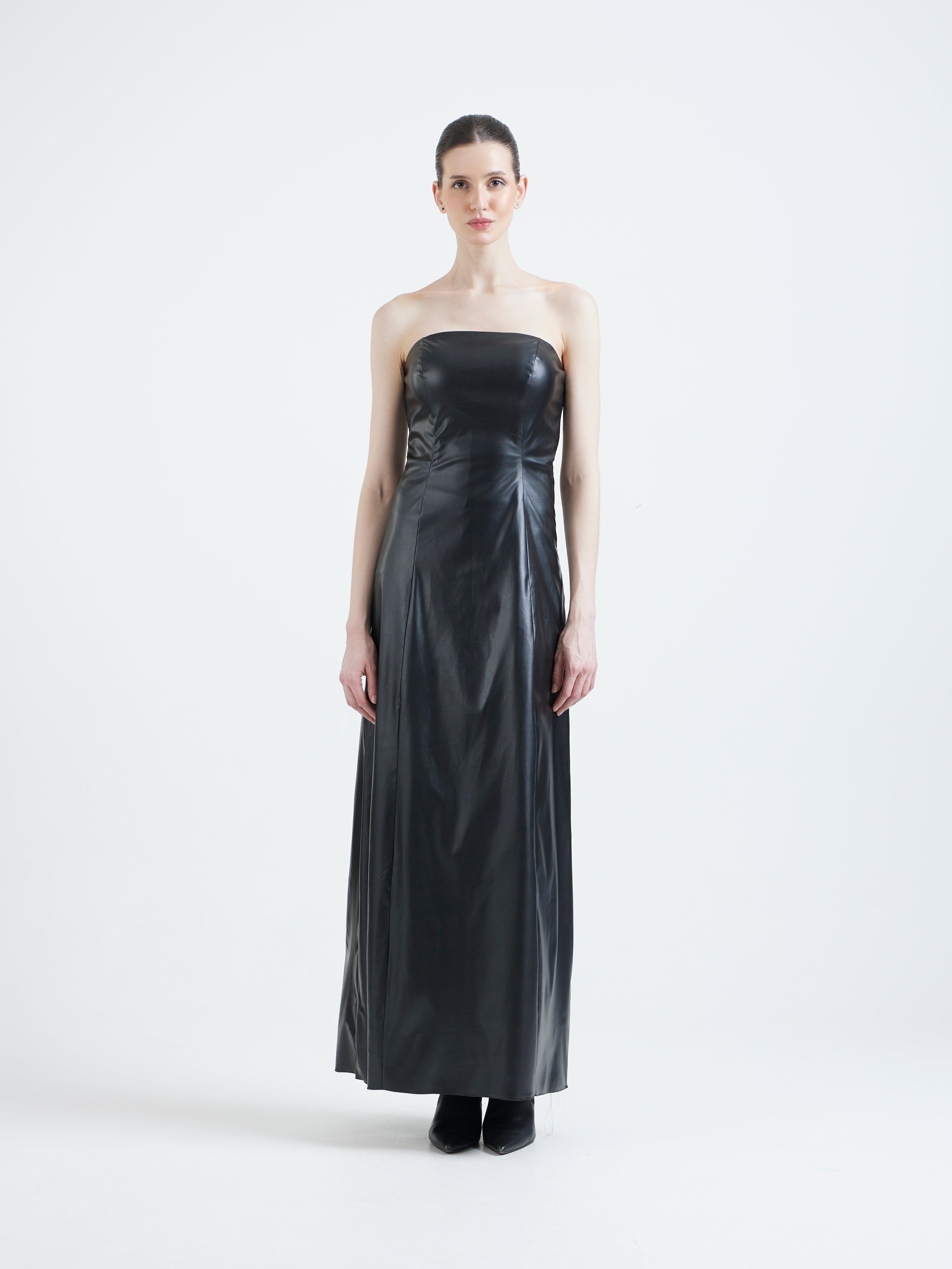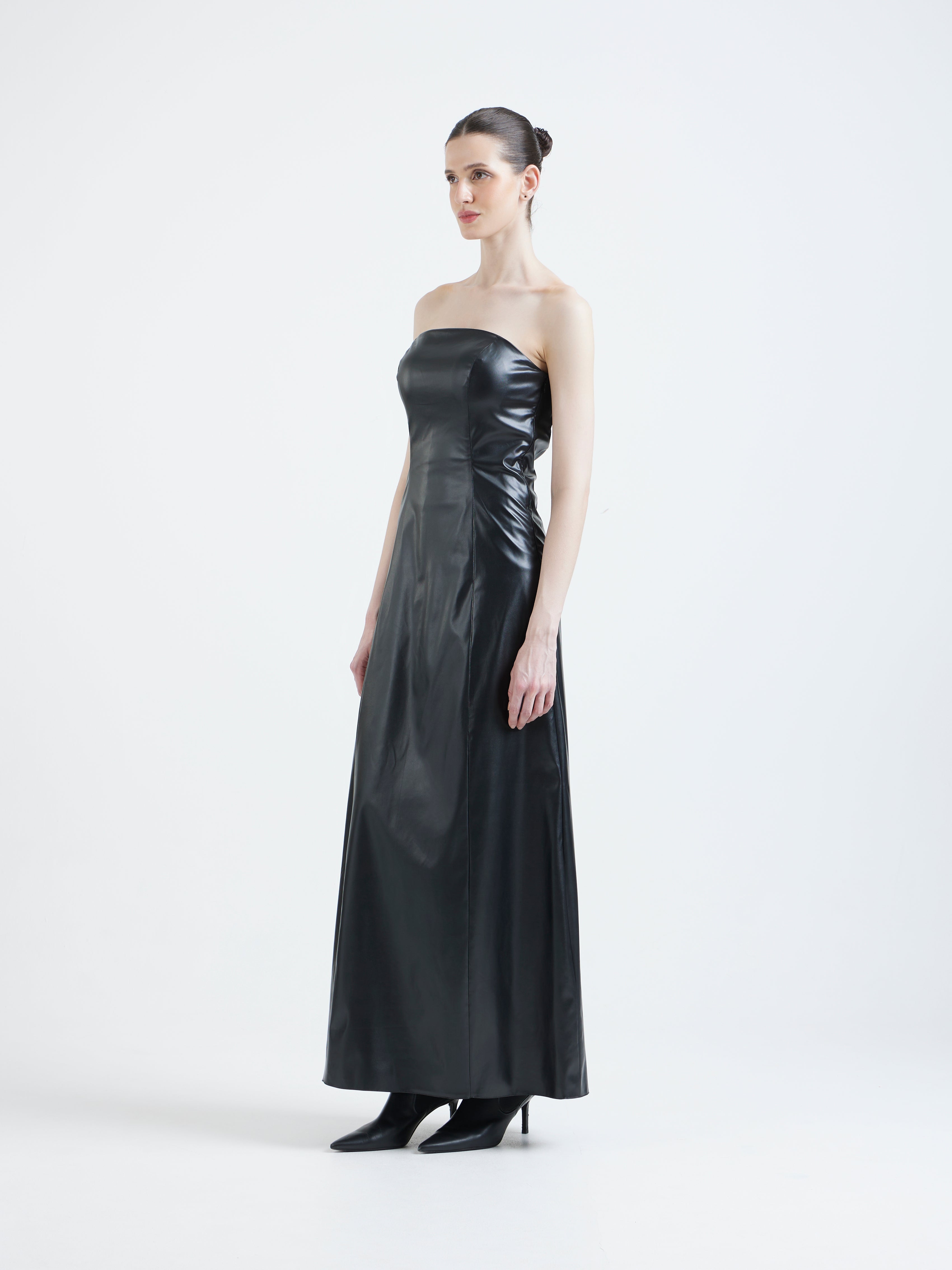 This strapless black leather maxi delivers modern Gothic drama through powerful simplicity.