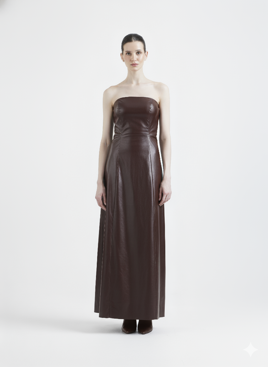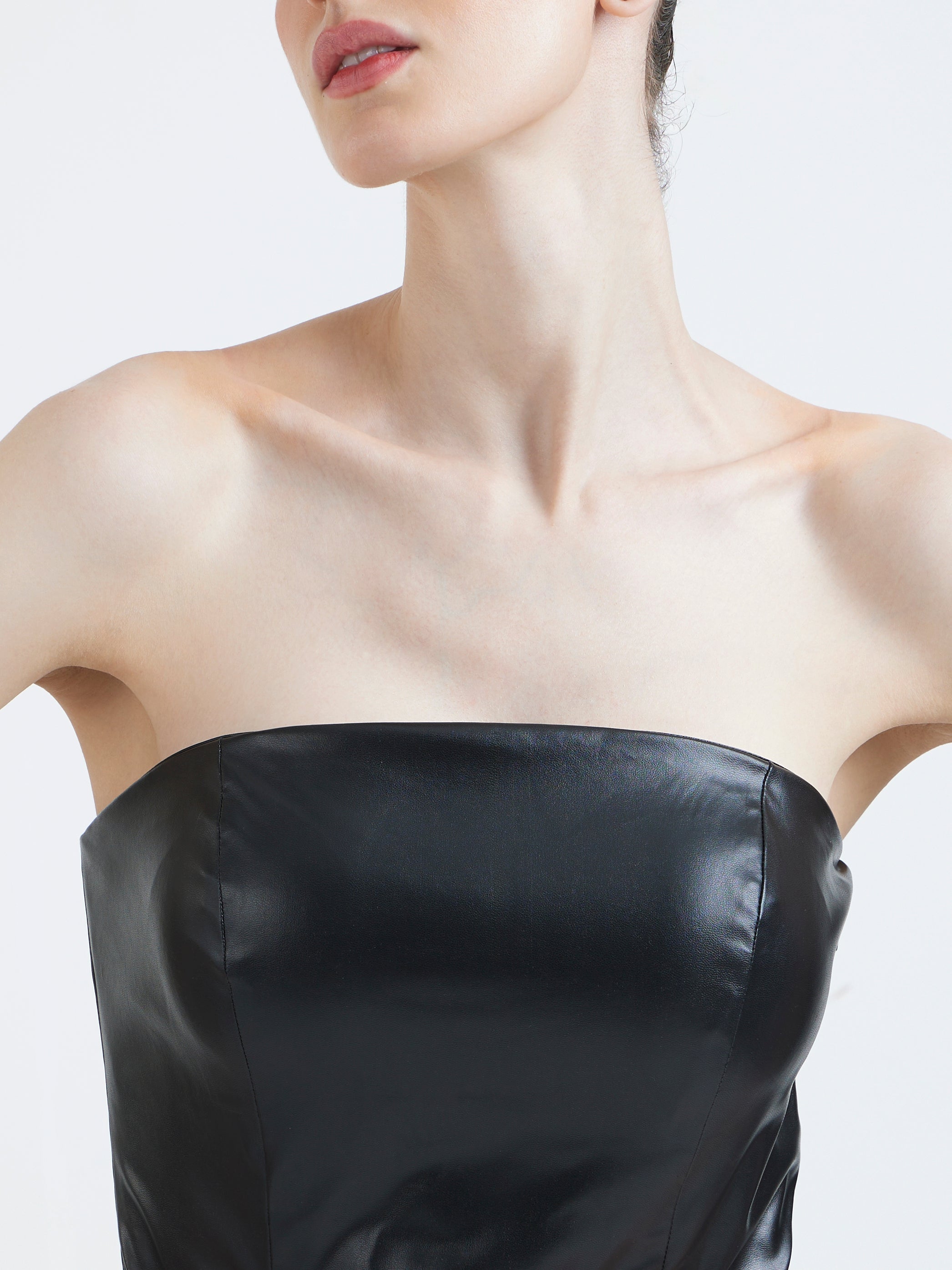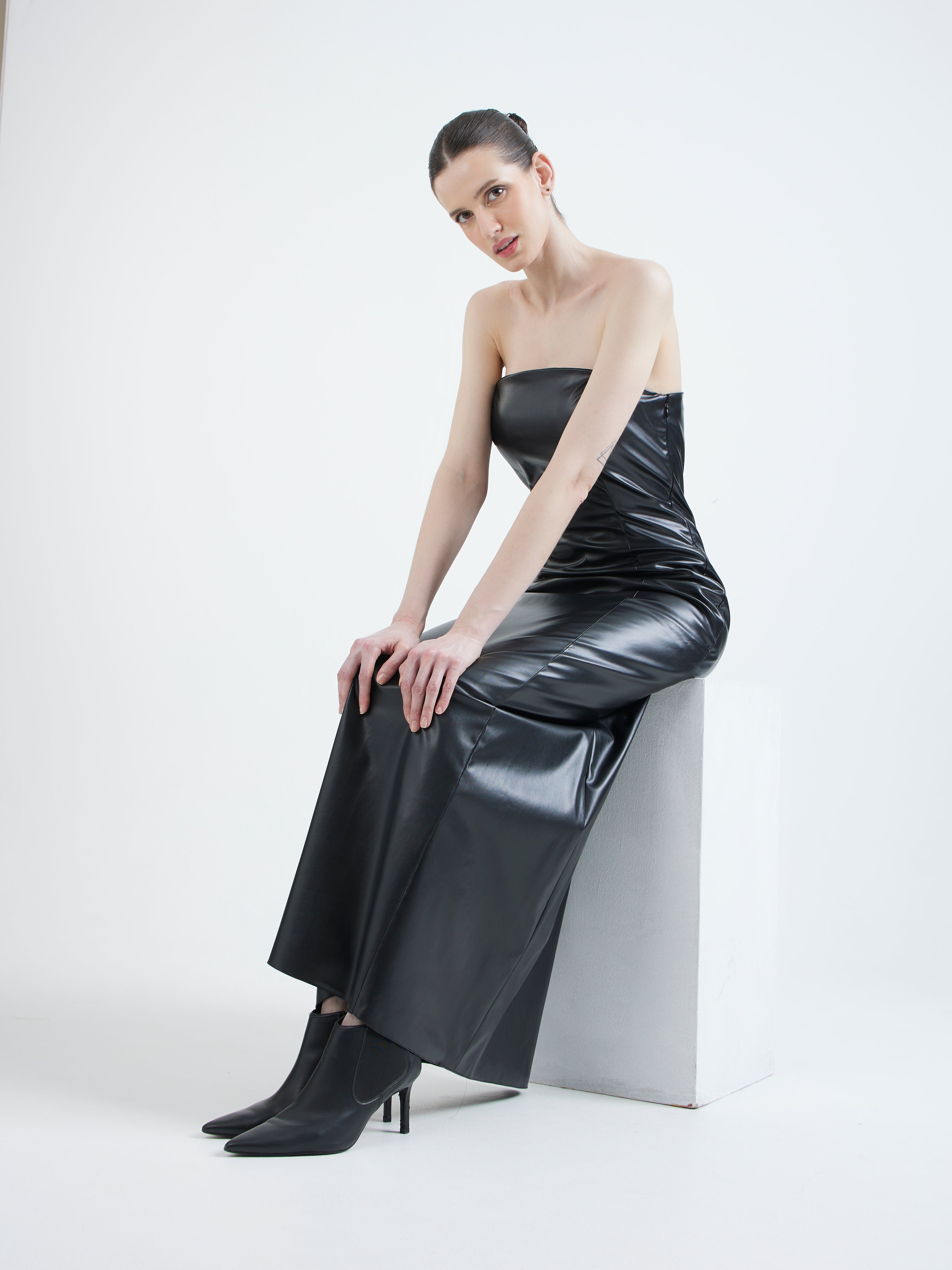 This strapless black leather maxi delivers modern Gothic drama through powerful simplicity.