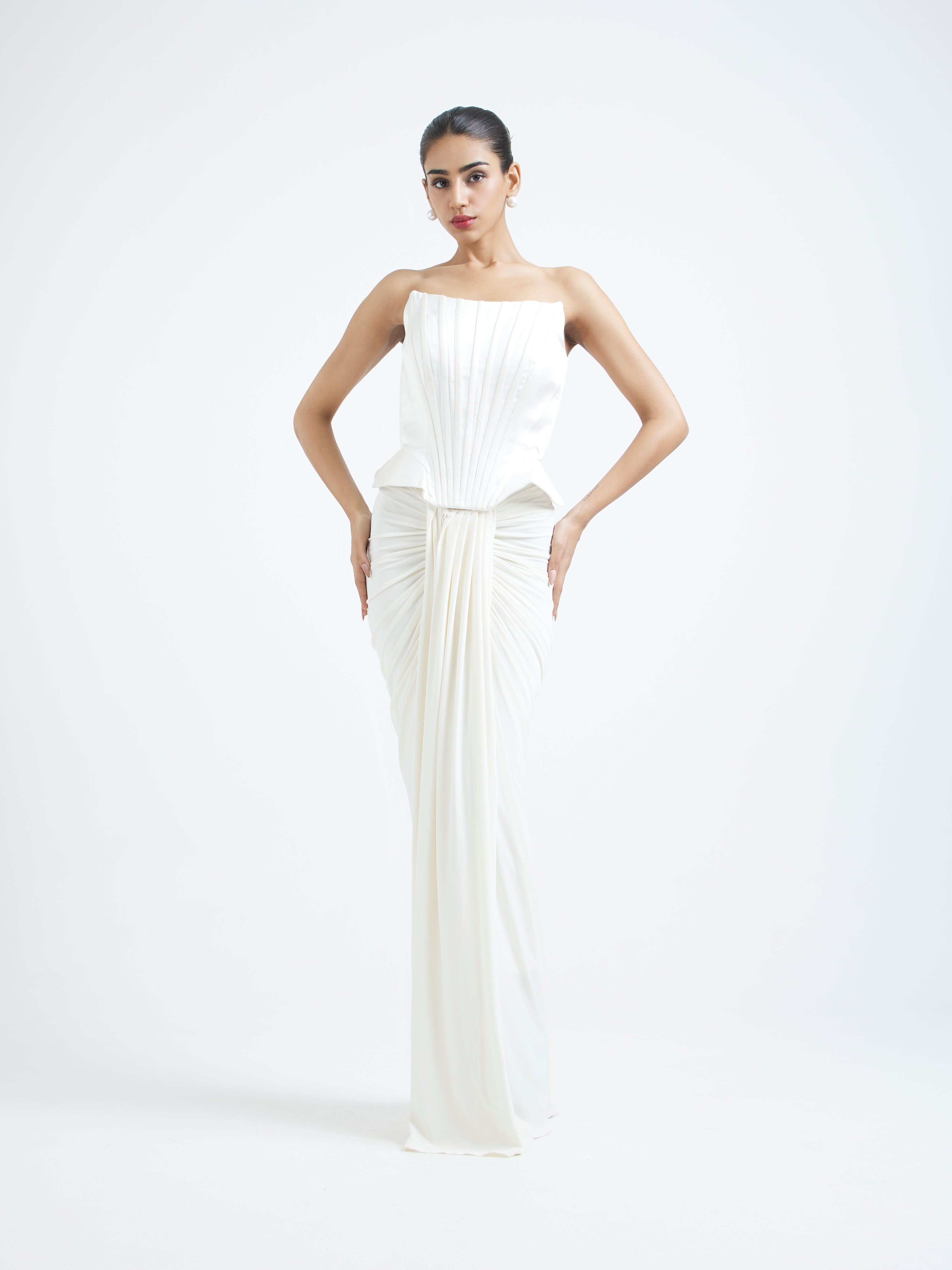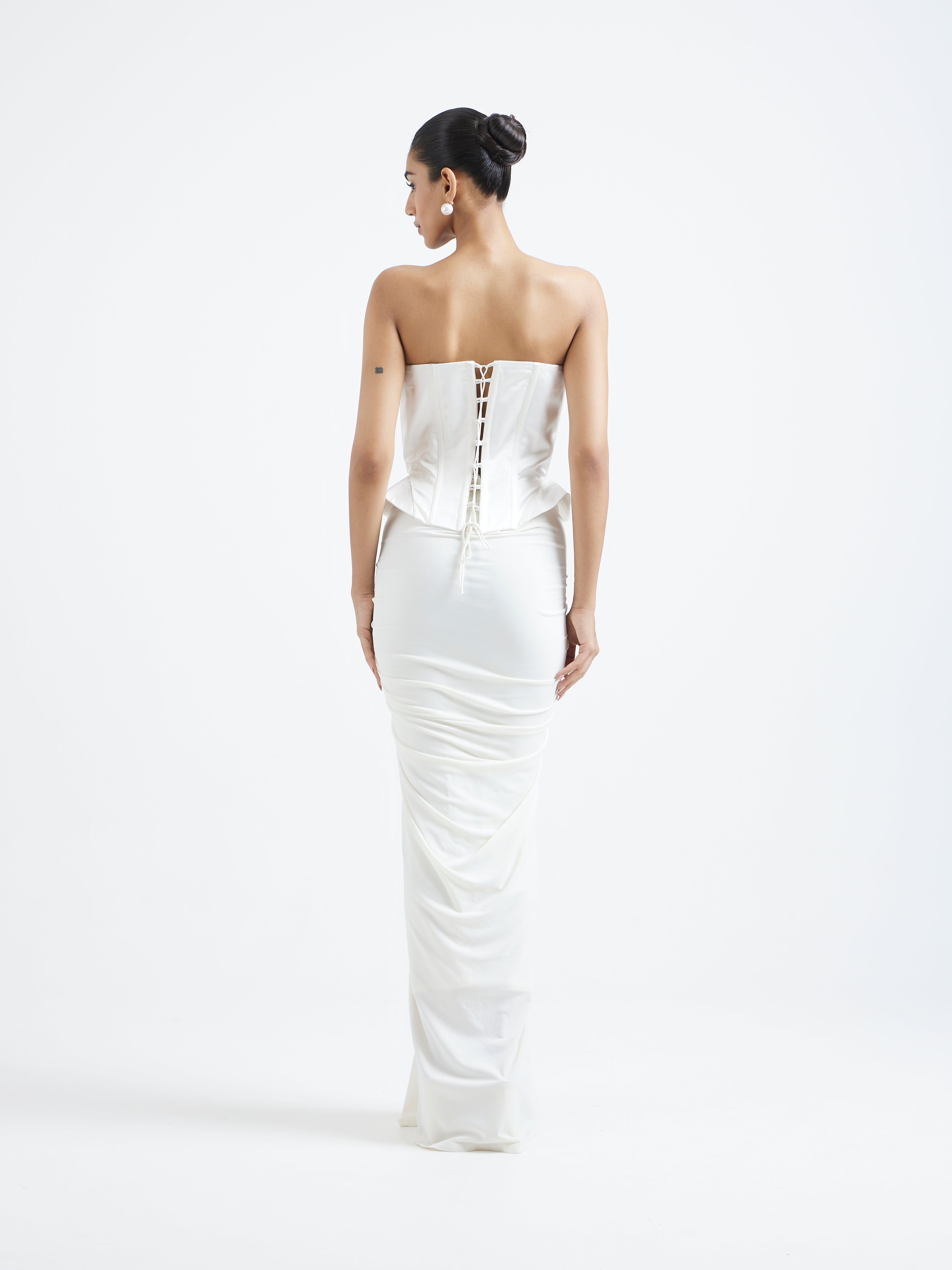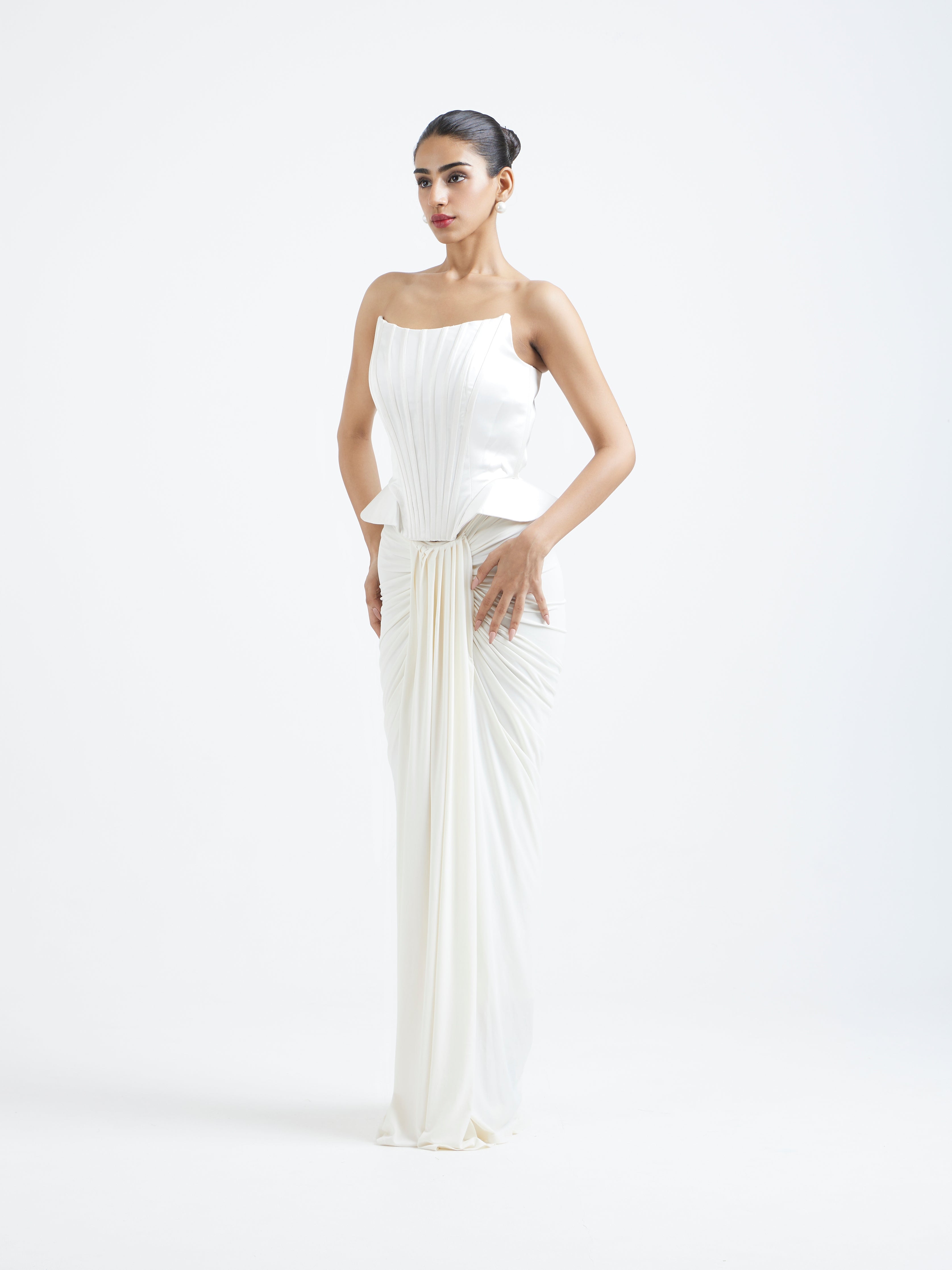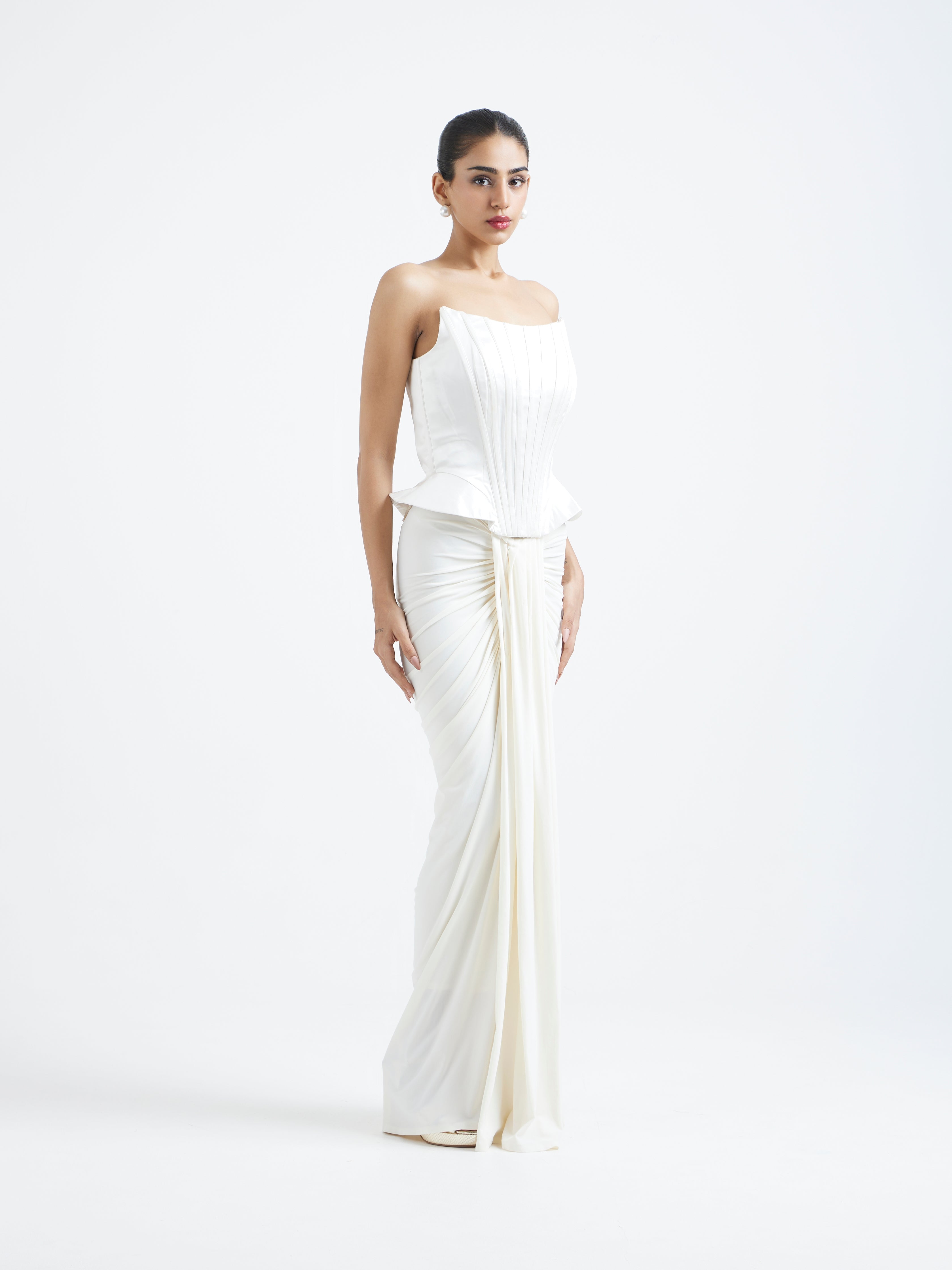 An elegant ivory ensemble featuring a structured corset paired with a fluid lycra skirt. The corset is designed with crisp panel detailing that shapes the waist beautifully, while the soft draped skirt adds movement and ease.