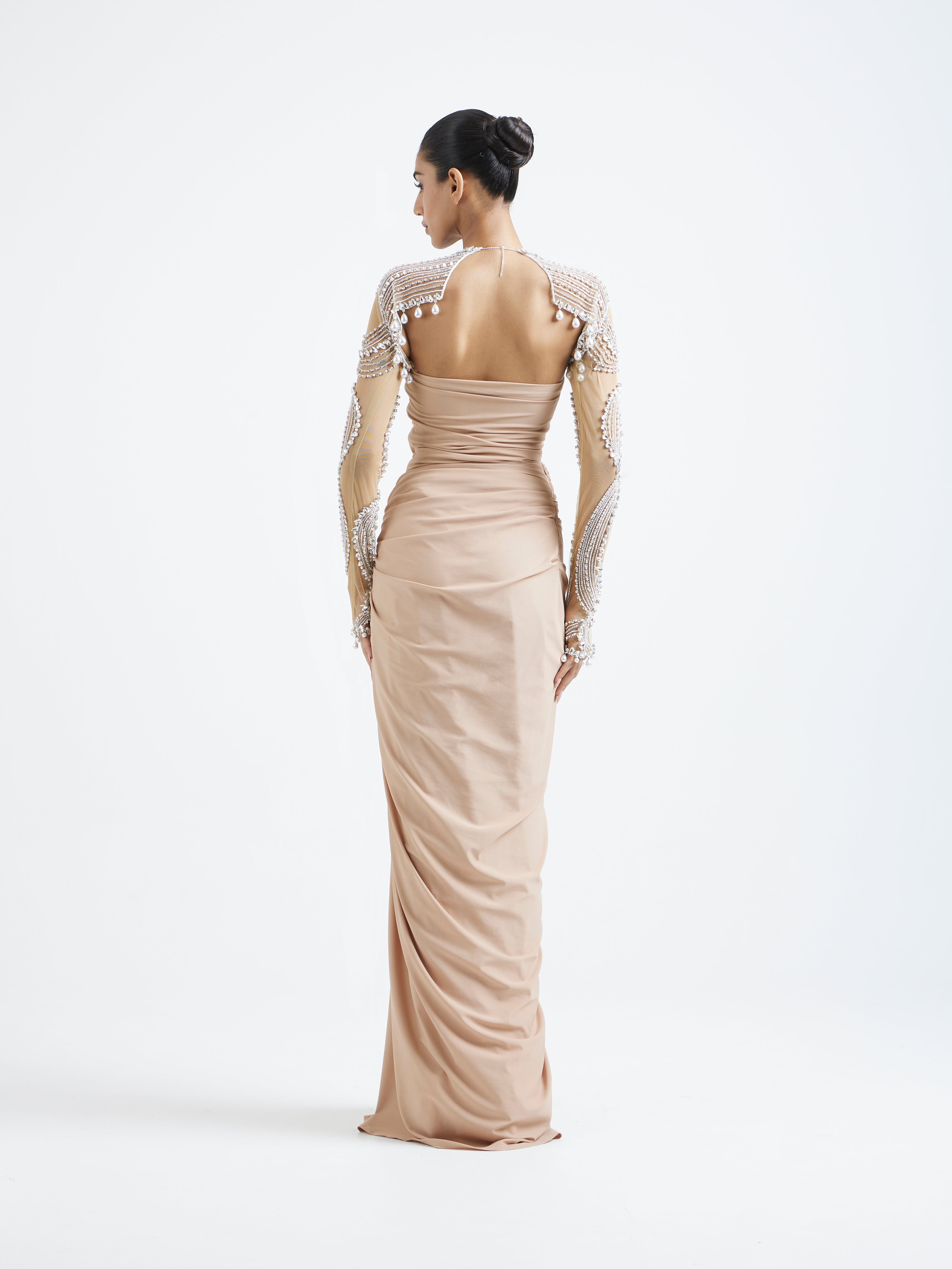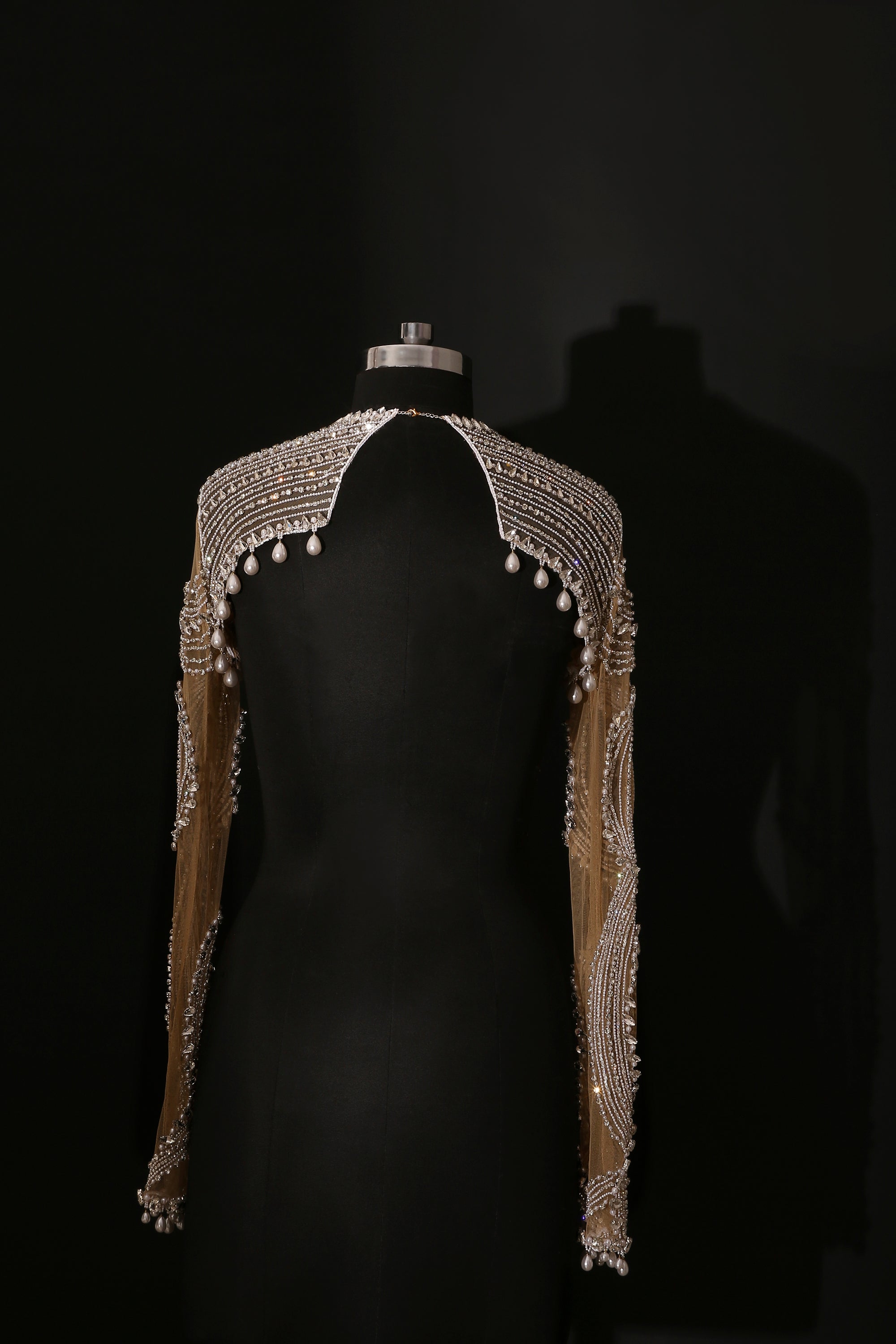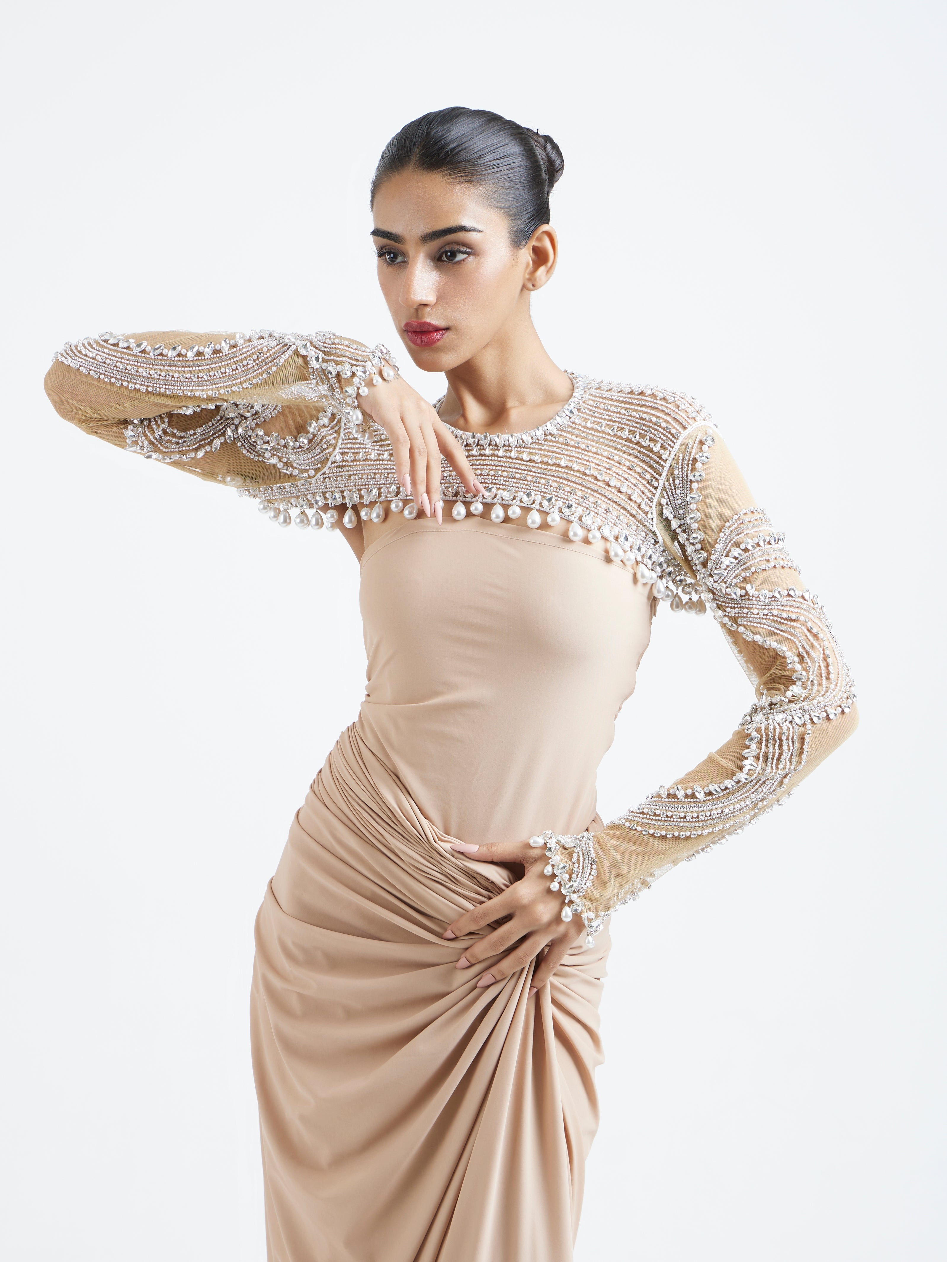 A sheer, hand-embellished overlay detailed with intricate beadwork, stones, and delicate pearl accents, designed to elevate any base with effortless sophistication.