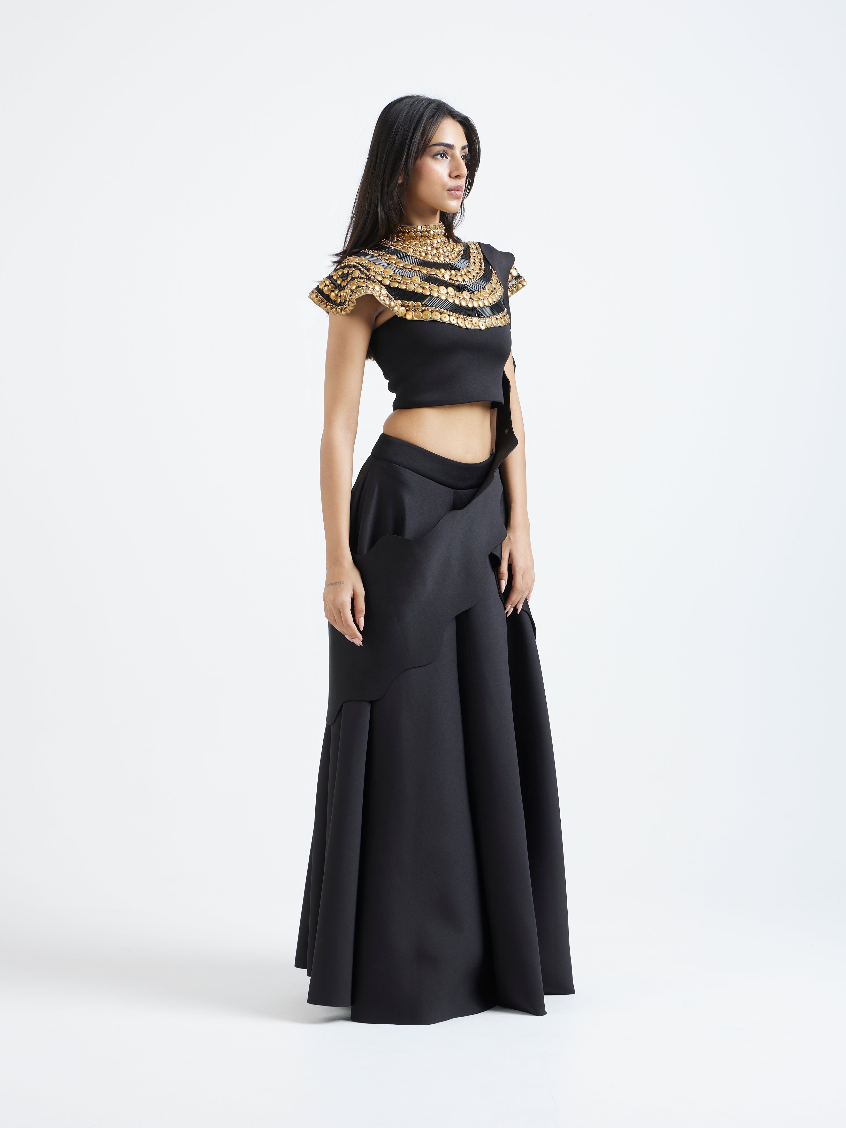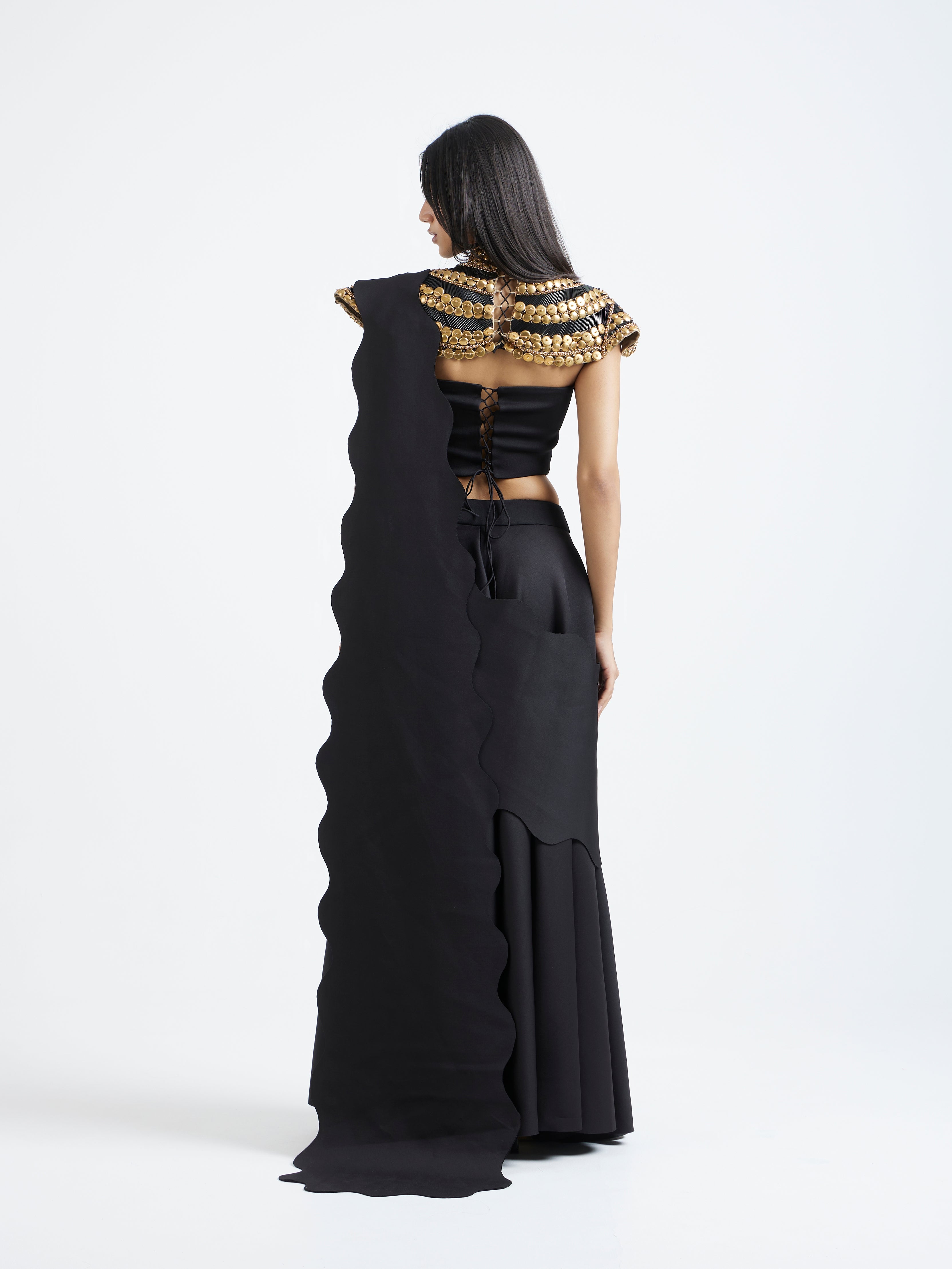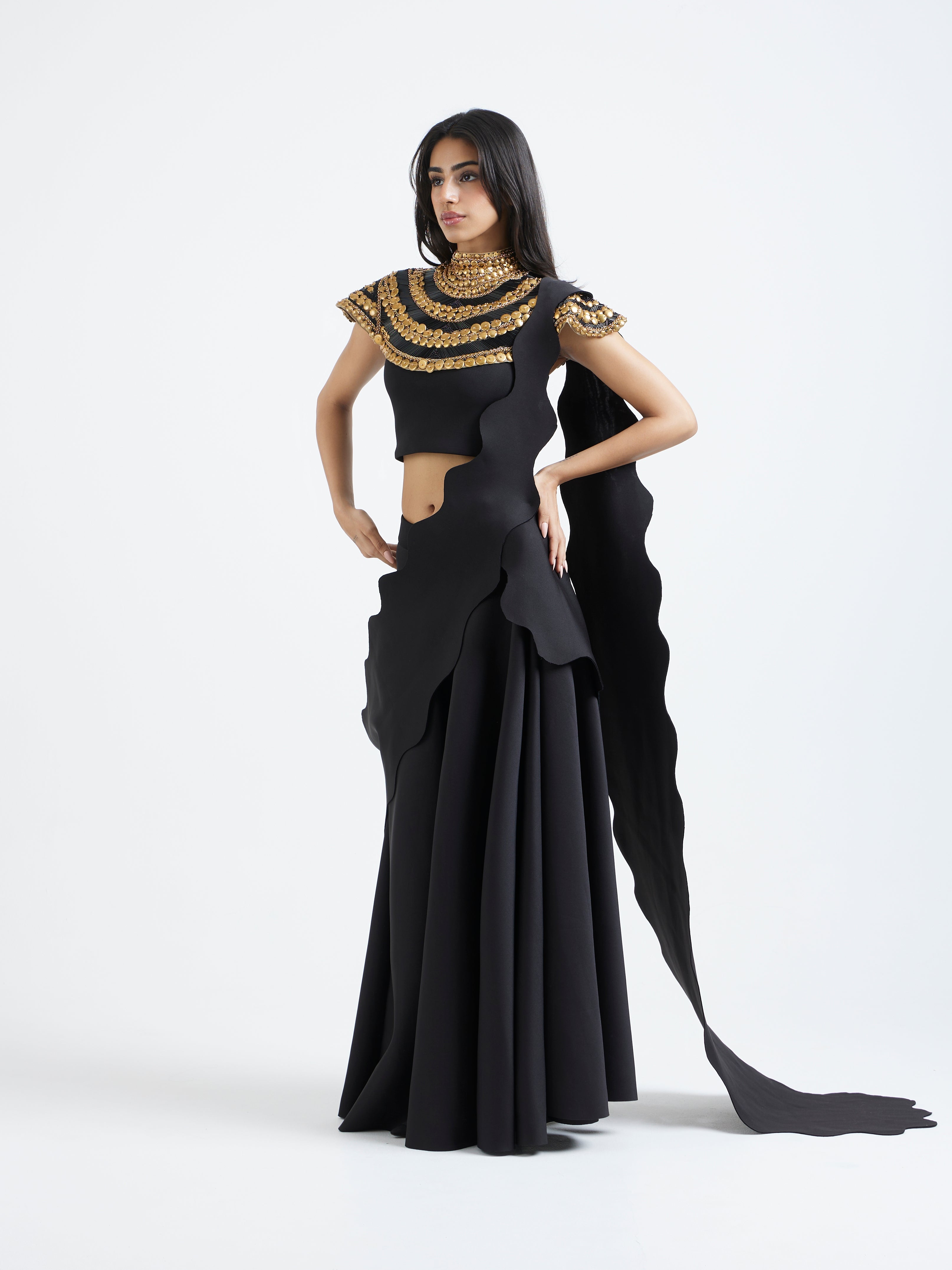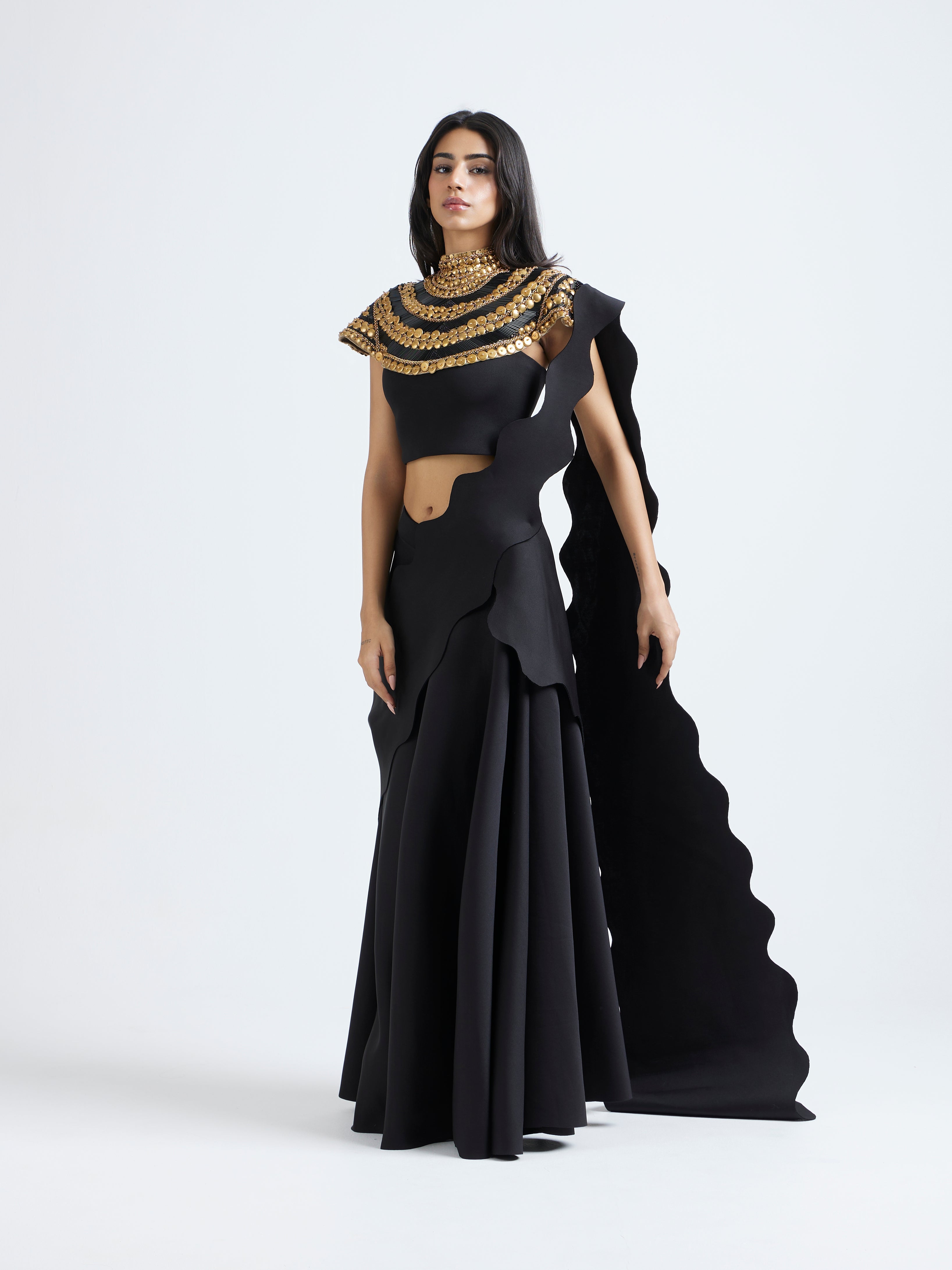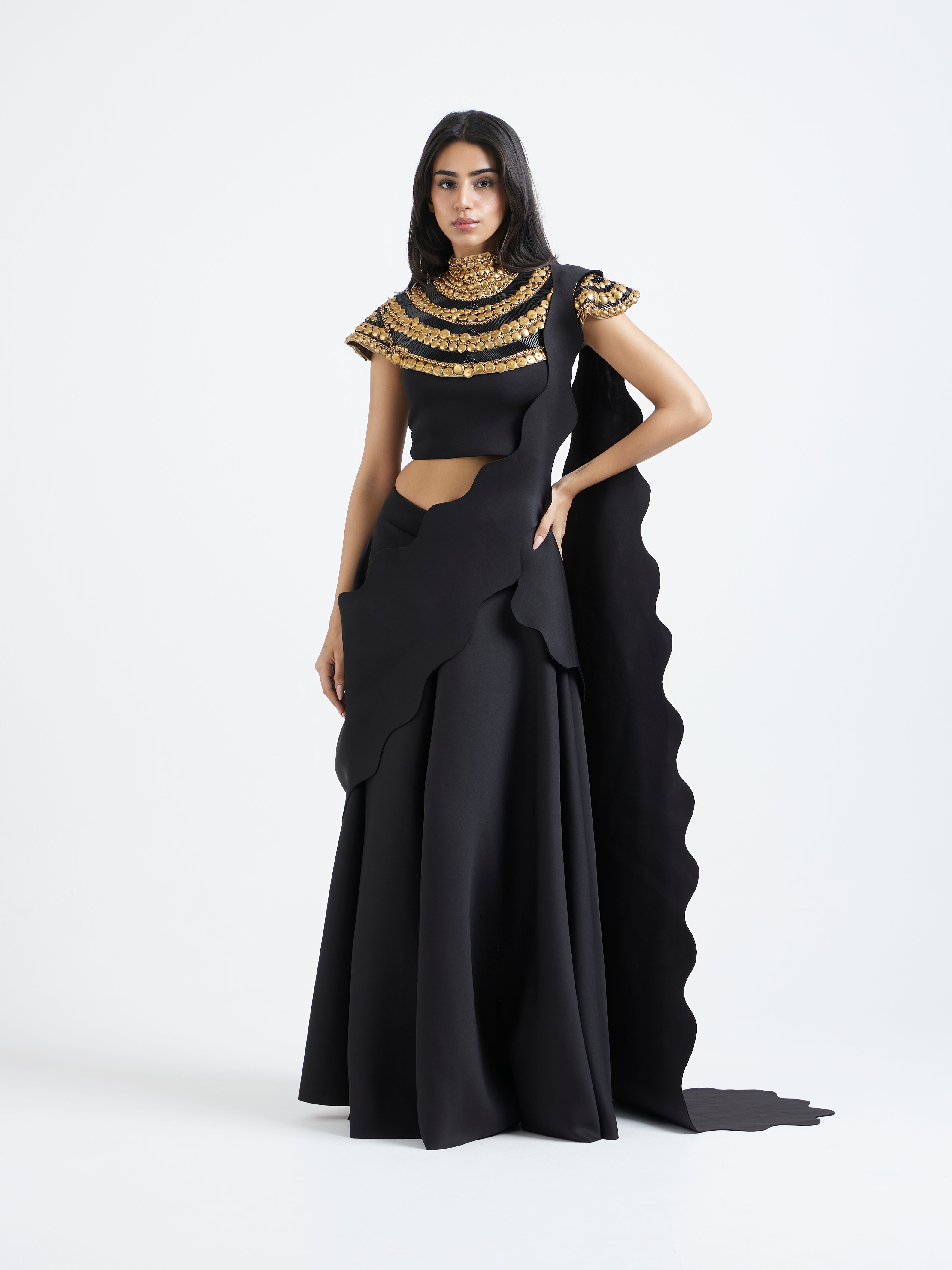 The detachable collar is intricately embellished in layered gold detailing—hand-placed to build a regal, textured armour-like effect that frames the neckline and shoulders.