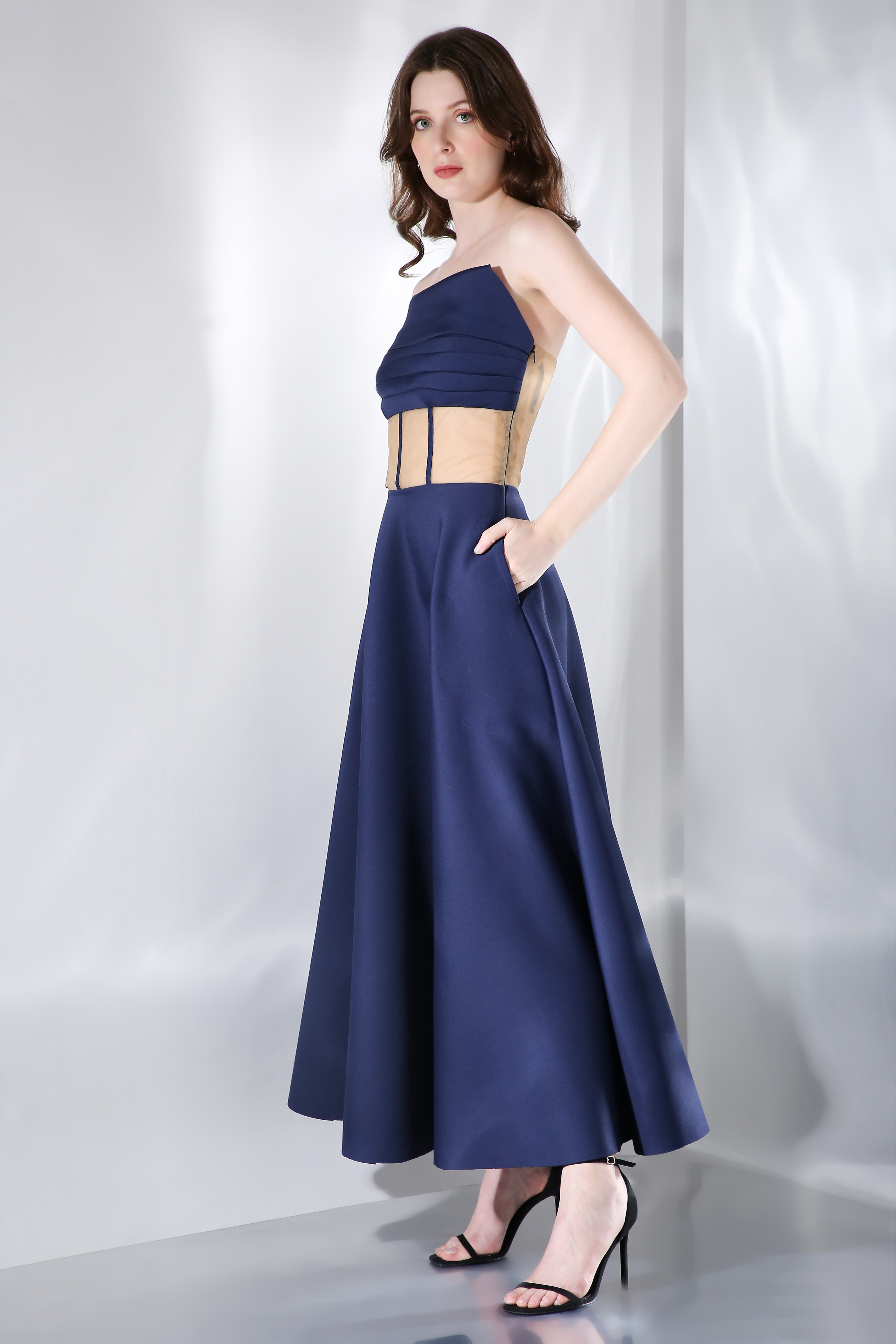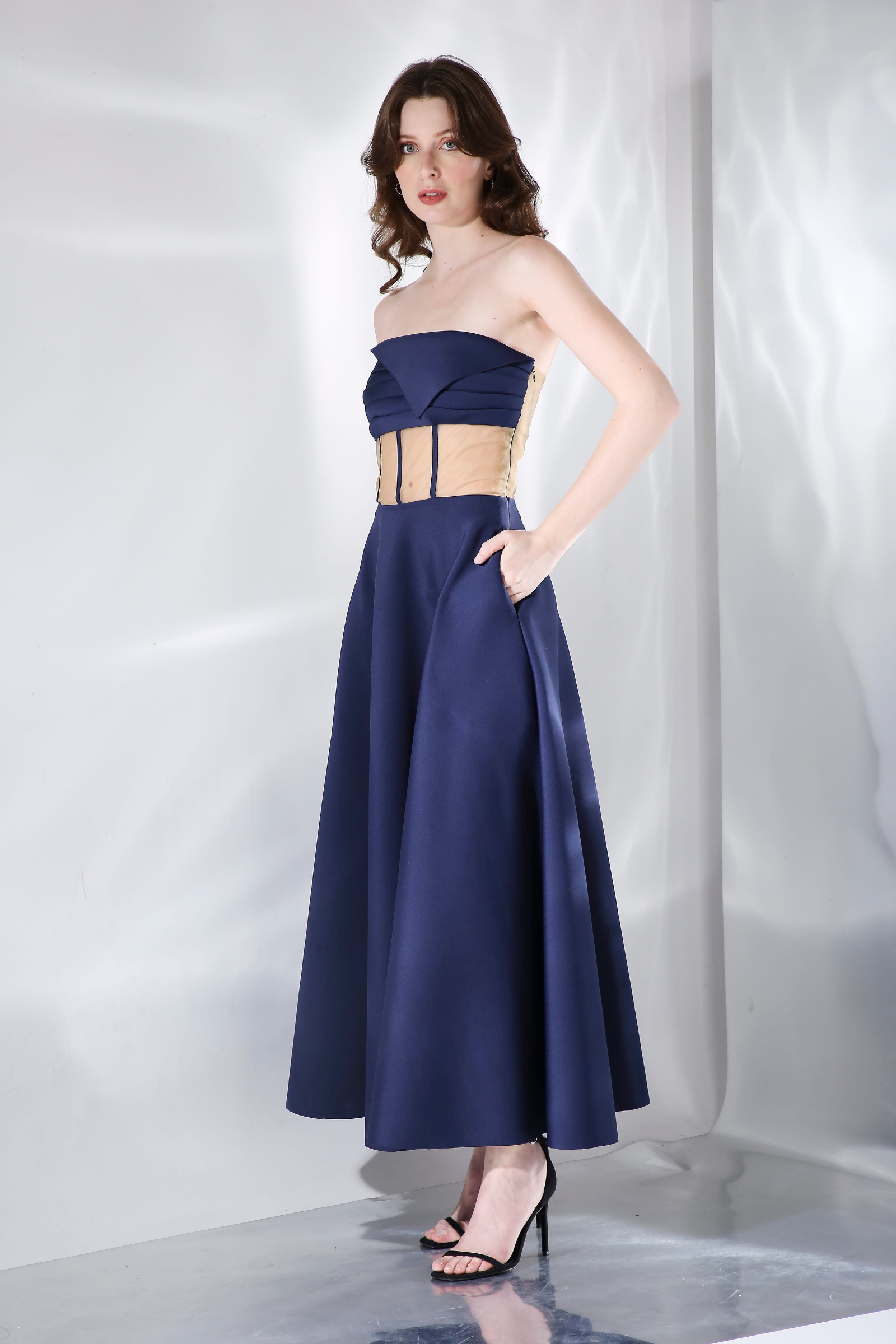 Featuring a corseted, fit and flare dress with mesh inlays.