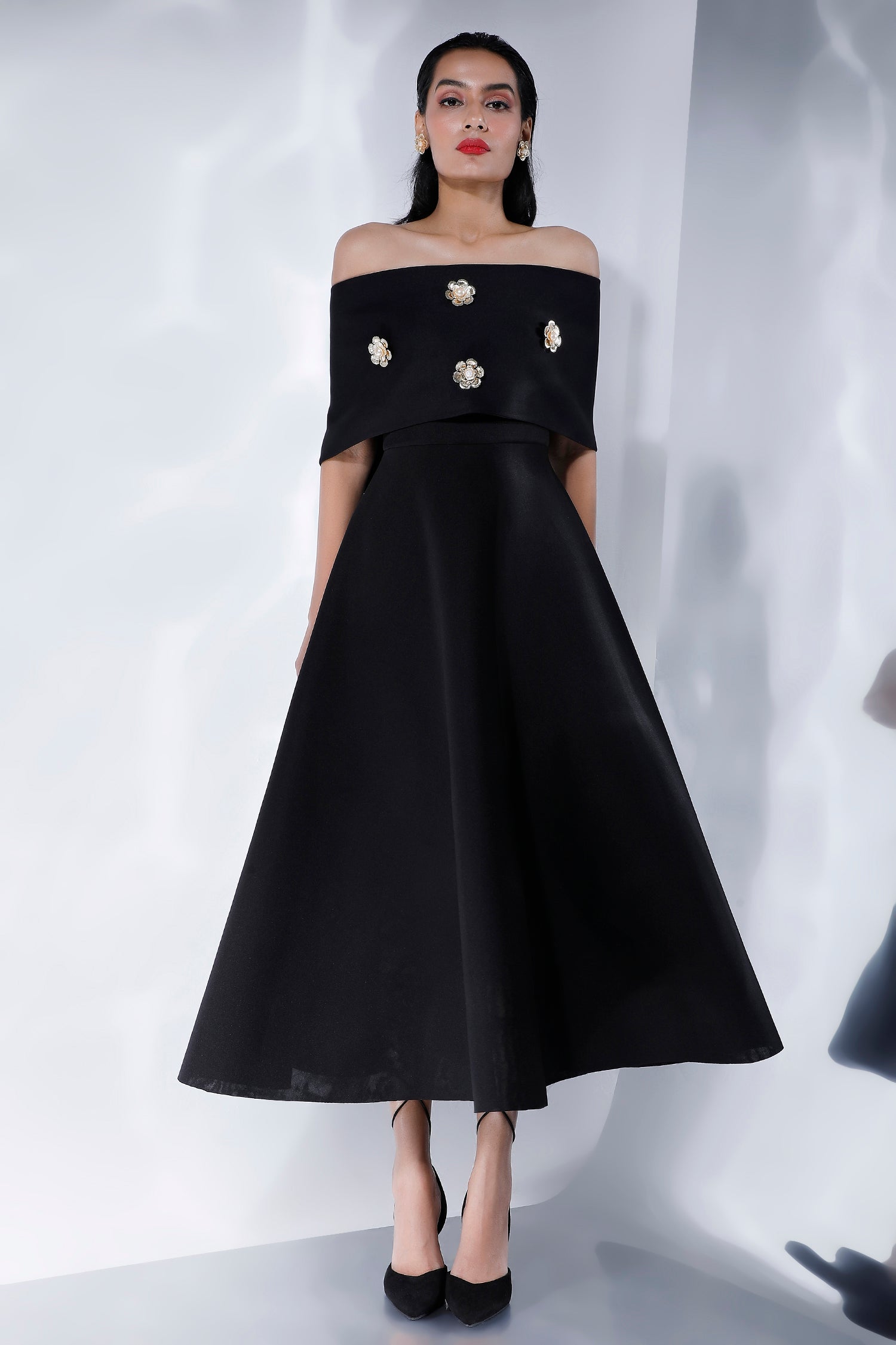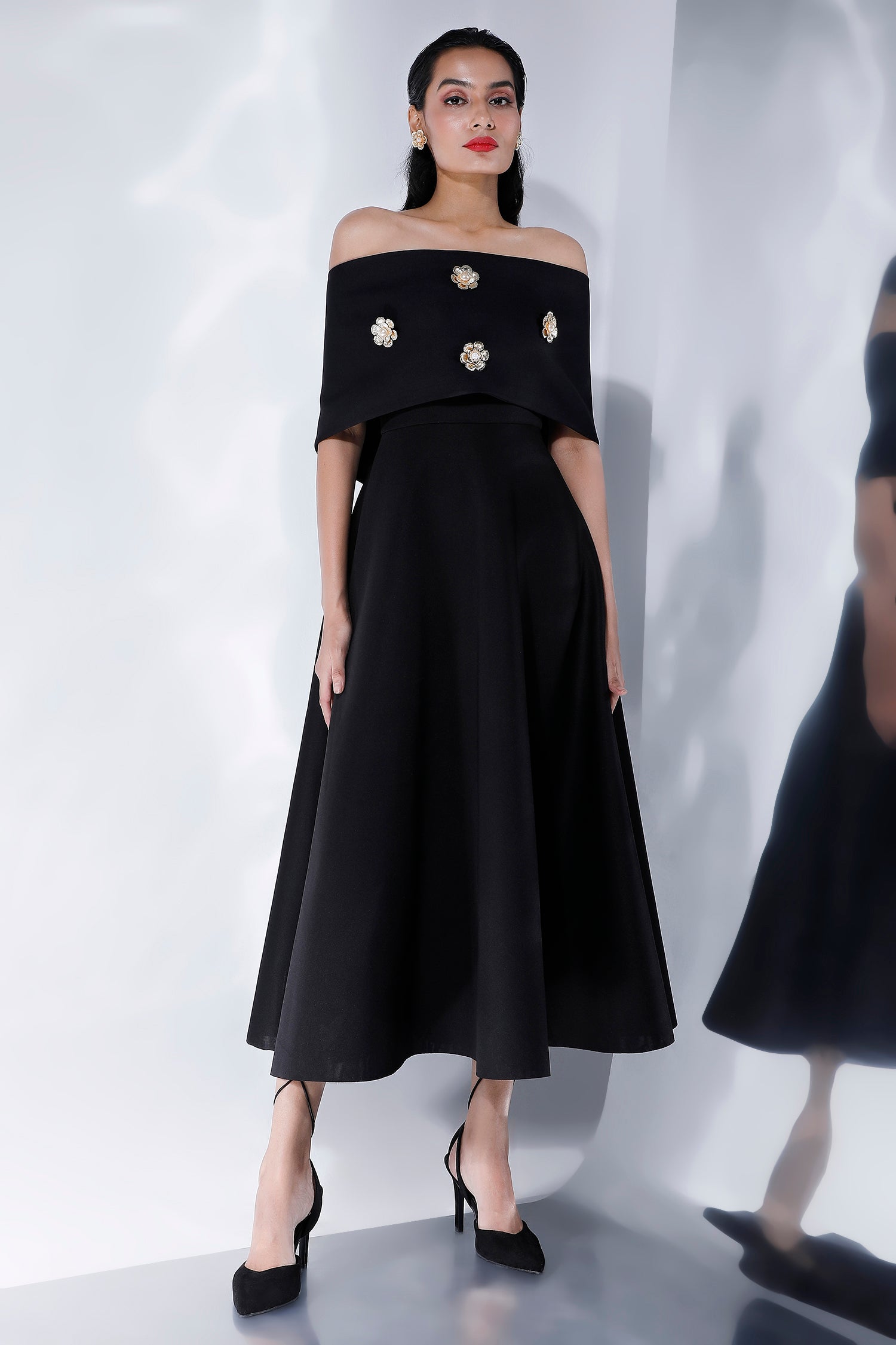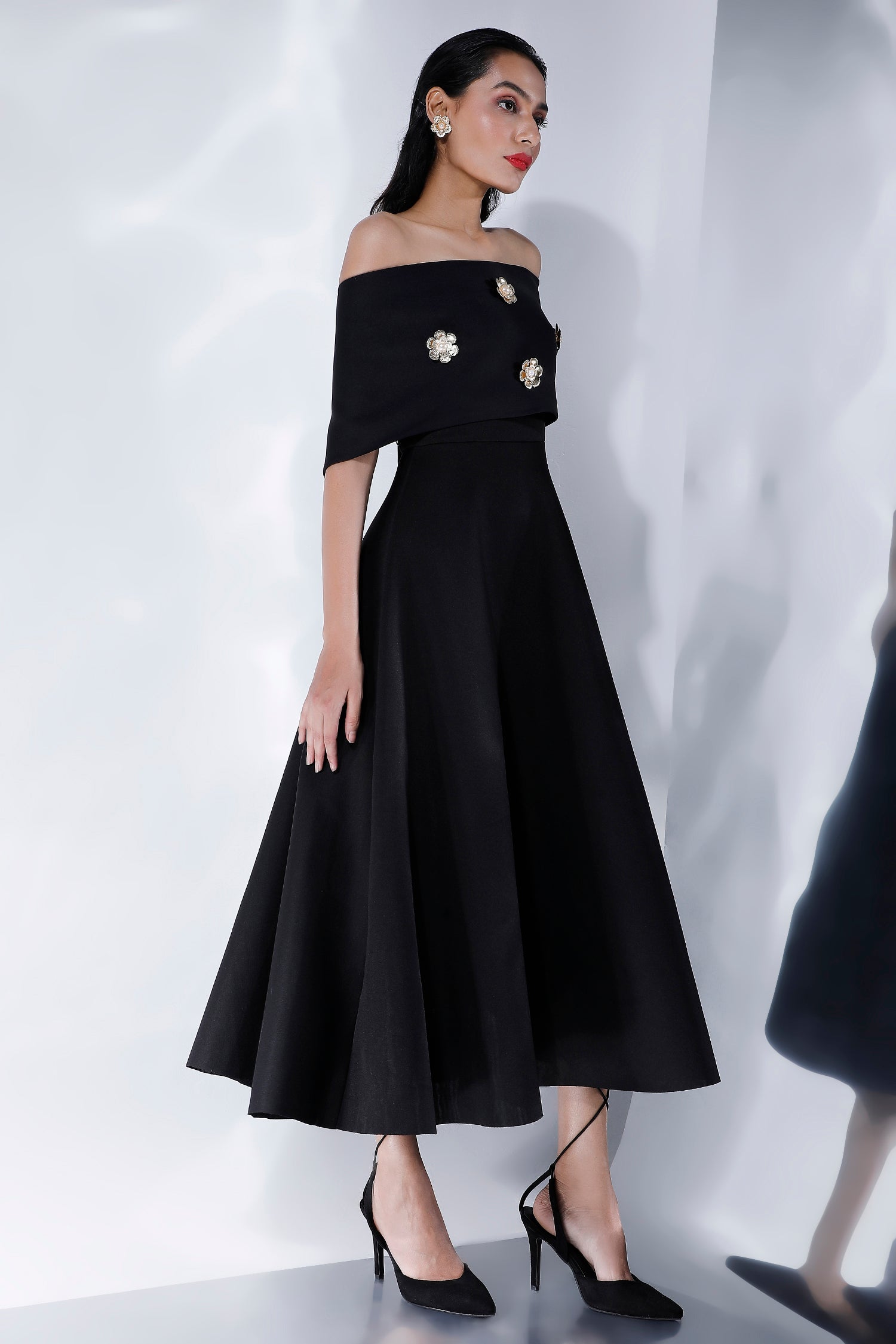 Featuring a detachable wrap with embellished flowers in gold. The wrap can be worn over one shoulder too.