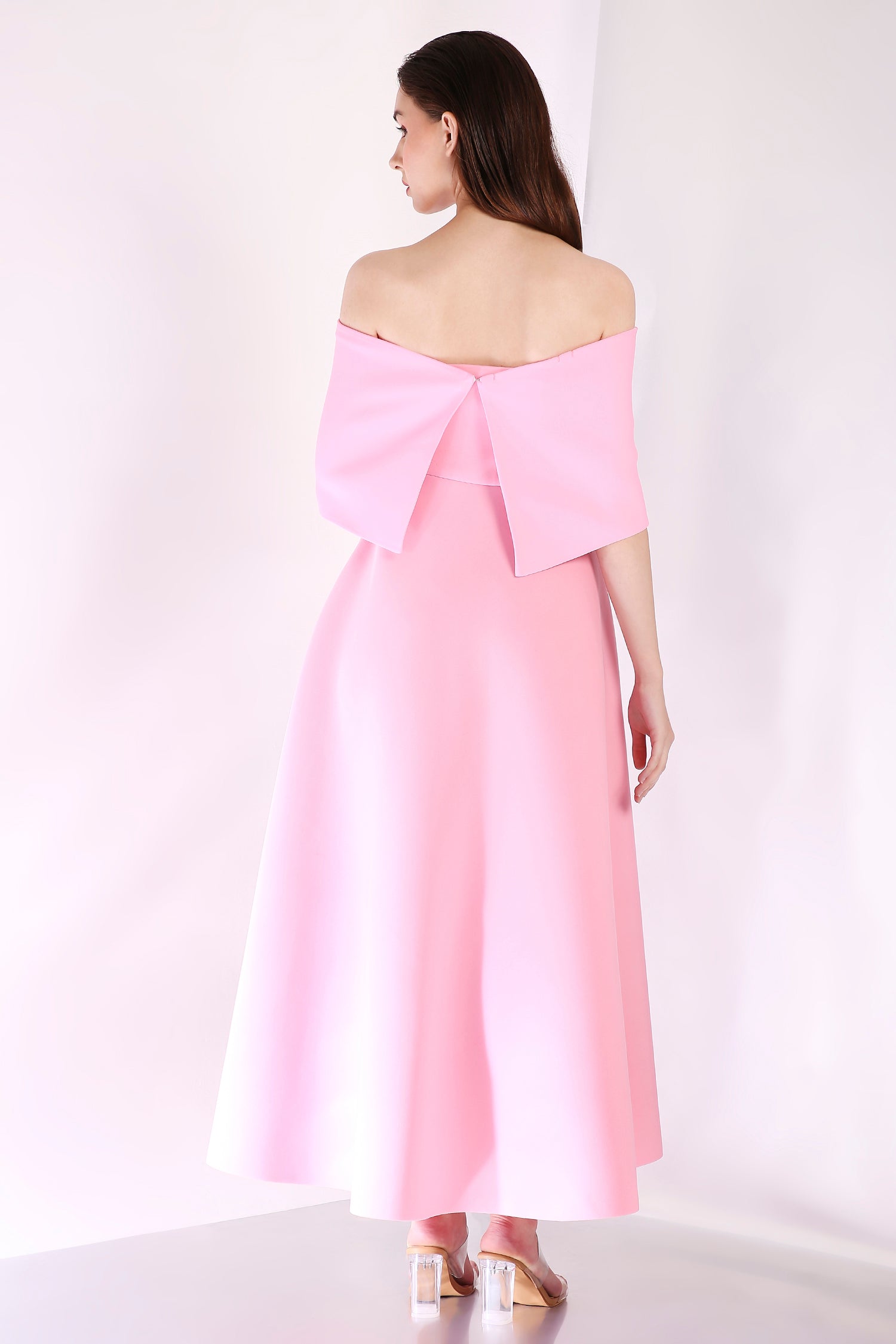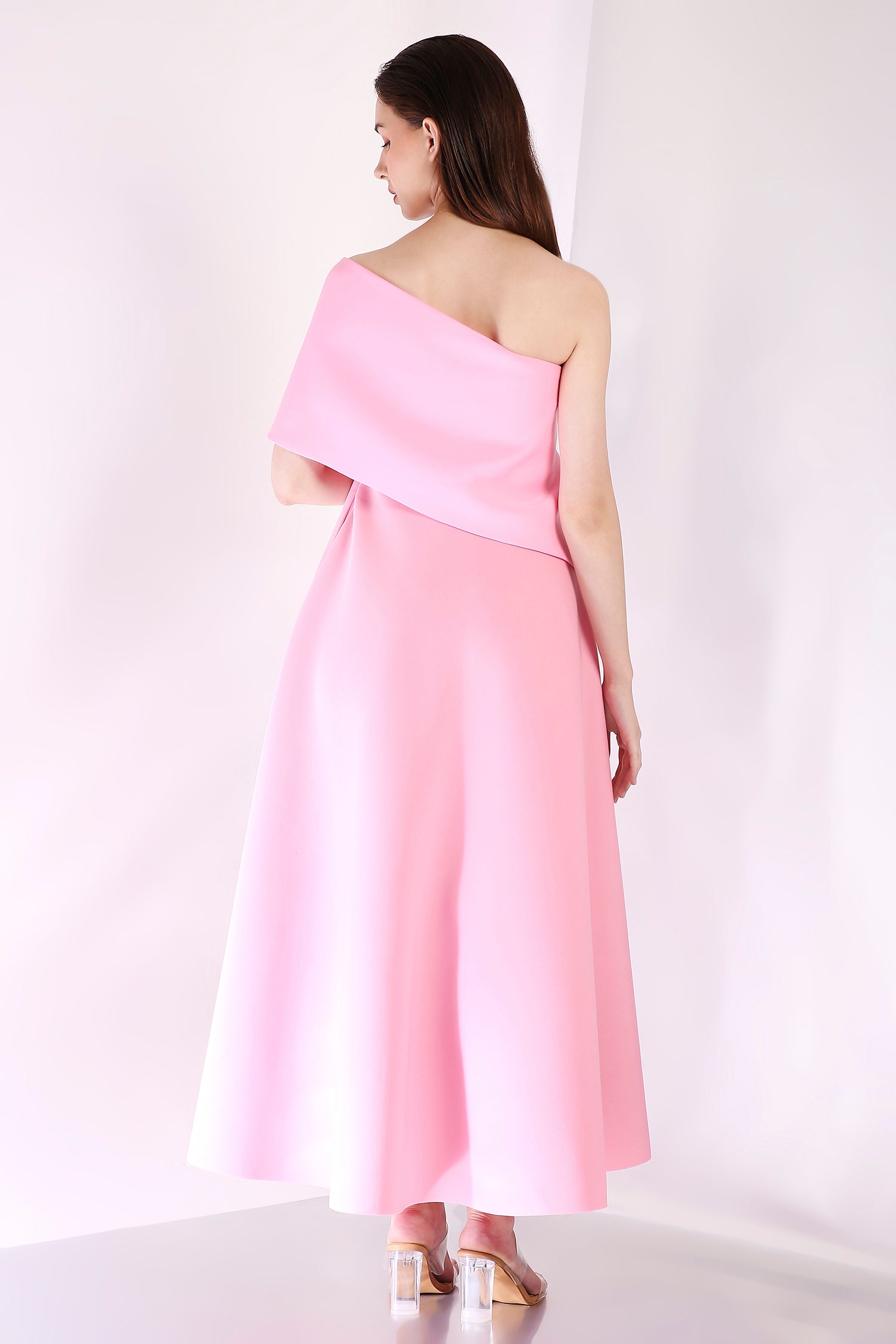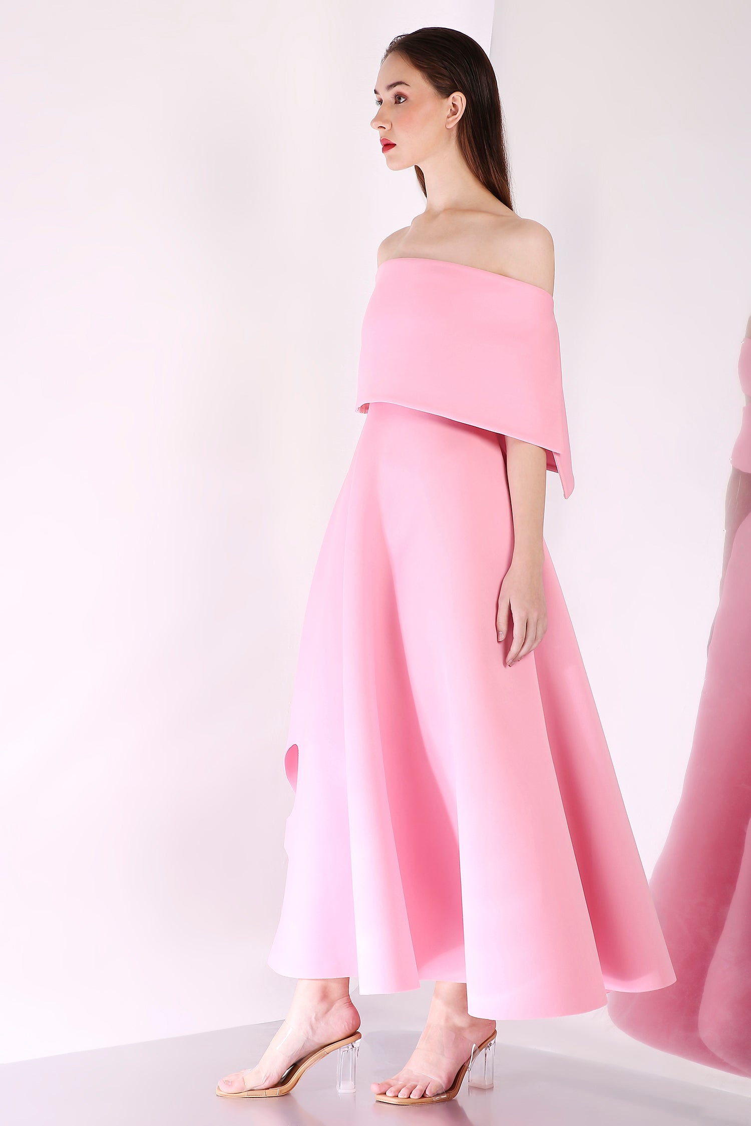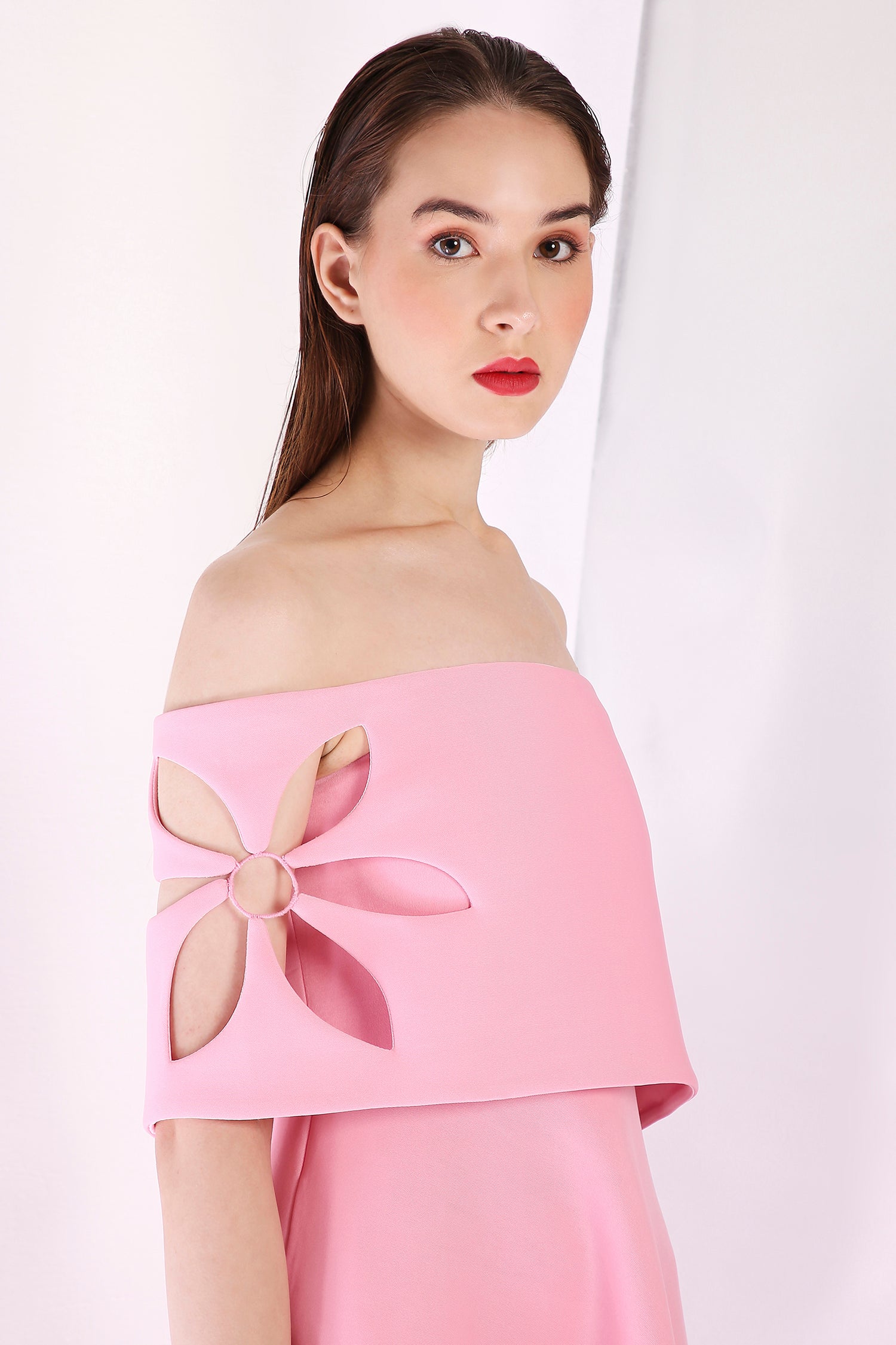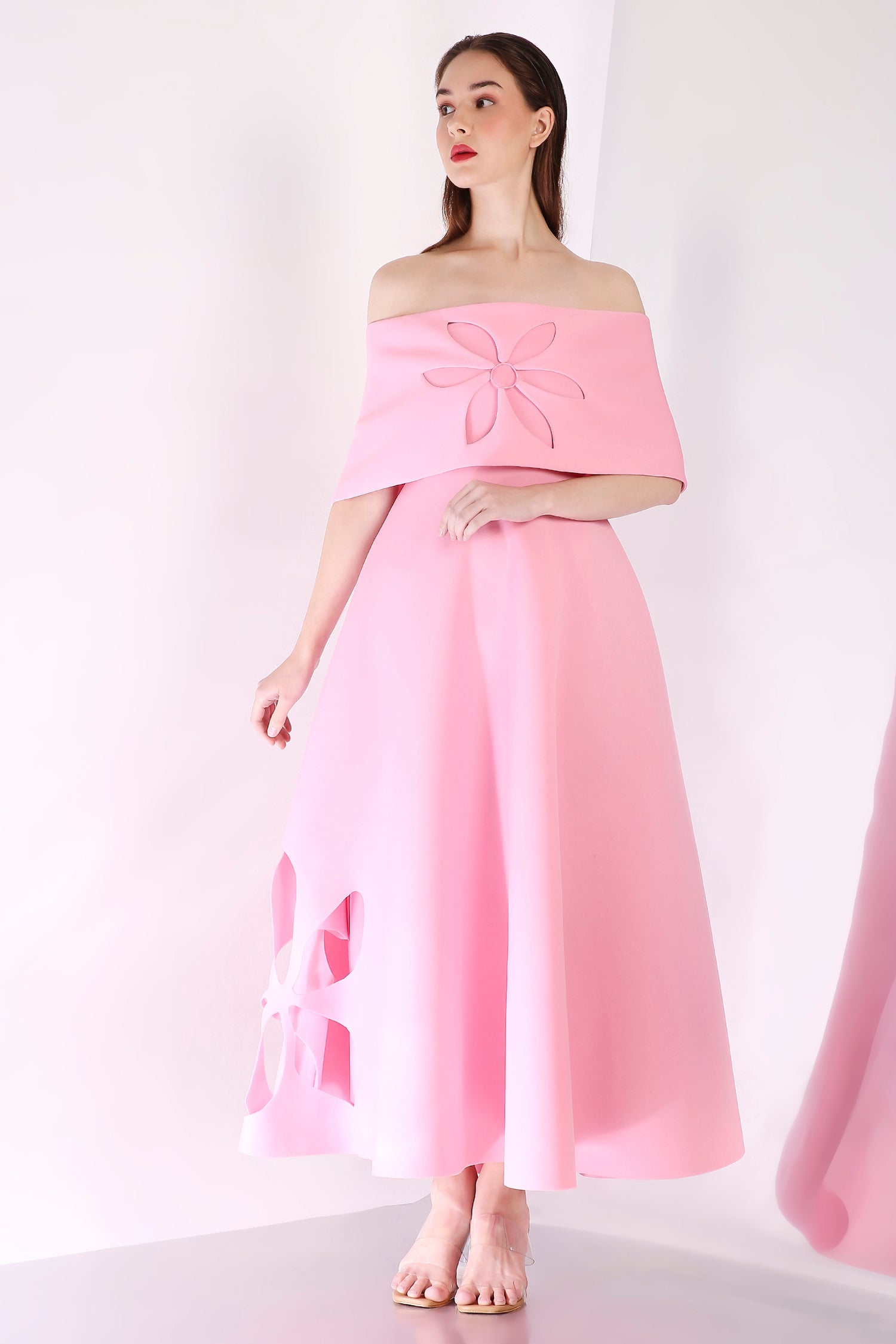 A strapless fit-and-flare dress in premium neoprene with a cutout floral motif on the hem, complemented by a cutout wrap that can be styled one-shoulder or off-shoulder. This ensemble offers chic versatility and refined elegance.