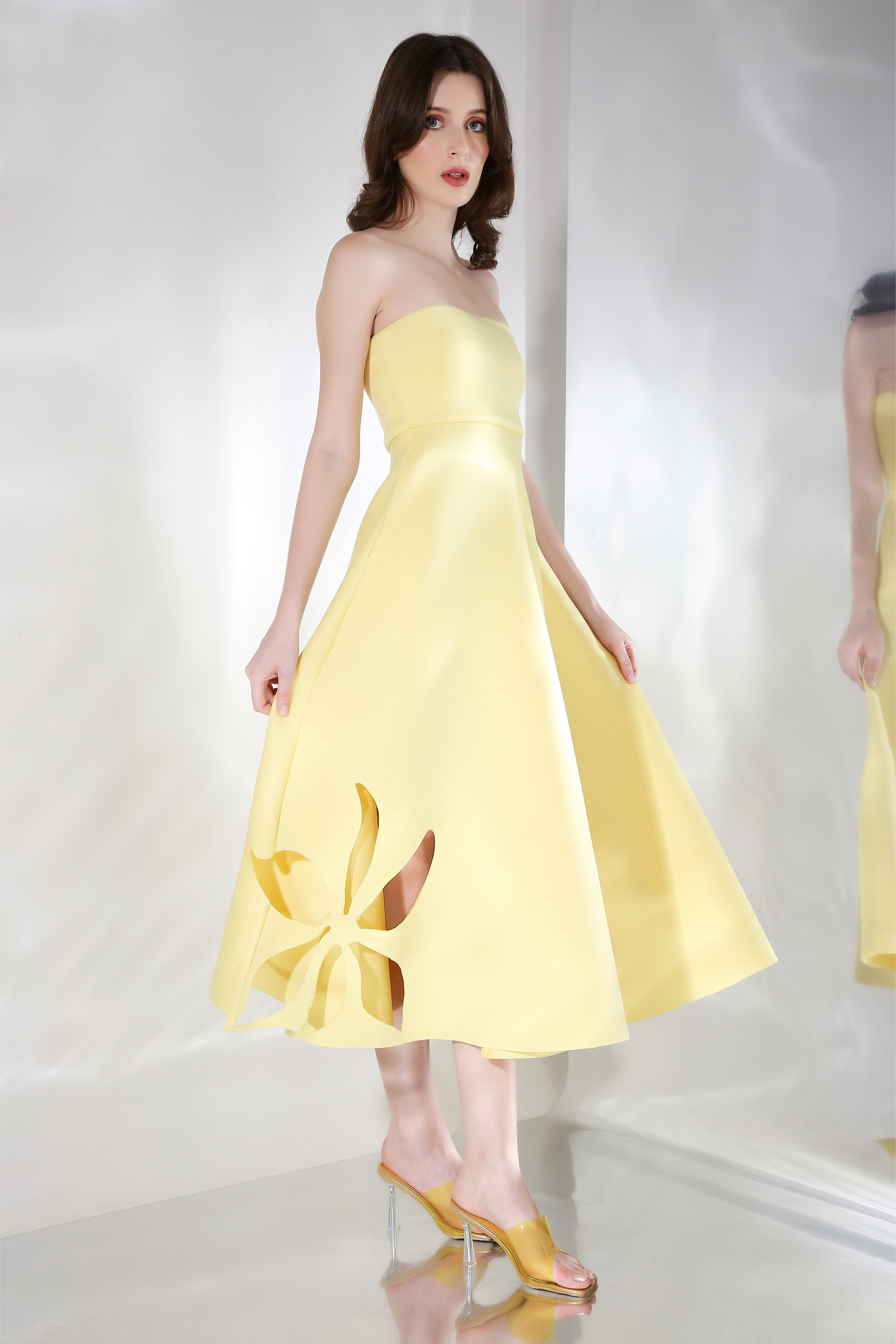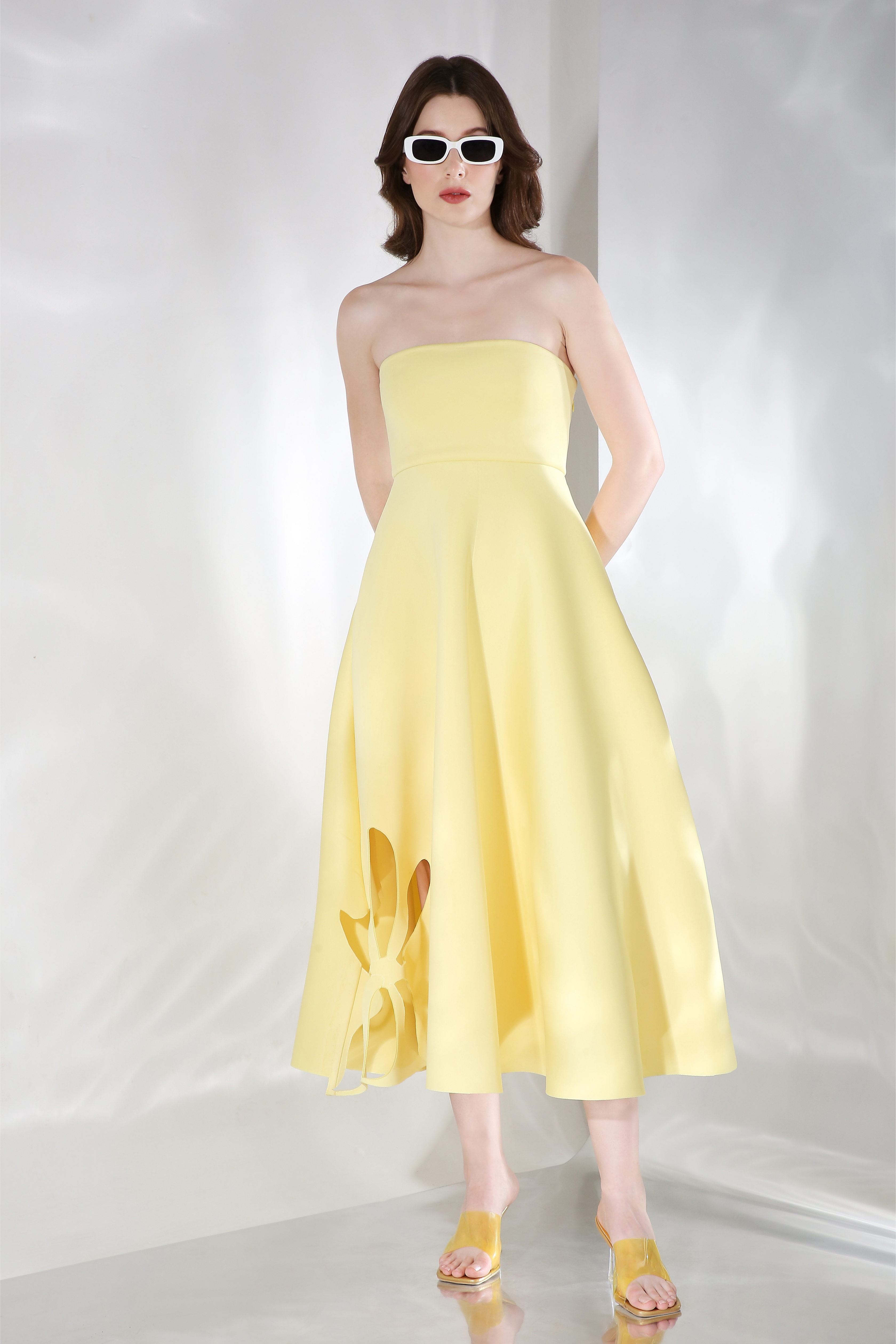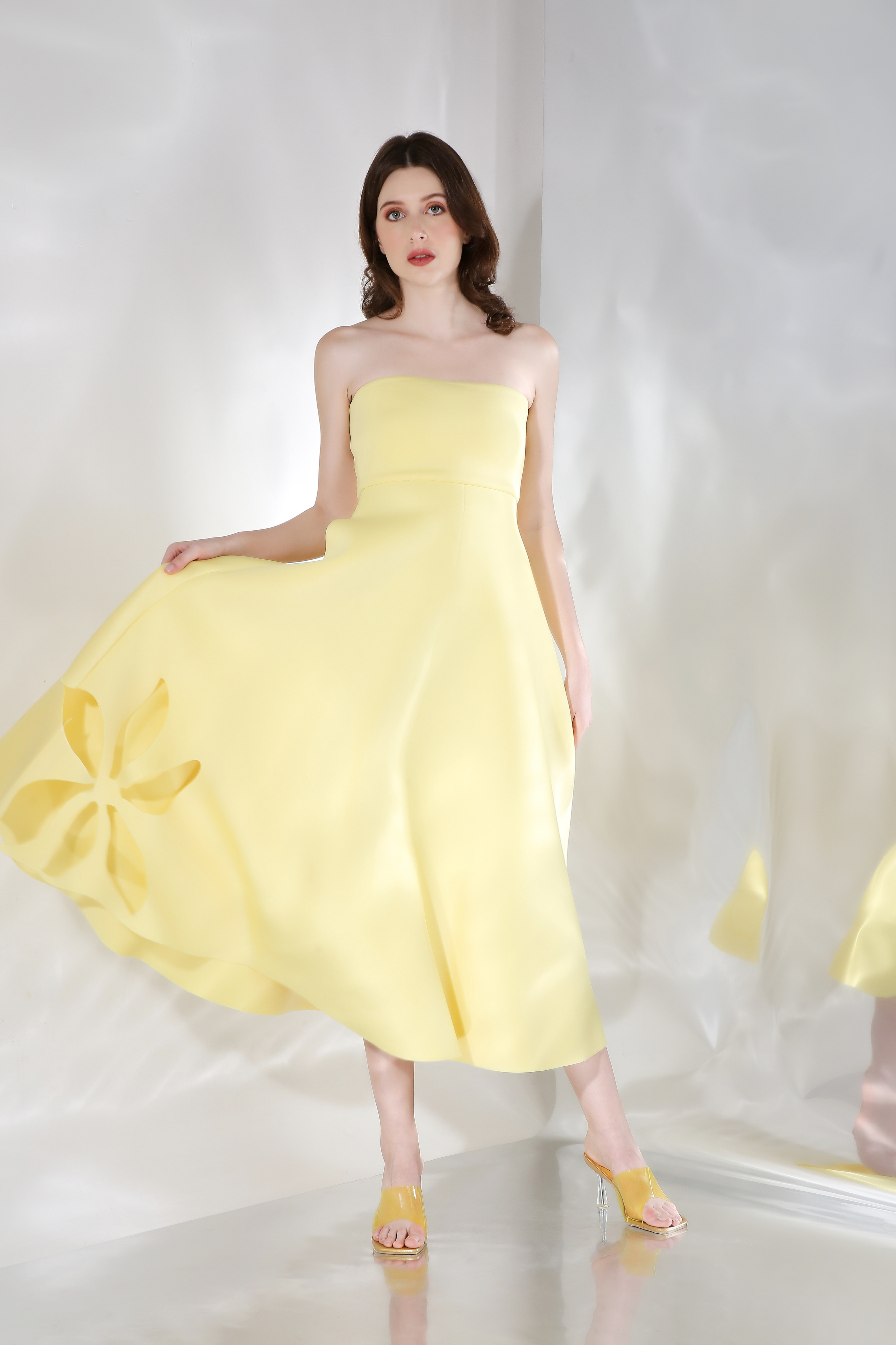 Featuring a fit and flare dress with floral cutouts on the base and detachable. Wear it in three ways,