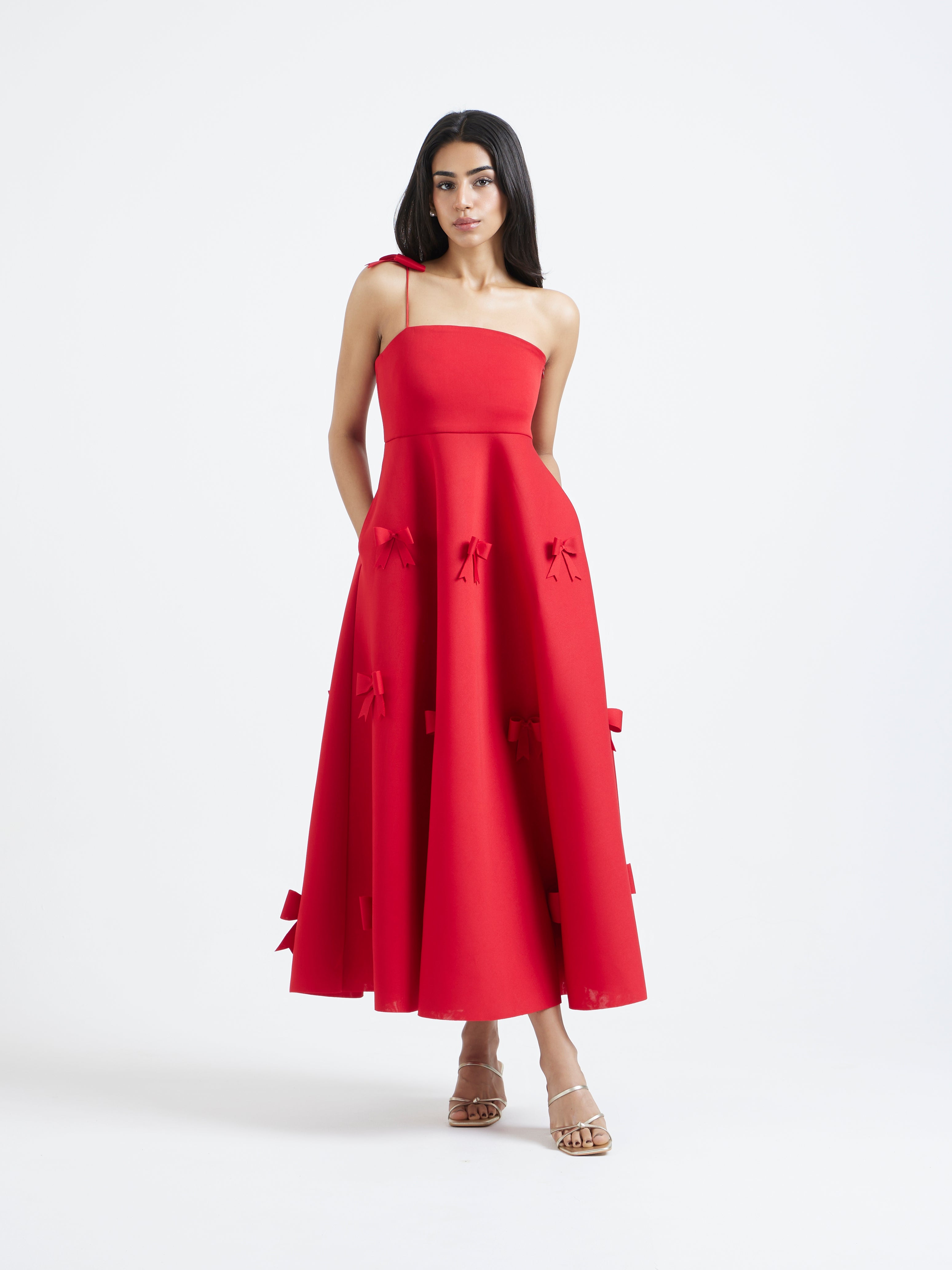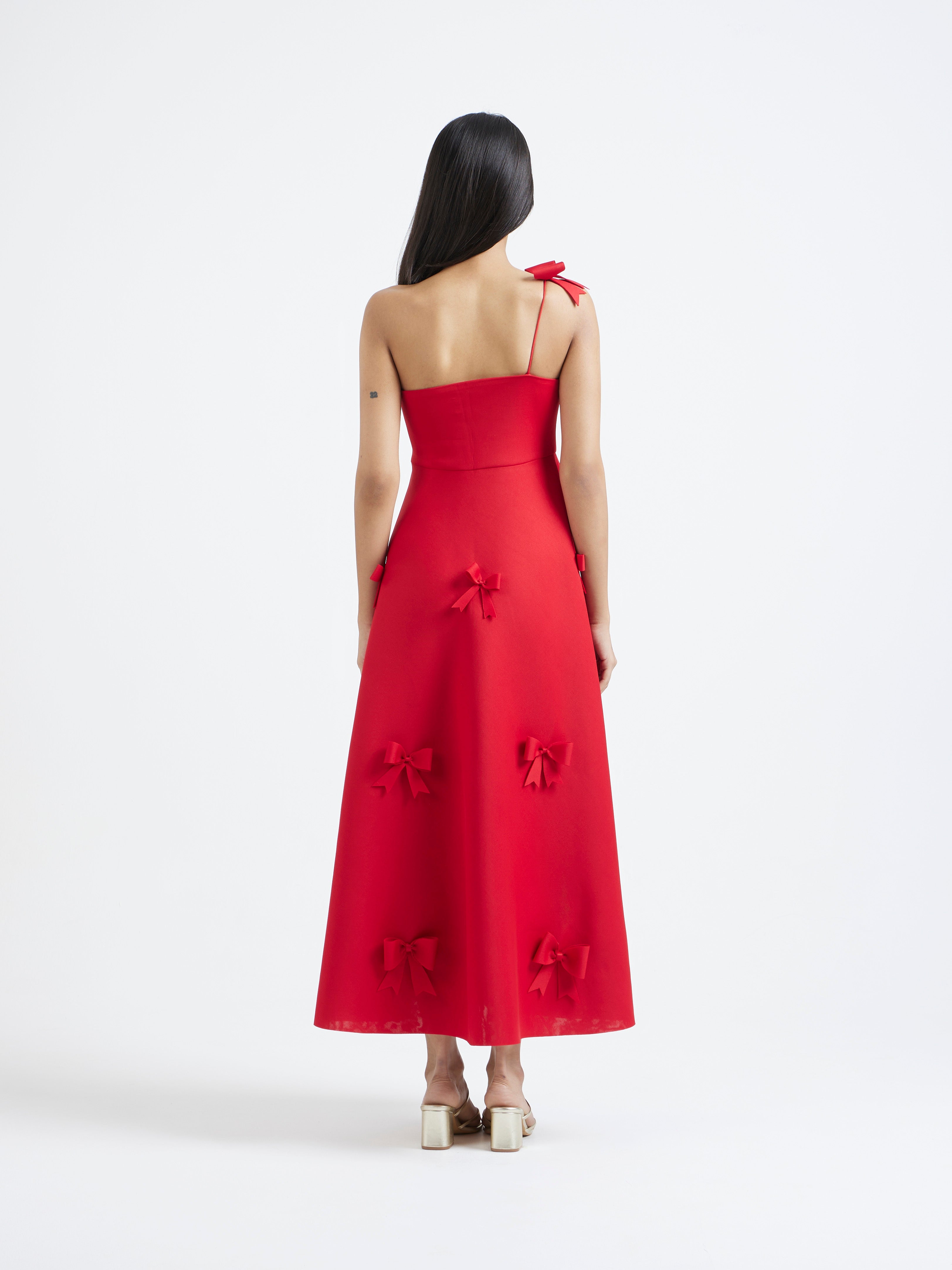 An exquisite fit-and-flare midi dress, rendered in luminous scarlet. It features a graceful straight neckline and a delicate bow strap. The flare is adorned with meticulously placed three-dimensional bow appliques, creating a look of pure, unforgettable elegance.