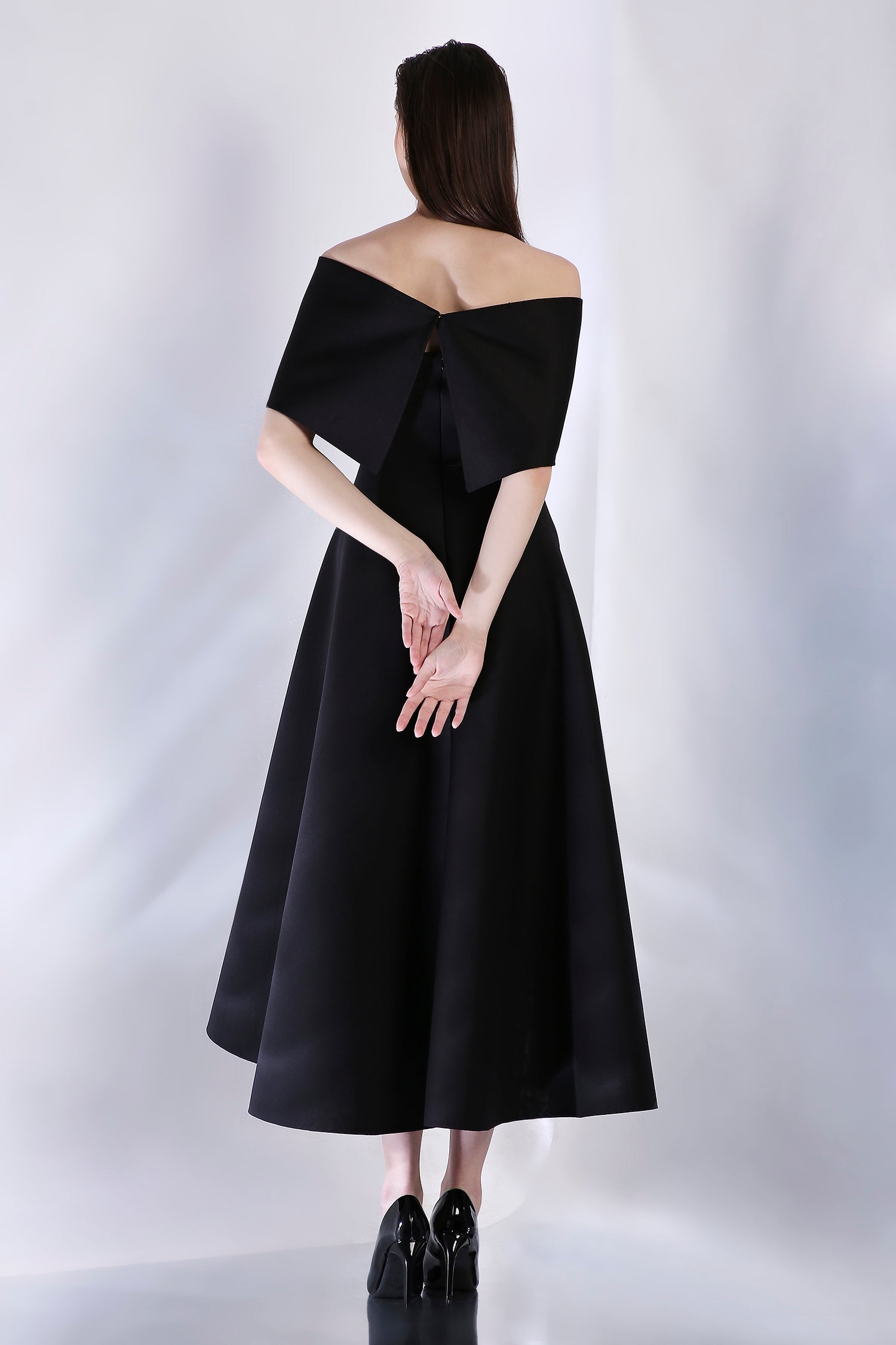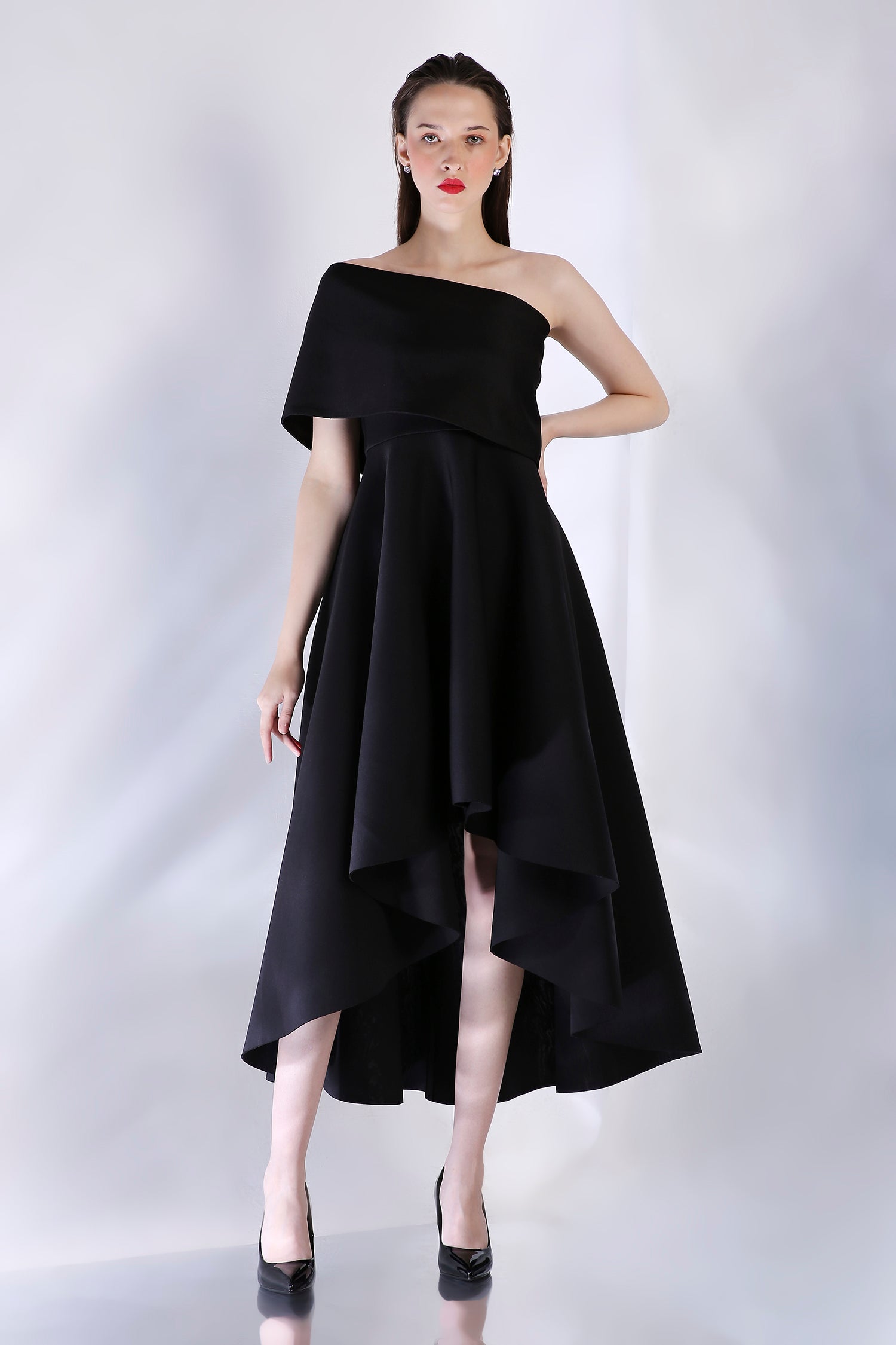 Introducing the Classic Imperial dress—a black, strapless high-low fit-and-flare piece designed to flatter every curve. This chic silhouette pairs beautifully with any of our signature wraps, available for separate purchase, allowing you to elevate the look for any occasion.
