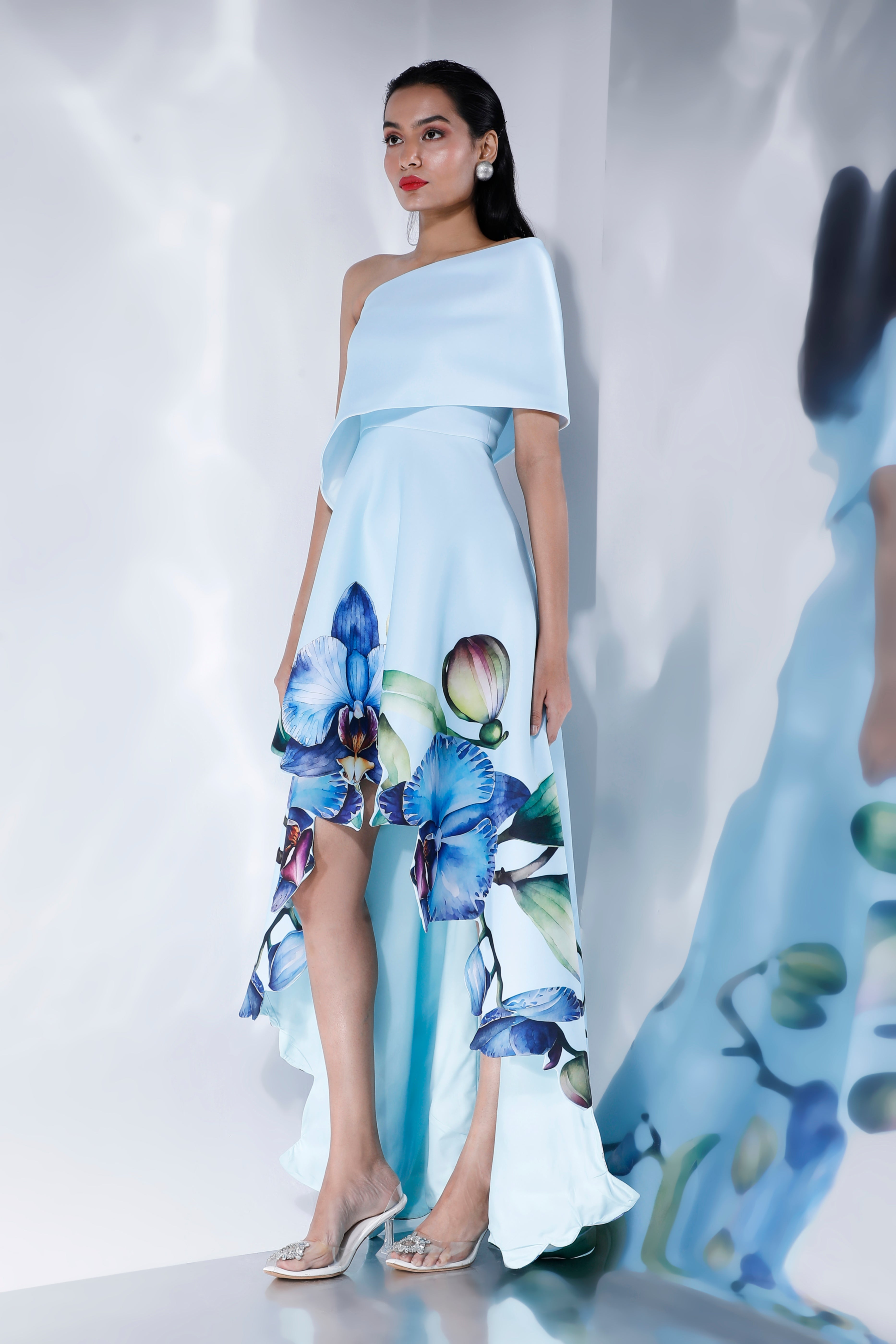 The Oriana dress embodies elegance with its intricate floral design, emphasised with cutwork around the hem and a flowing high-low silhouette.