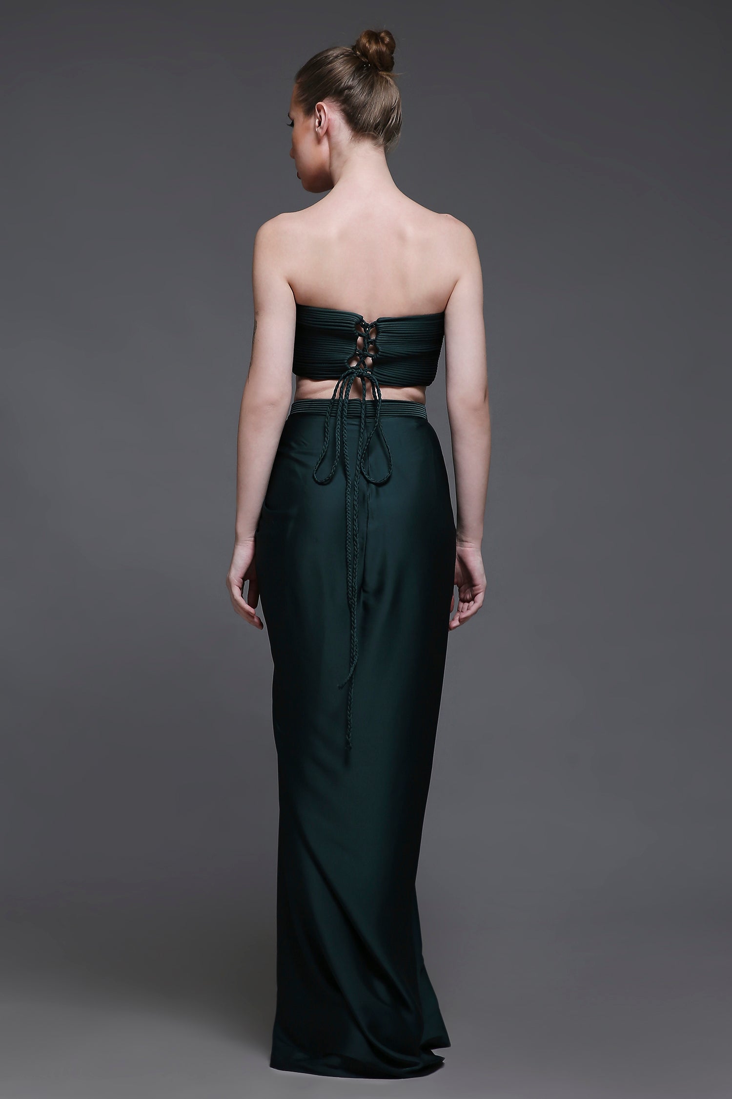 The corset top features intricate cord detailing along a structured neckline, with a tie-up back for a customisable fit that flatters and supports. It’s paired with a draped mini skirt, designed for graceful movement and a touch of drama.