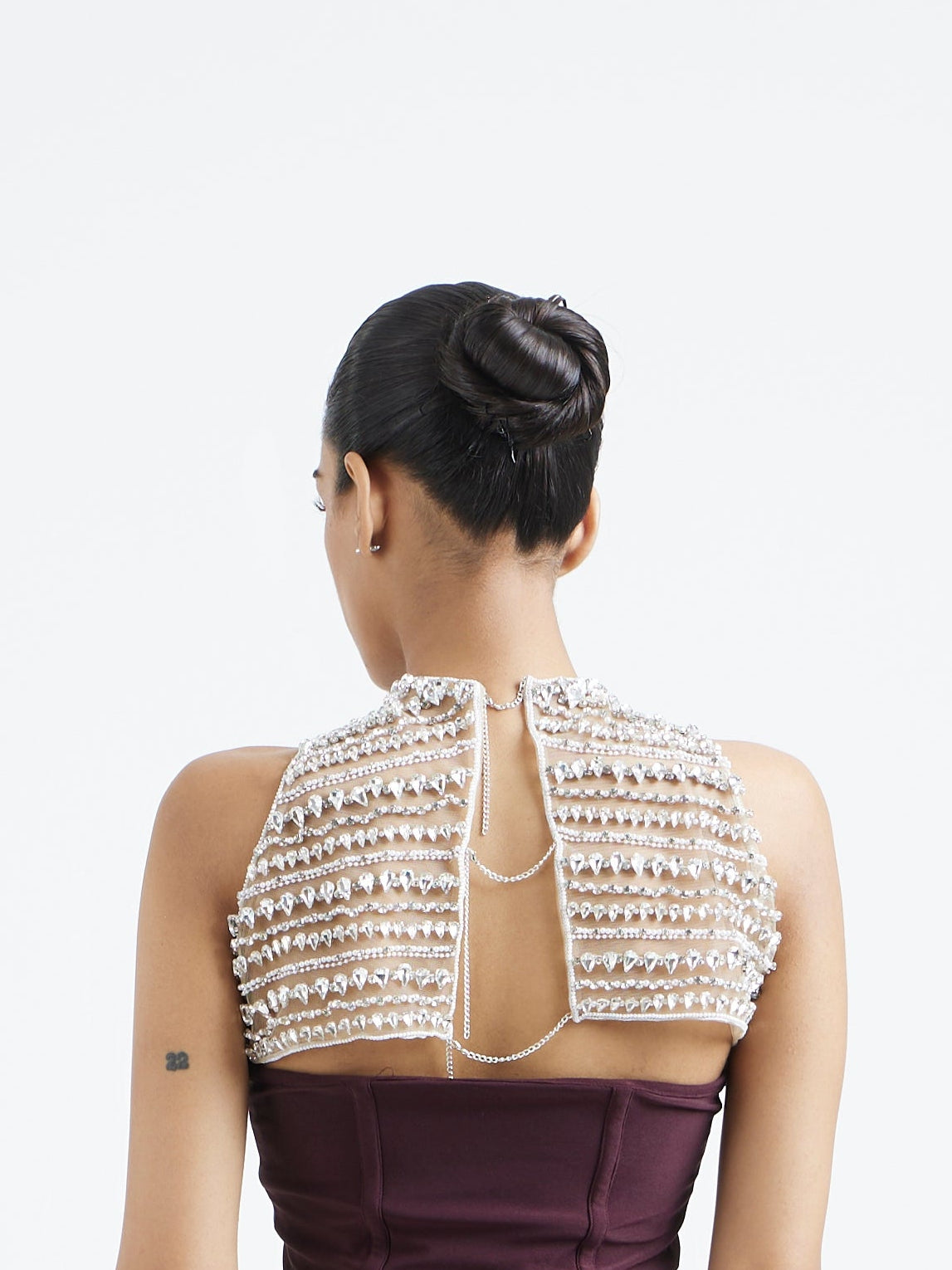 The bodice is elevated with an embellished, detachable stone overlay, hand embroidered to form a luminous neckline that feels both modern and regal.