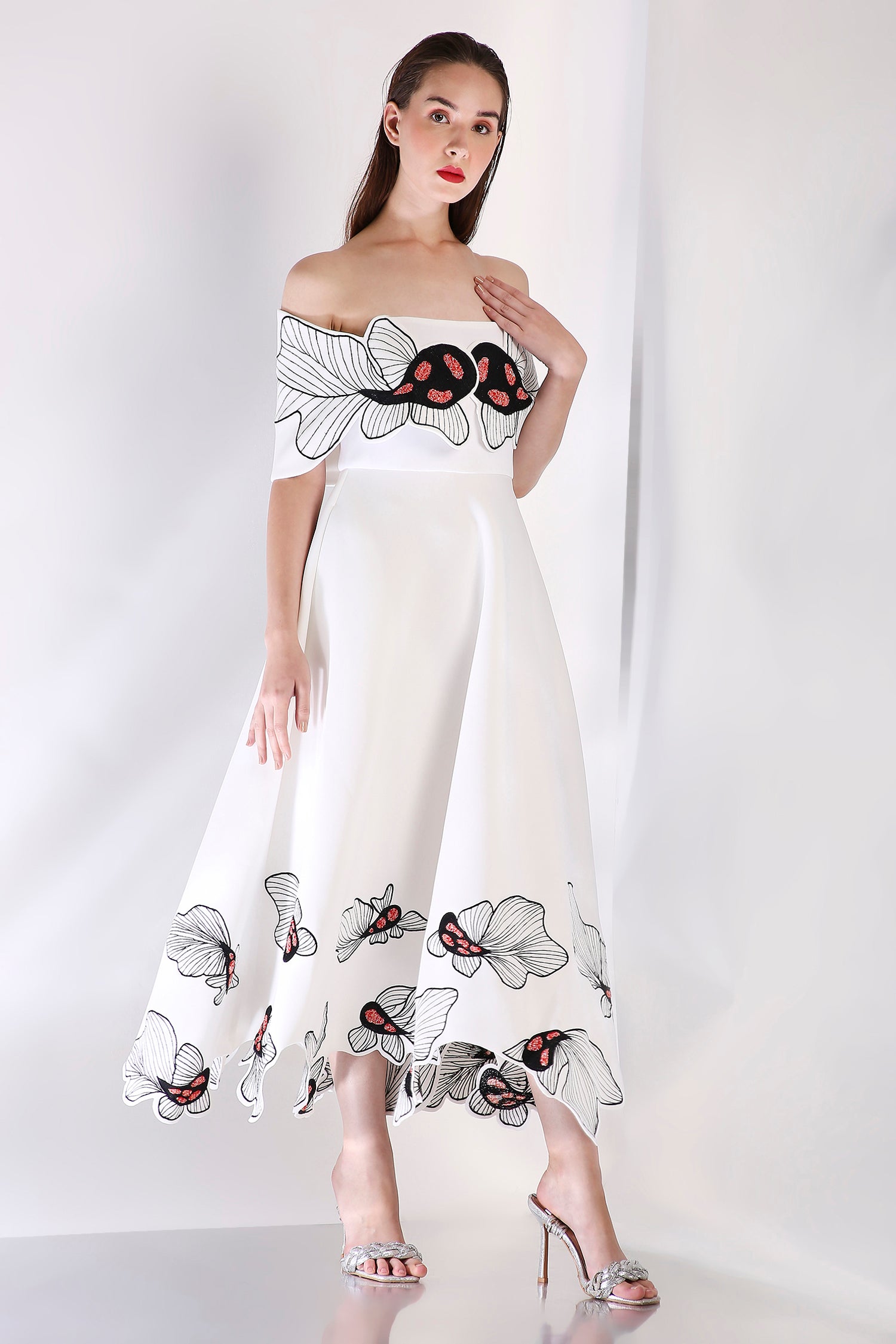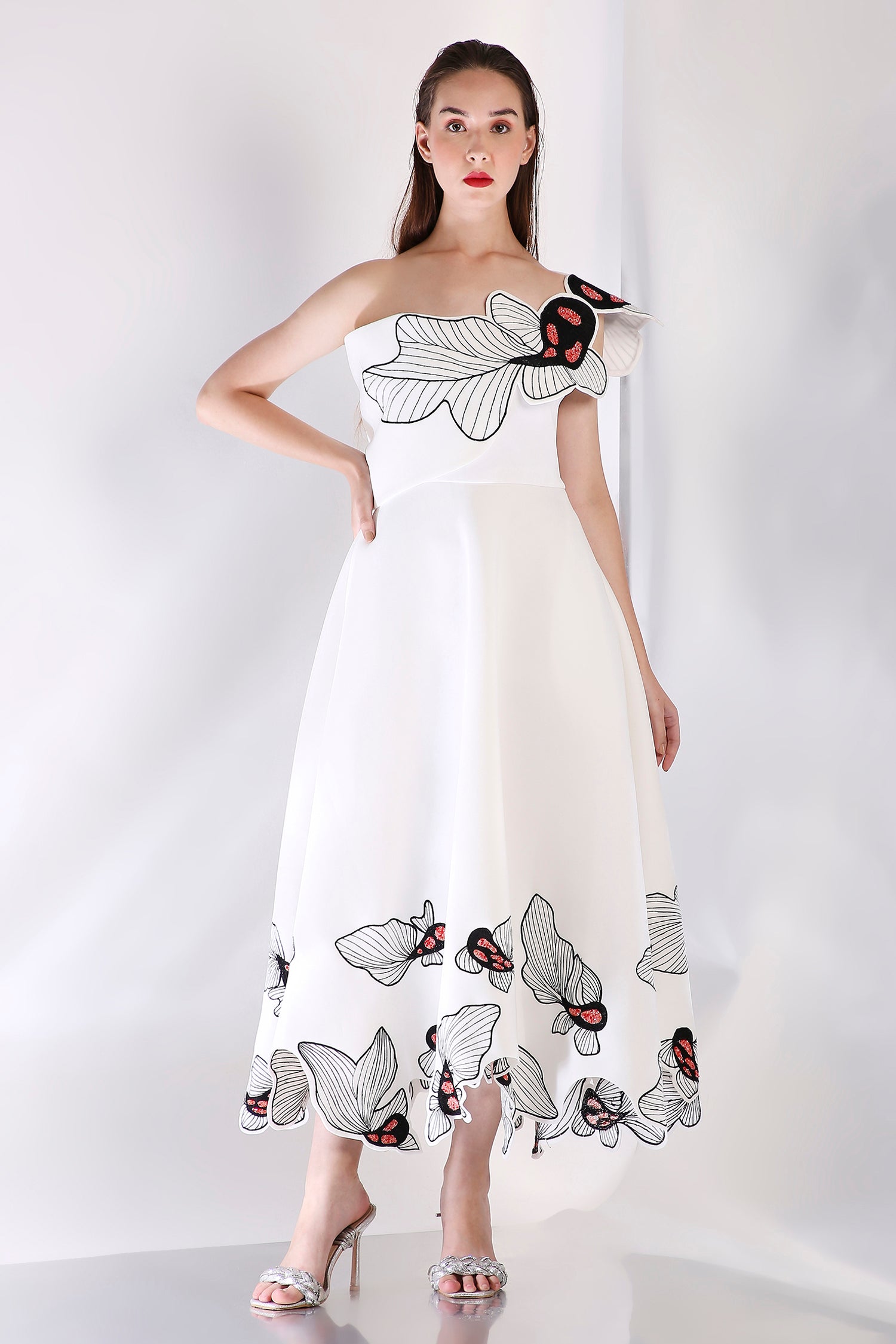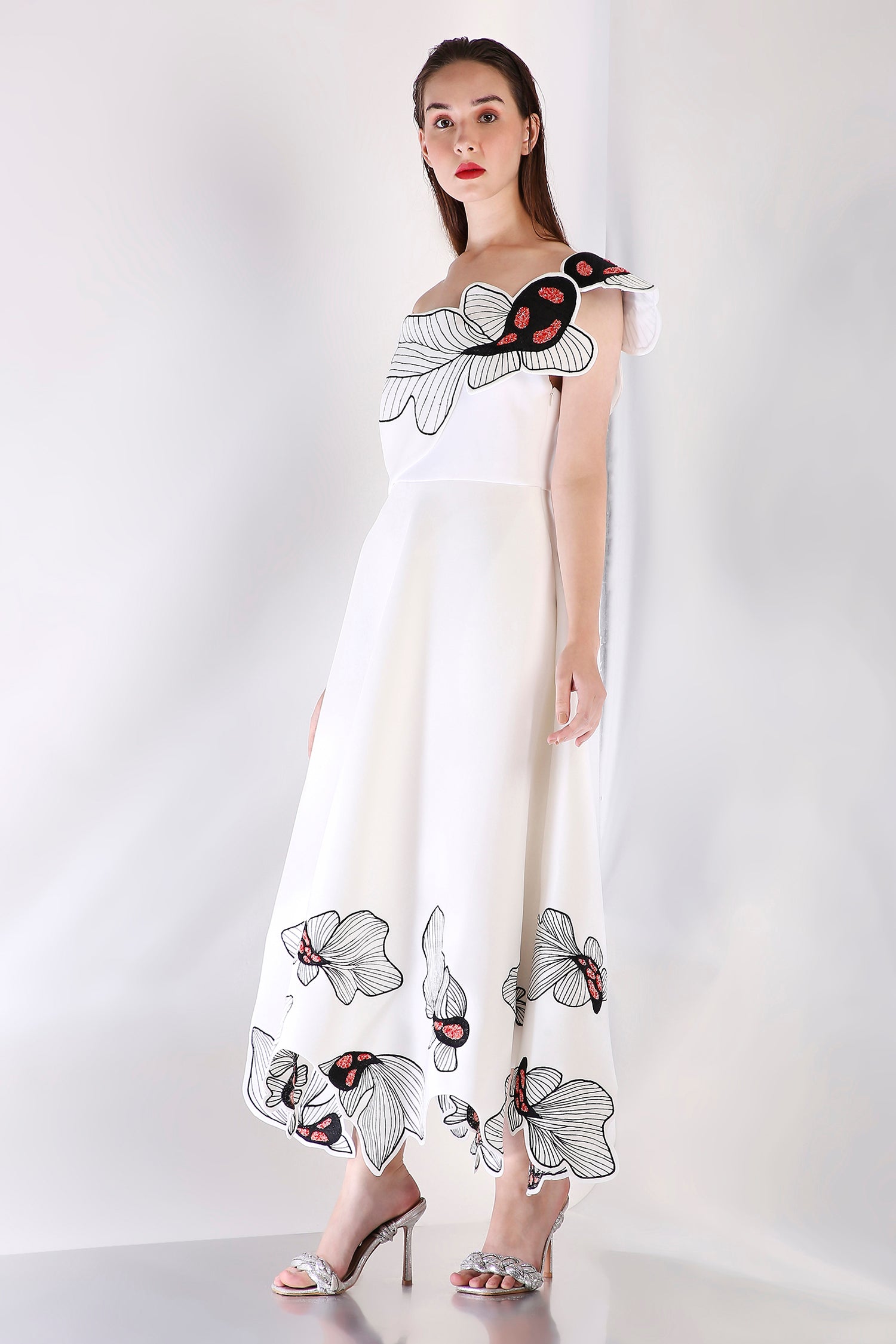 The Koia Fish dress embodies elegance with its intricately hand embroidered design, emphasised with beads. The embroidery paired with hand work elevate the look of this dress.
