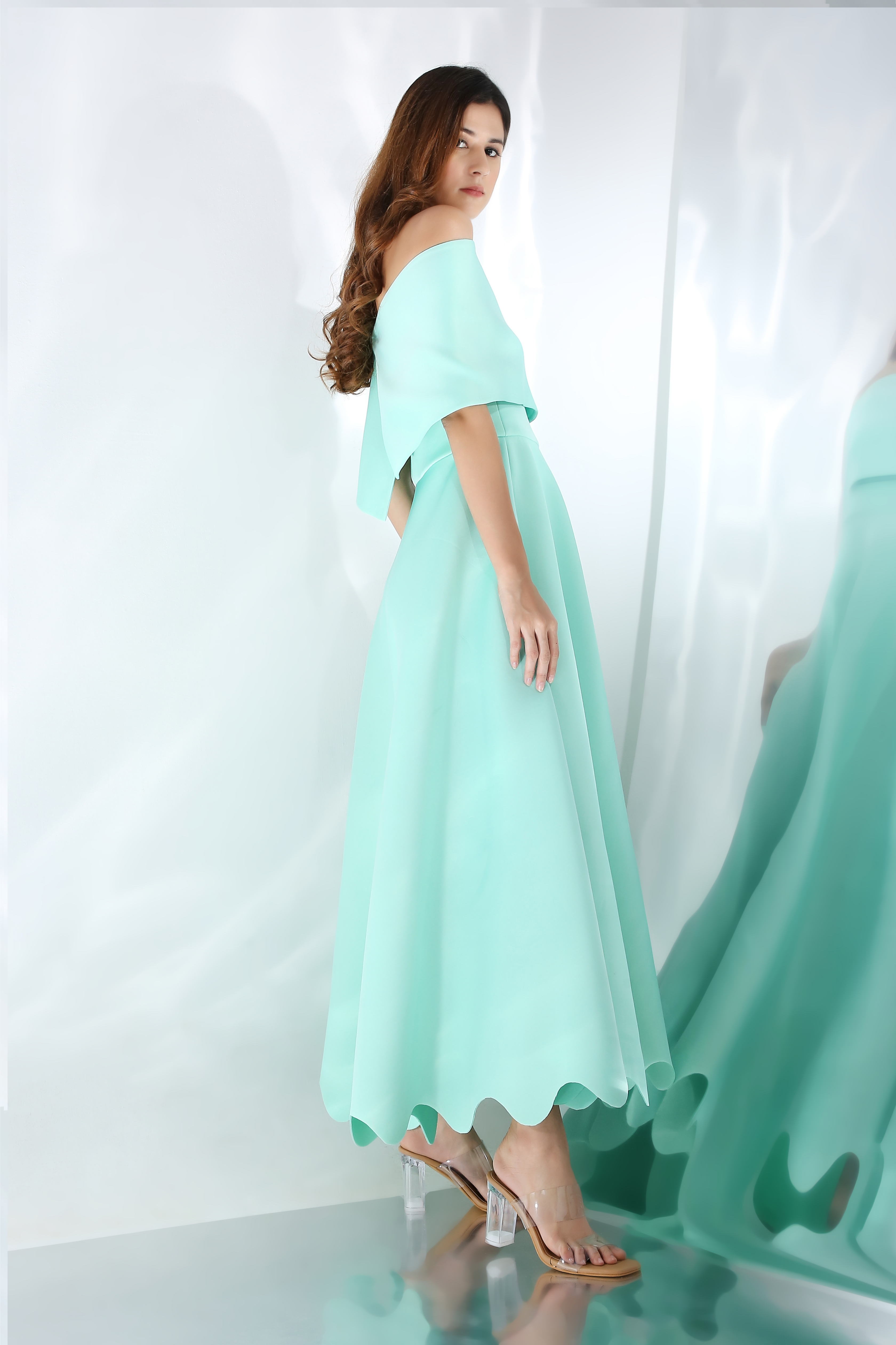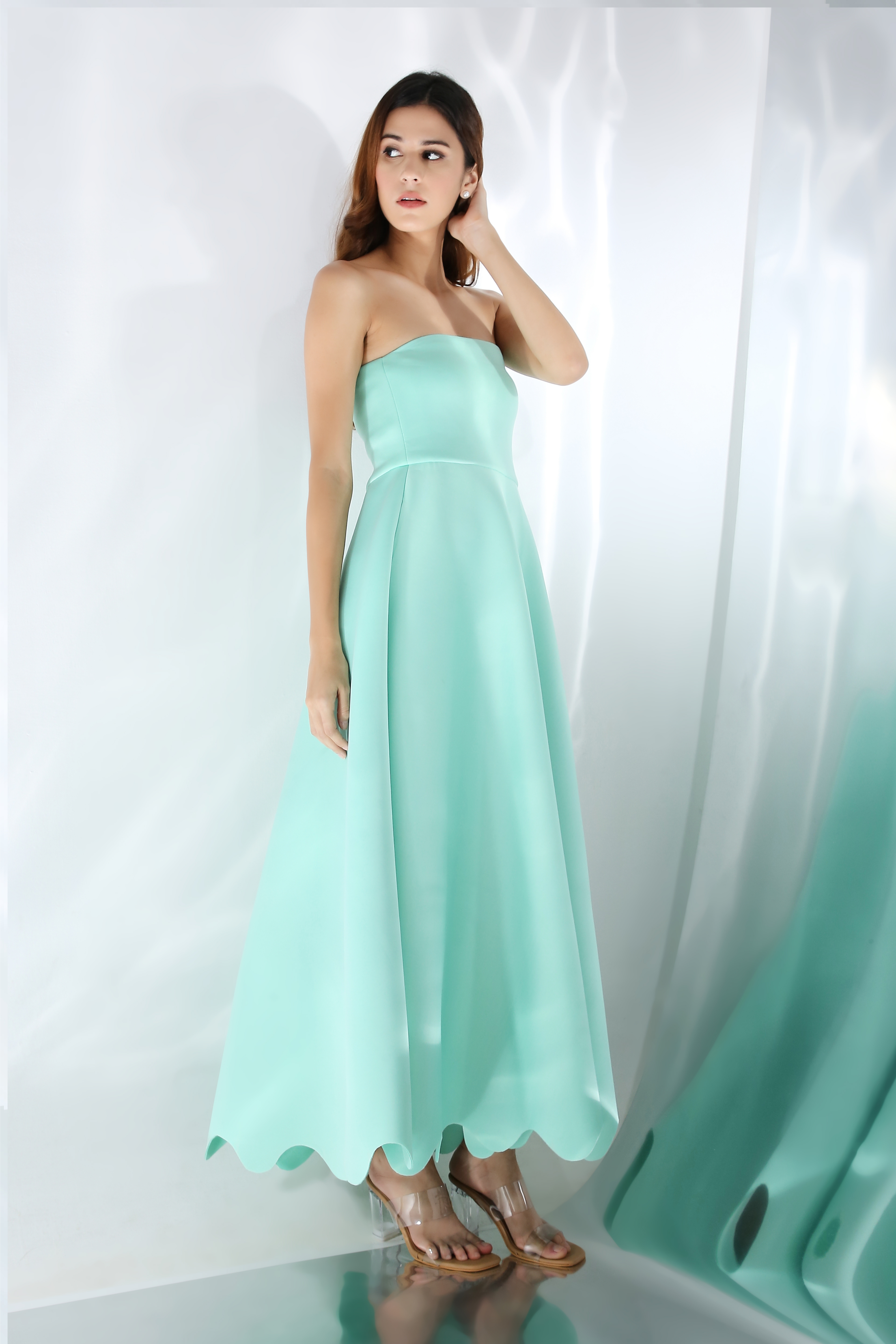 Featuring a fit and flare dress with scallops on the base. Wear it in two ways,