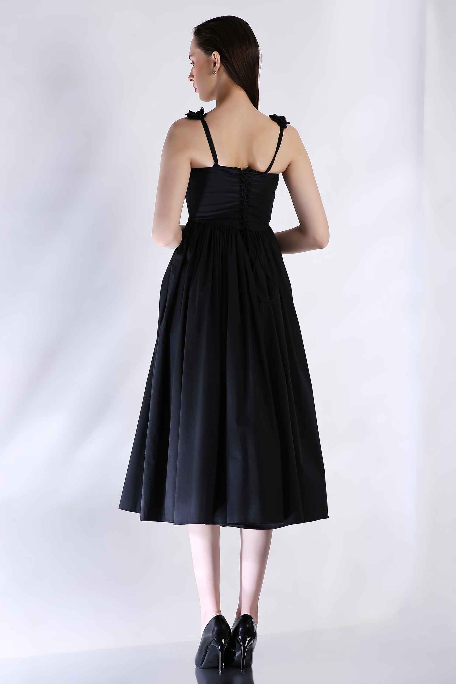 Embrace effortless elegance with our black mid-calf length dress, featuring delicate detachable straps and a gathered waistline for a flattering fit. This timeless silhouette flows gracefully, making it a versatile piece perfect for any occasion.