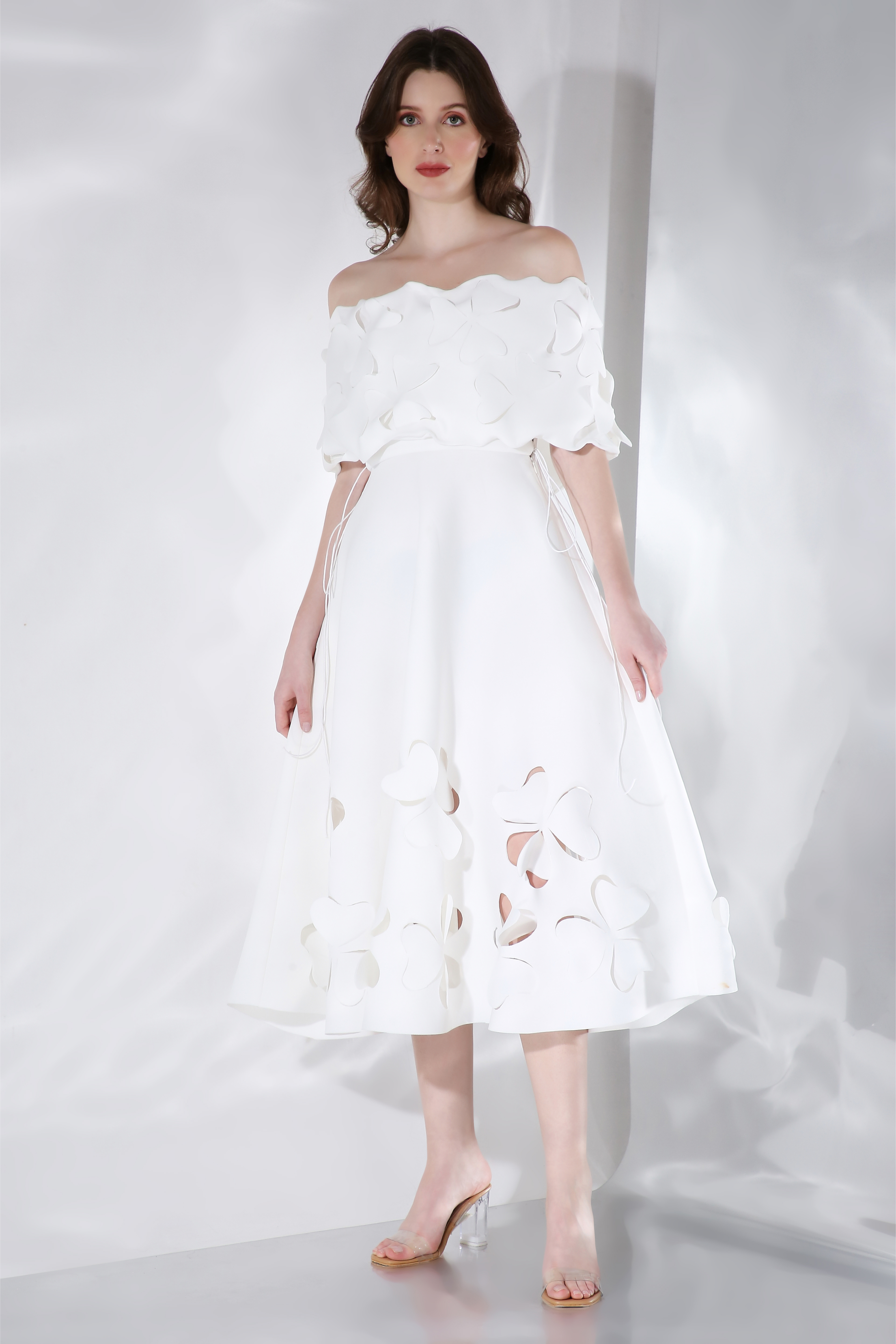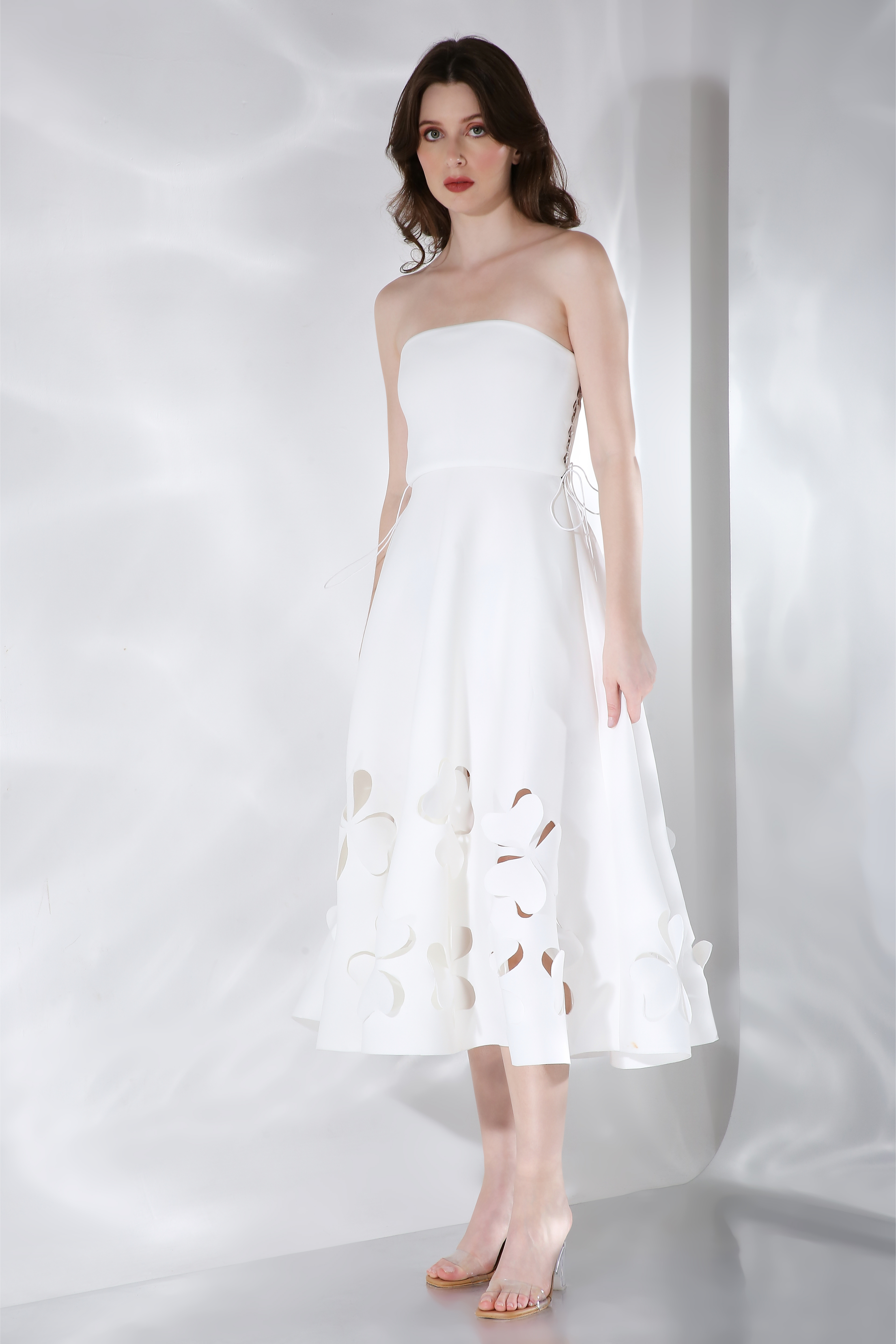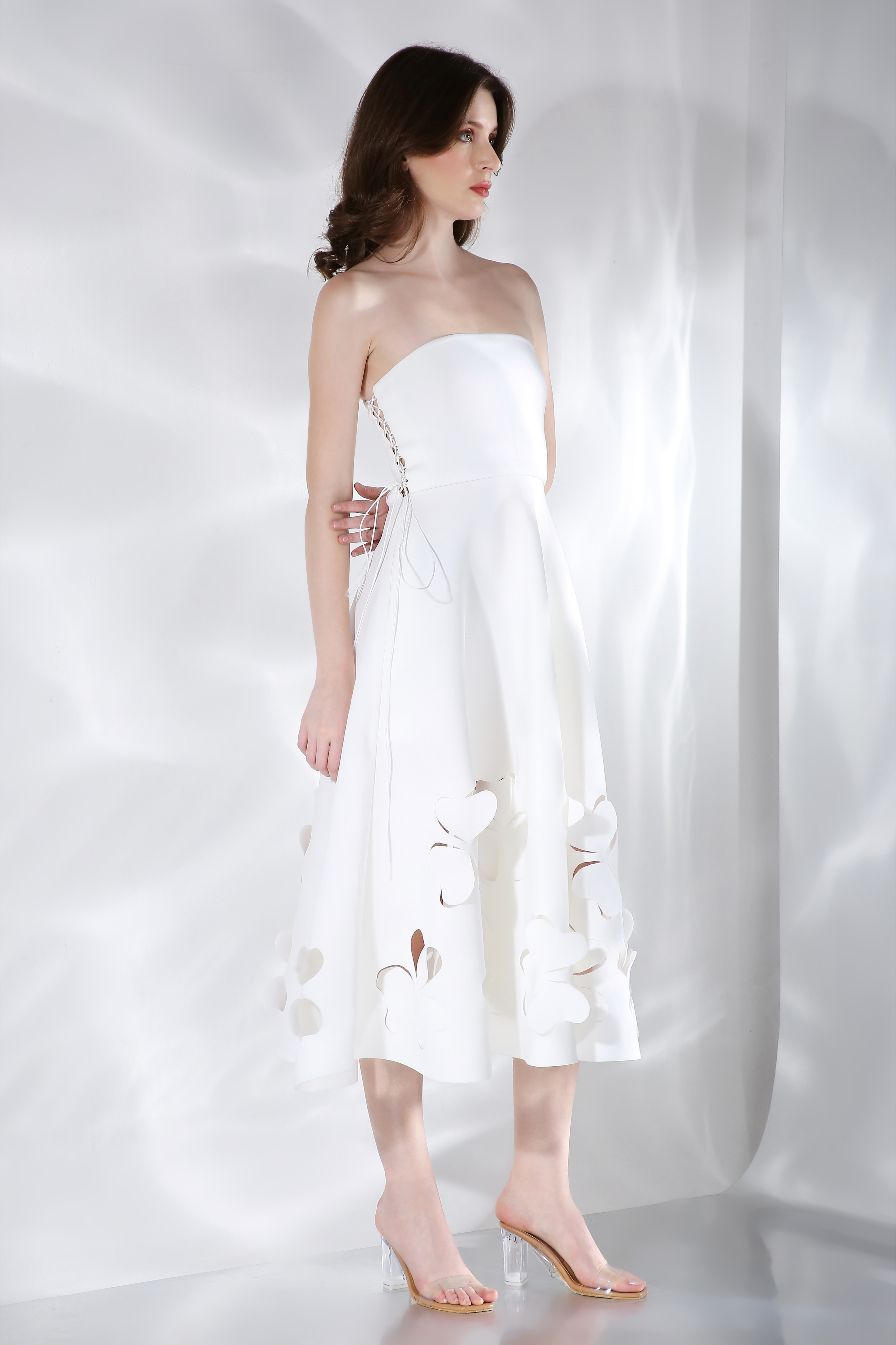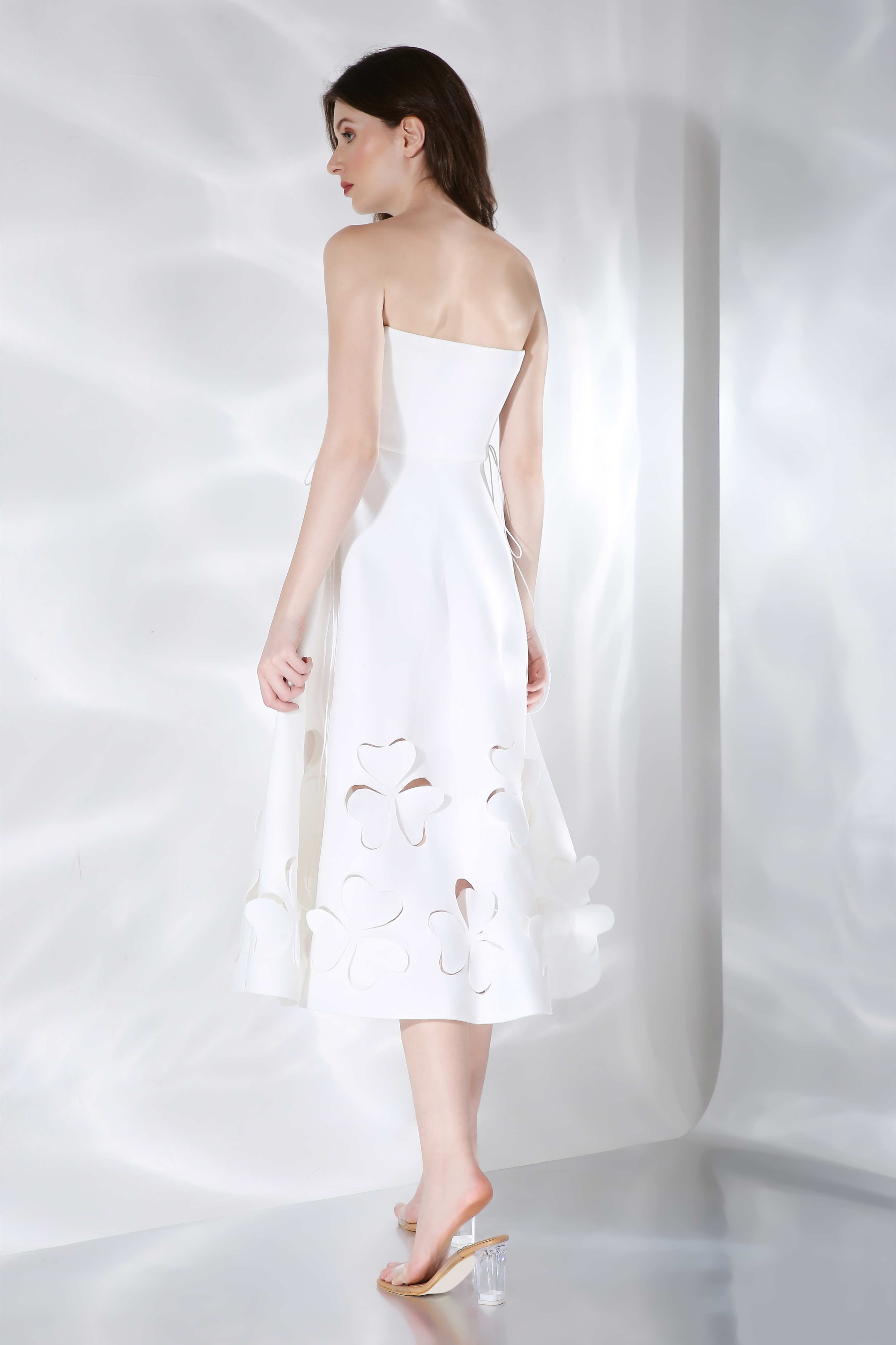 Featuring a fit and flare midi dress with floral cut-outs intricately done by hand.