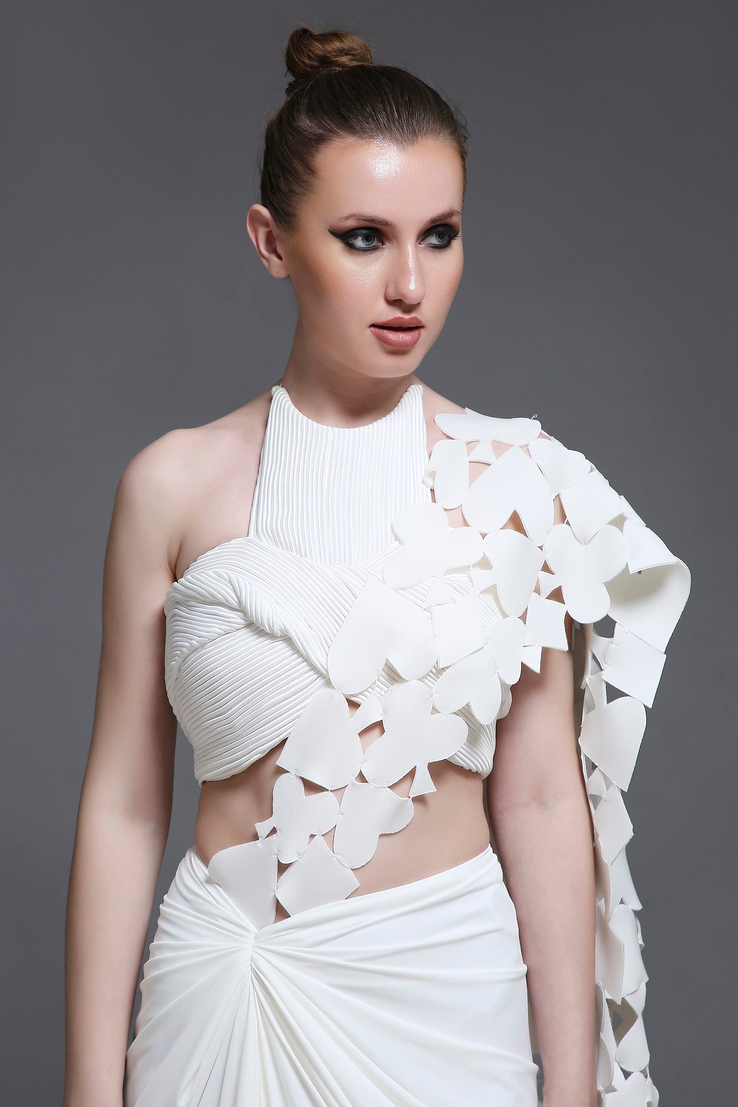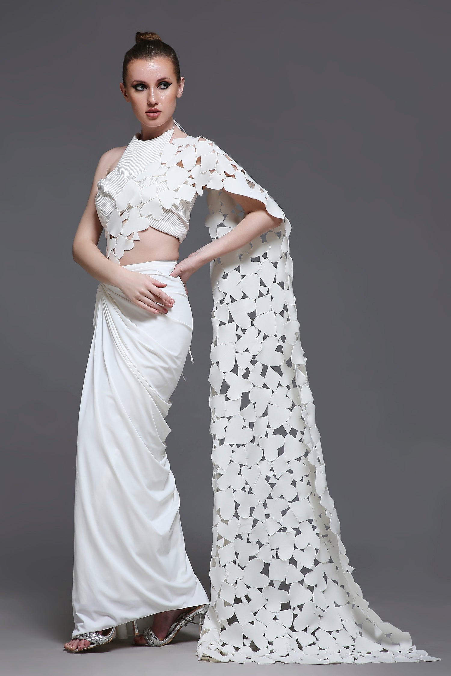 The set is paired with a flowing draped skirt, offering graceful movement and a flattering silhouette. Completing the look is a detachable drape with intricate cutwork patch detailing, adding an extra layer of elegance and artistry.