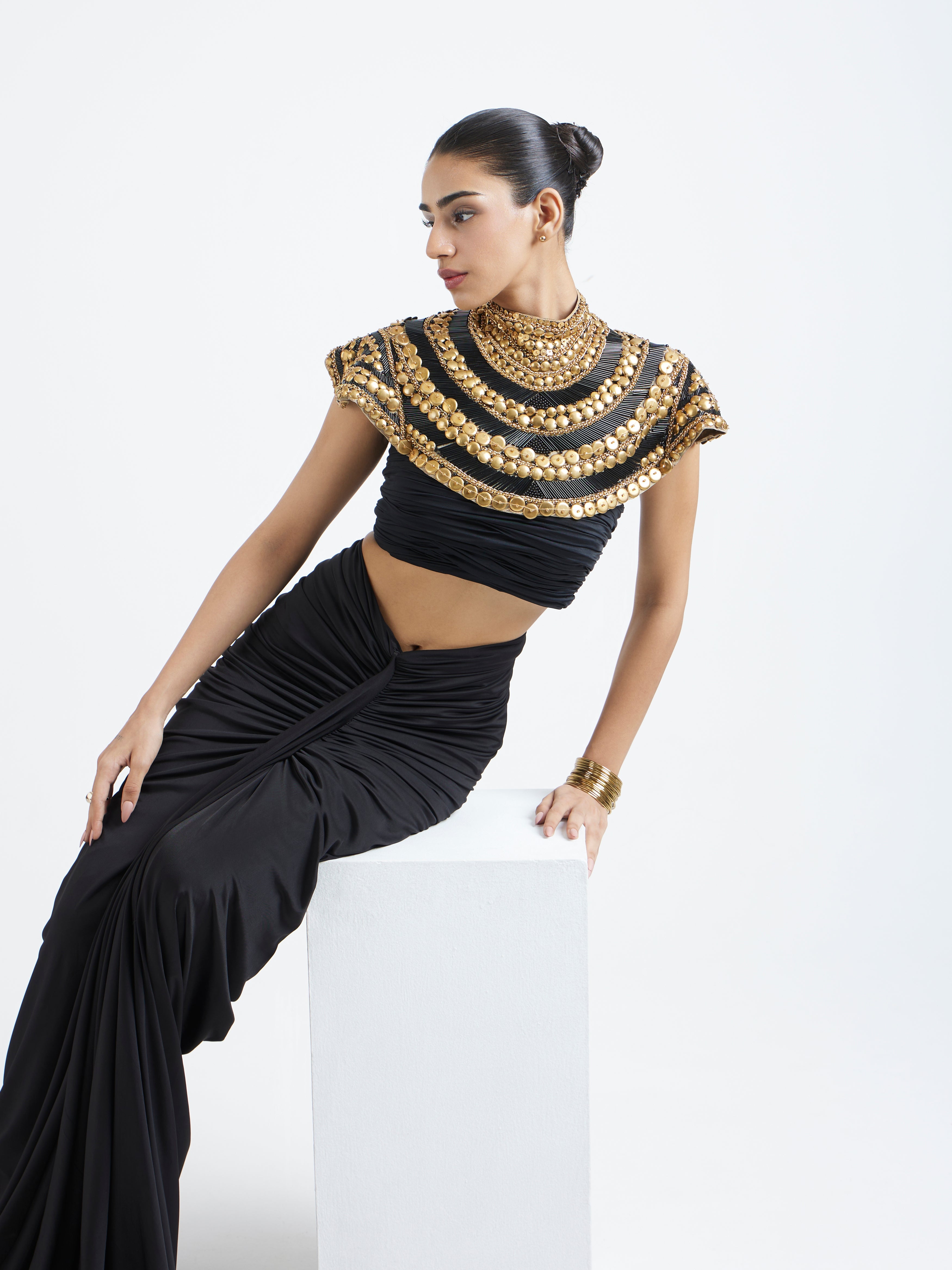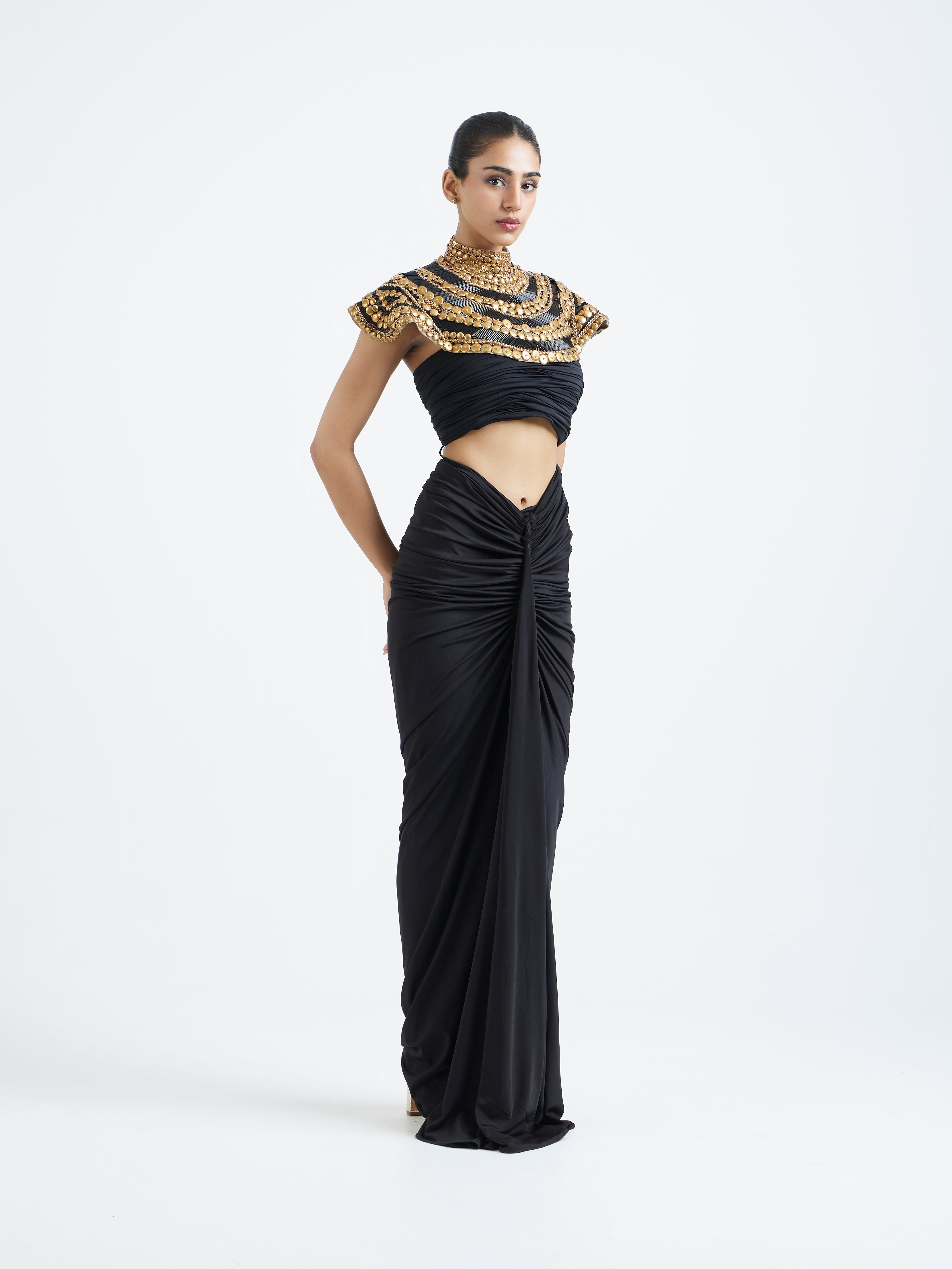 The sleek ruched skirt and fitted top create a sculpted, second-skin silhouette, while the detachable embellished overlay transforms the look with its opulent detailing. Hand-crafted with layers of gold accents, the overlay sits like modern armour—bold, architectural, and undeniably luxurious.