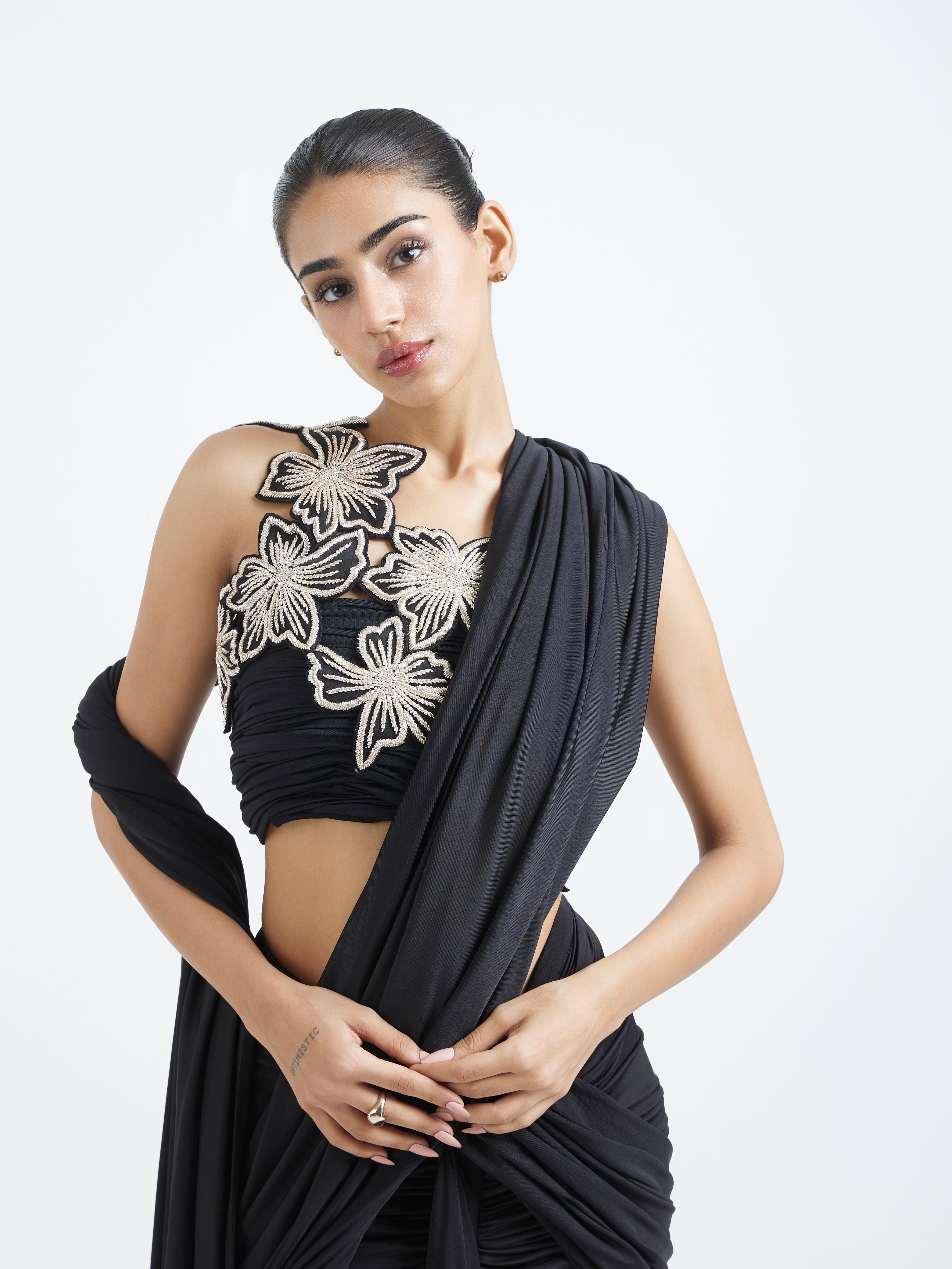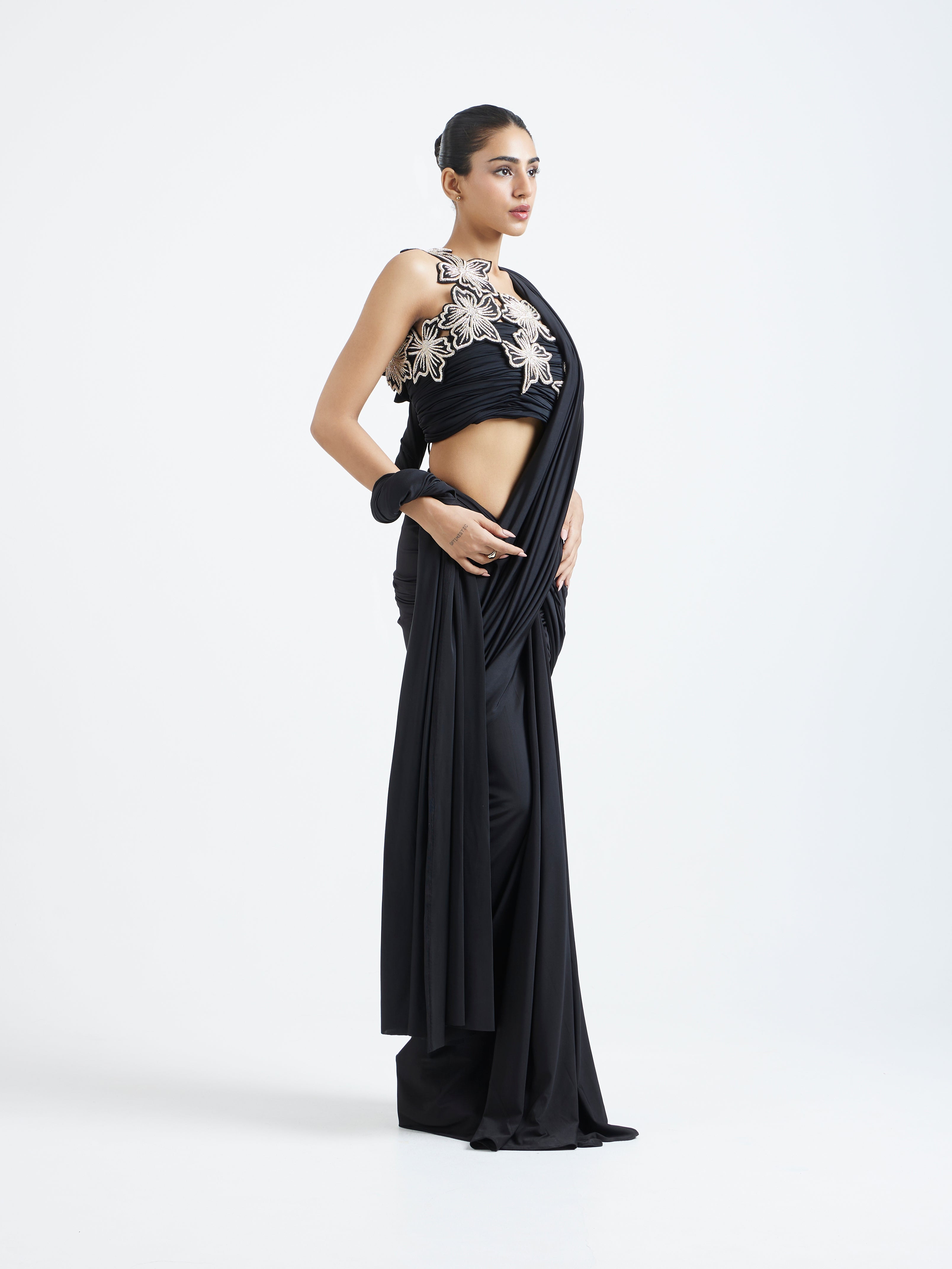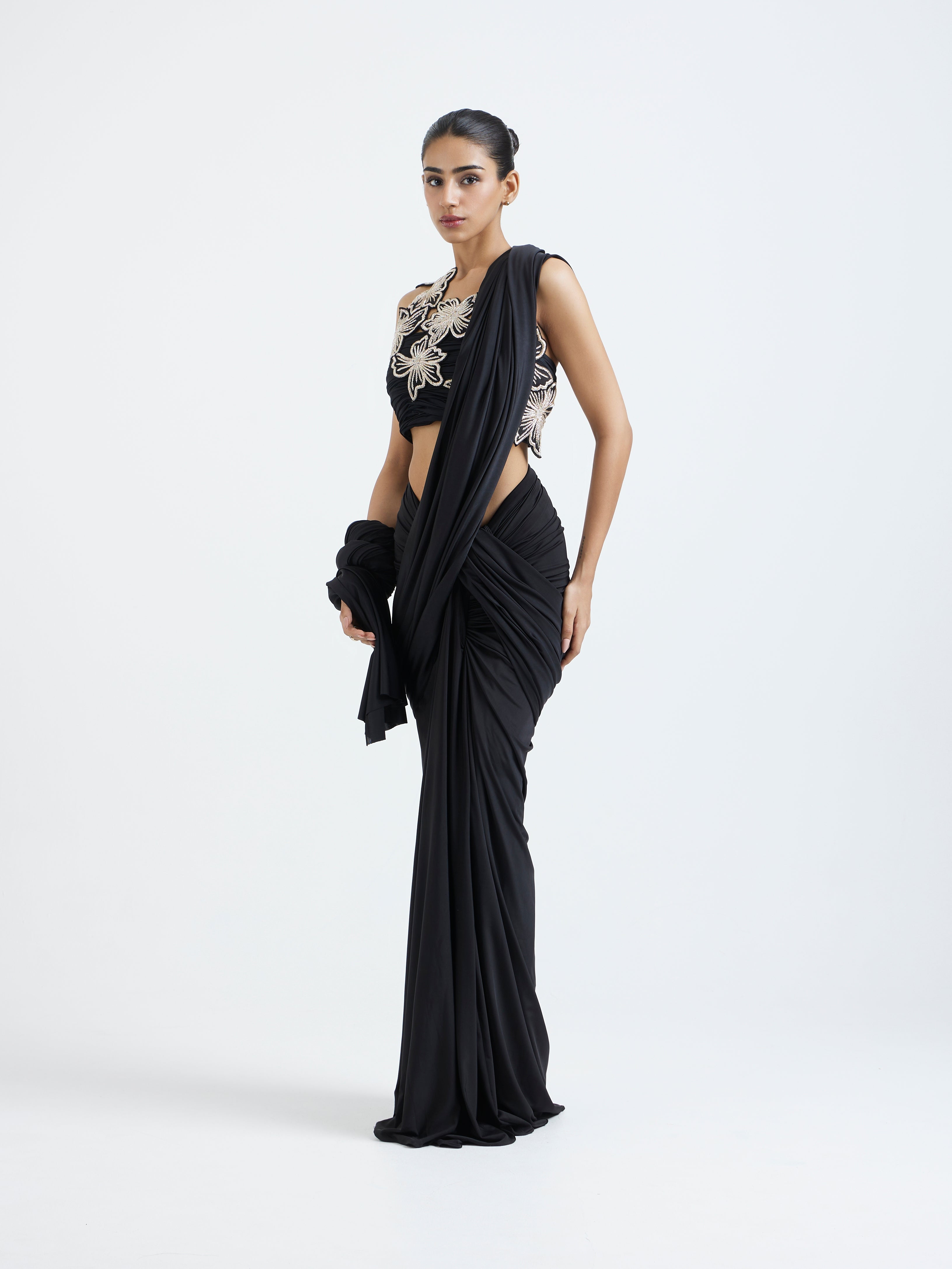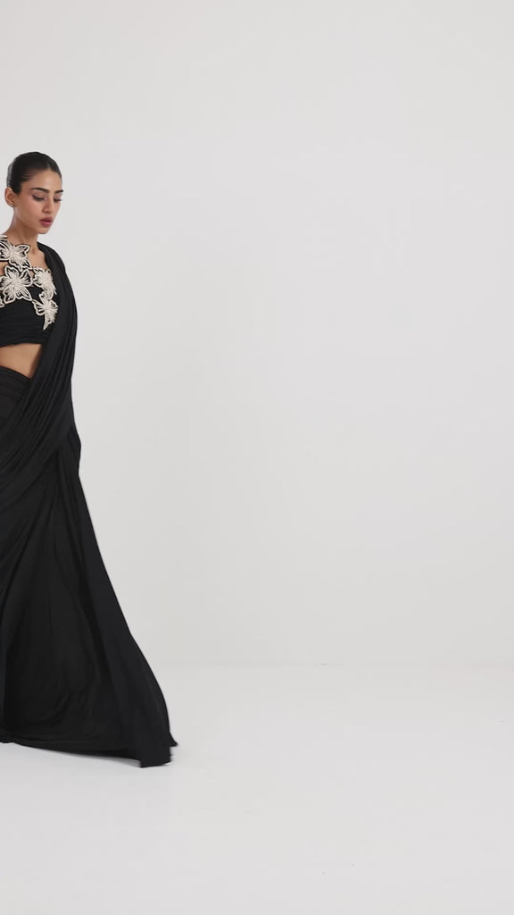 The detachable pallu adds movement and versatility, allowing you to style it as lightly or as dramatically as you prefer. The highlight of the ensemble is the intricate zardozi-embroidered overlay, creating a refined contrast against the sleek black base. Elegant, modern, and impeccably detailed—this piece is crafted for occasions that call for understated luxury with a touch of tradition.