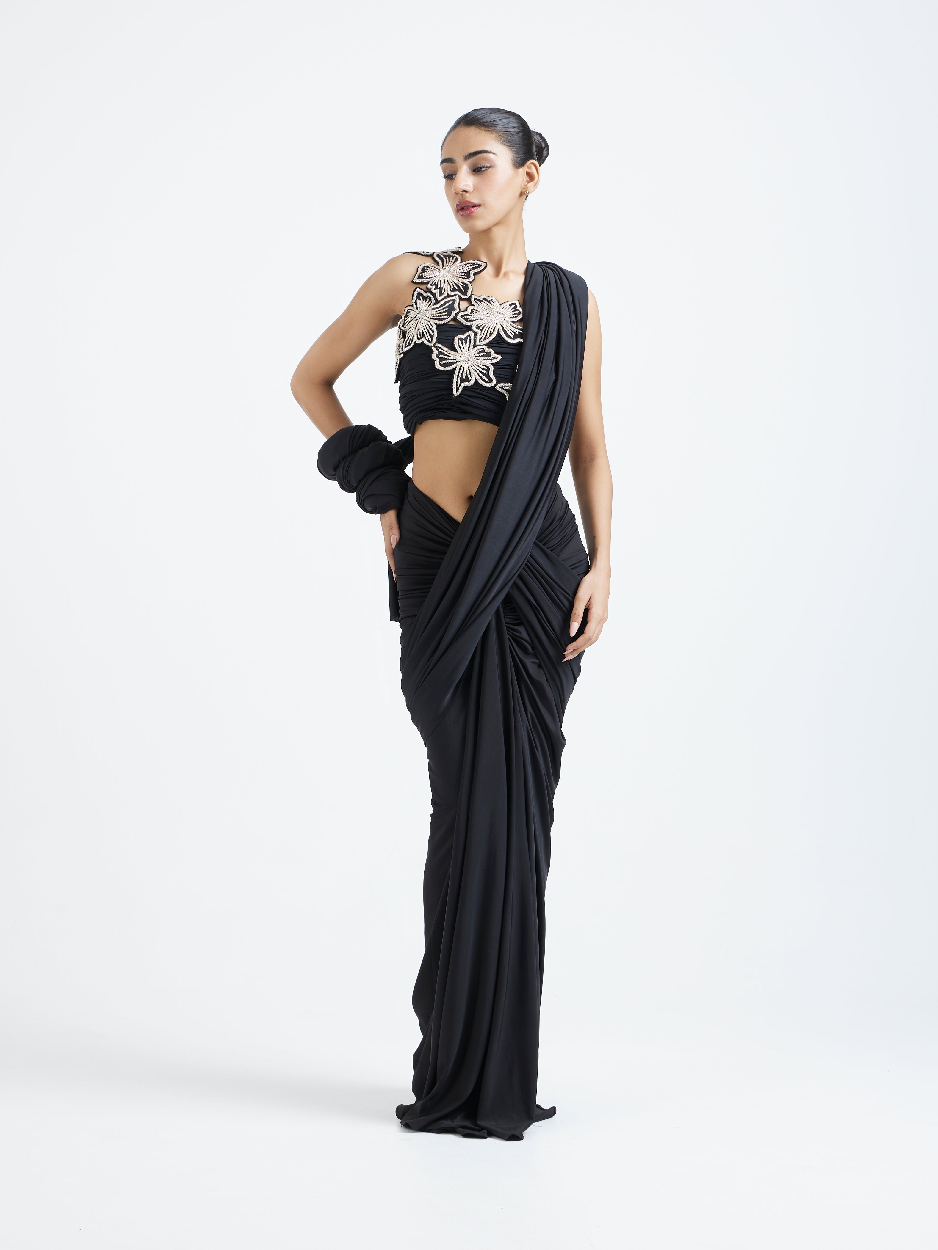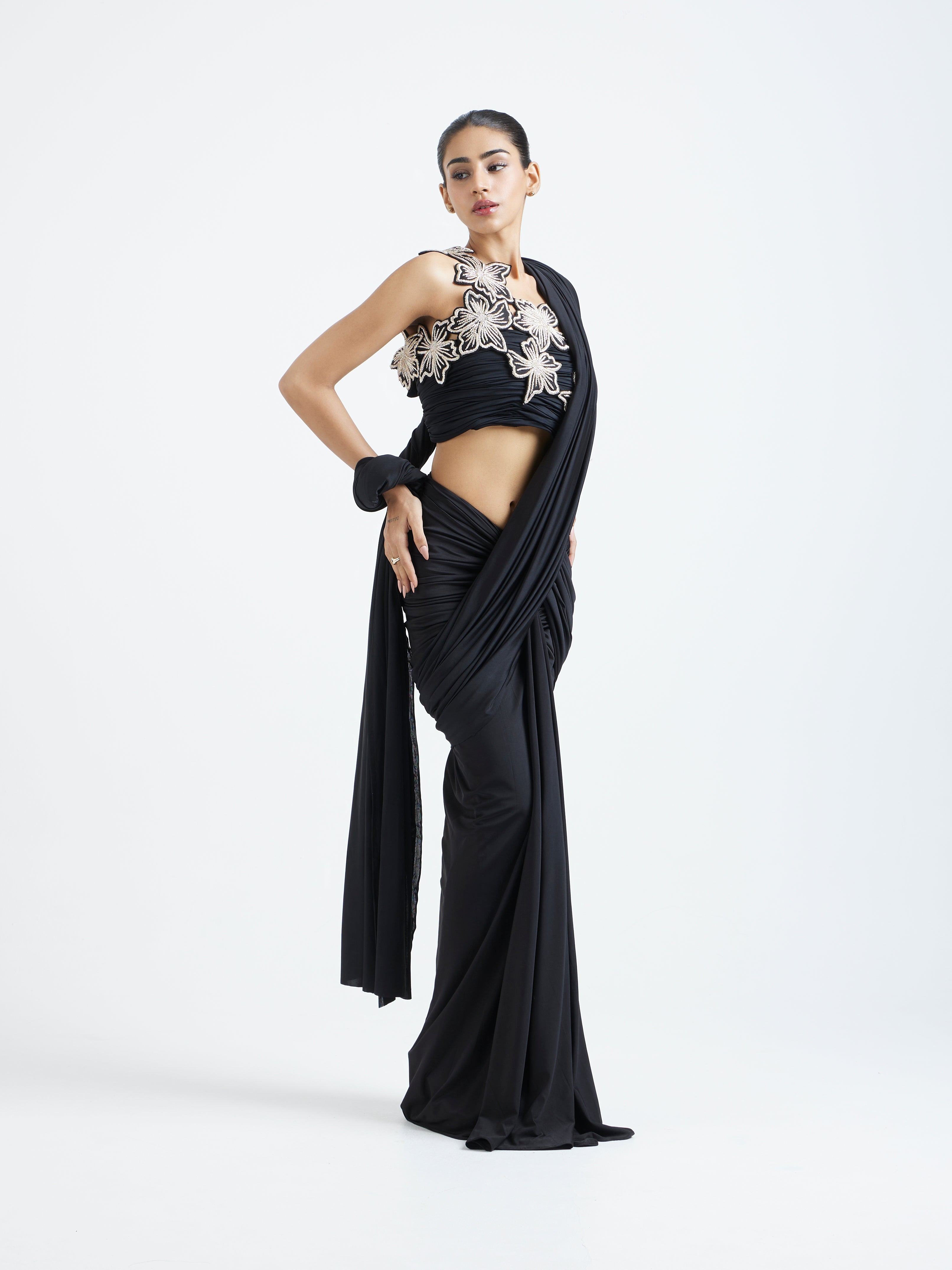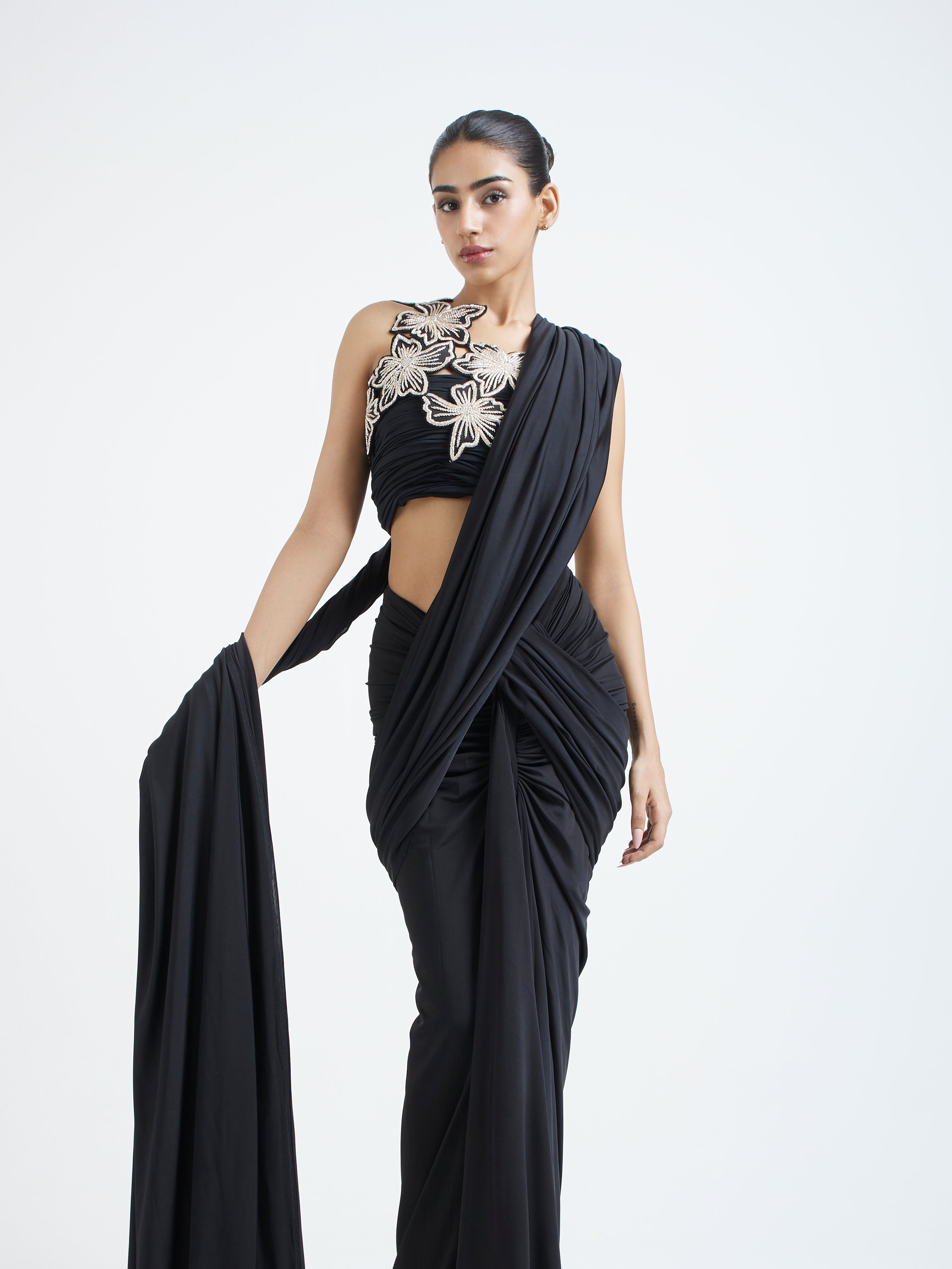The detachable pallu adds movement and versatility, allowing you to style it as lightly or as dramatically as you prefer. The highlight of the ensemble is the intricate zardozi-embroidered overlay, creating a refined contrast against the sleek black base. Elegant, modern, and impeccably detailed—this piece is crafted for occasions that call for understated luxury with a touch of tradition.