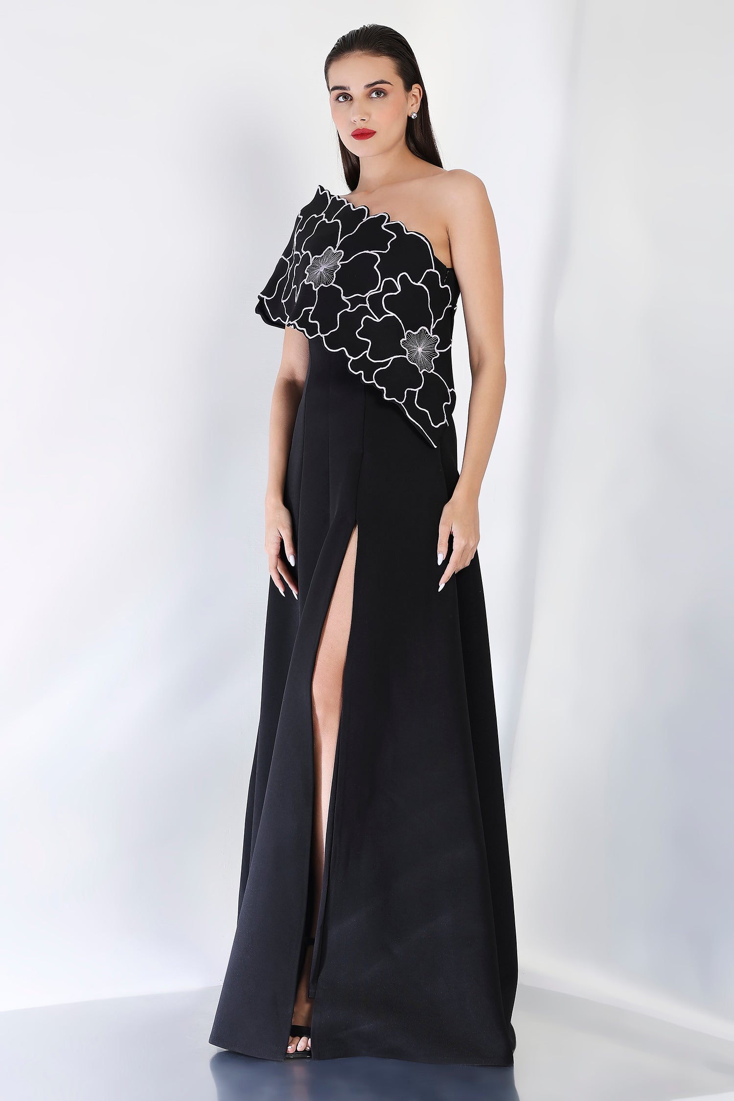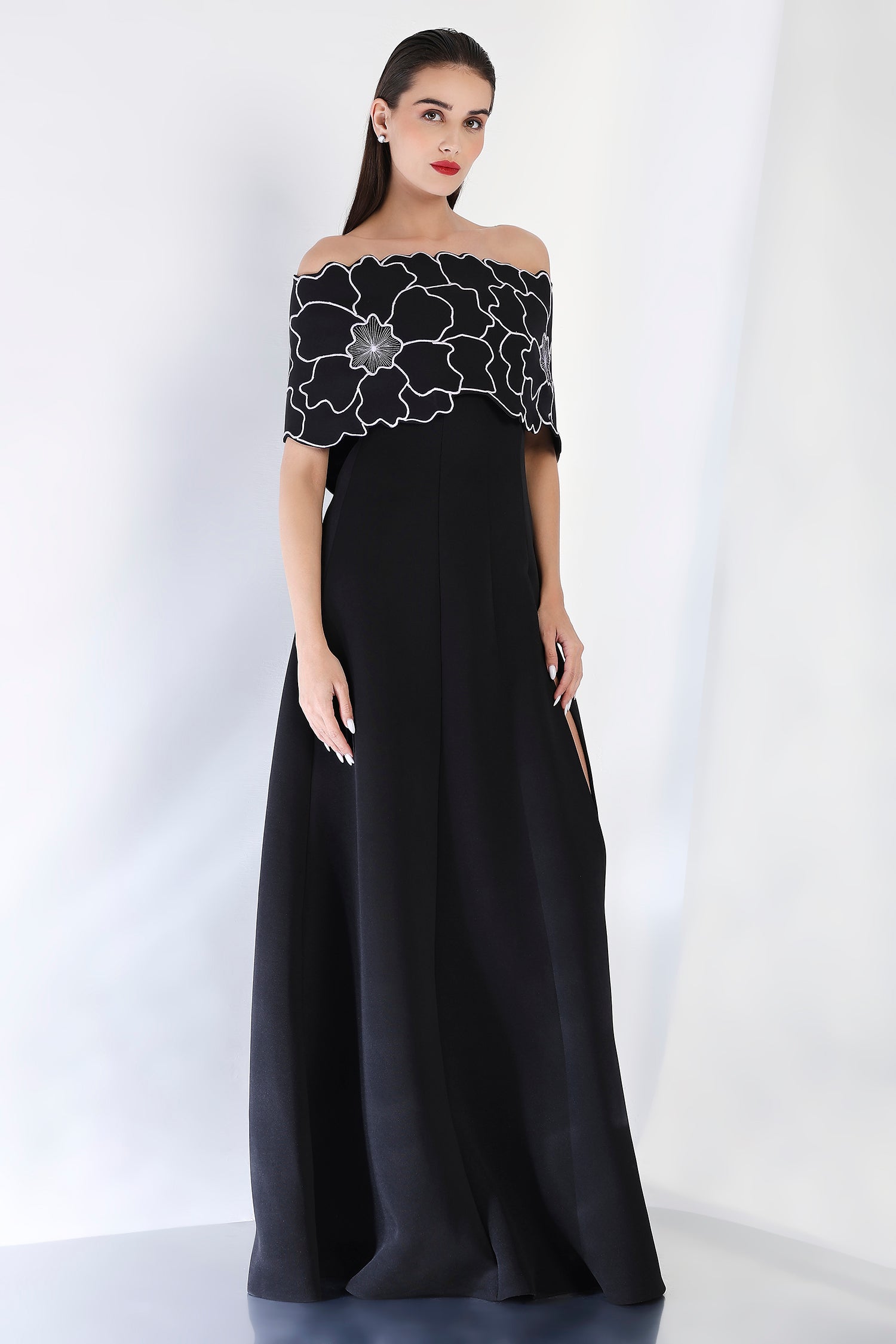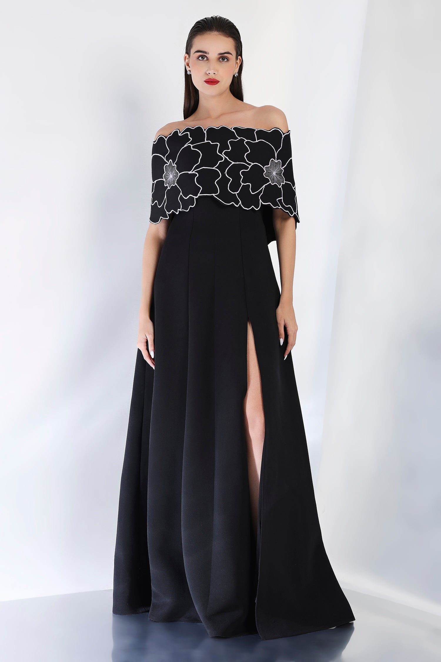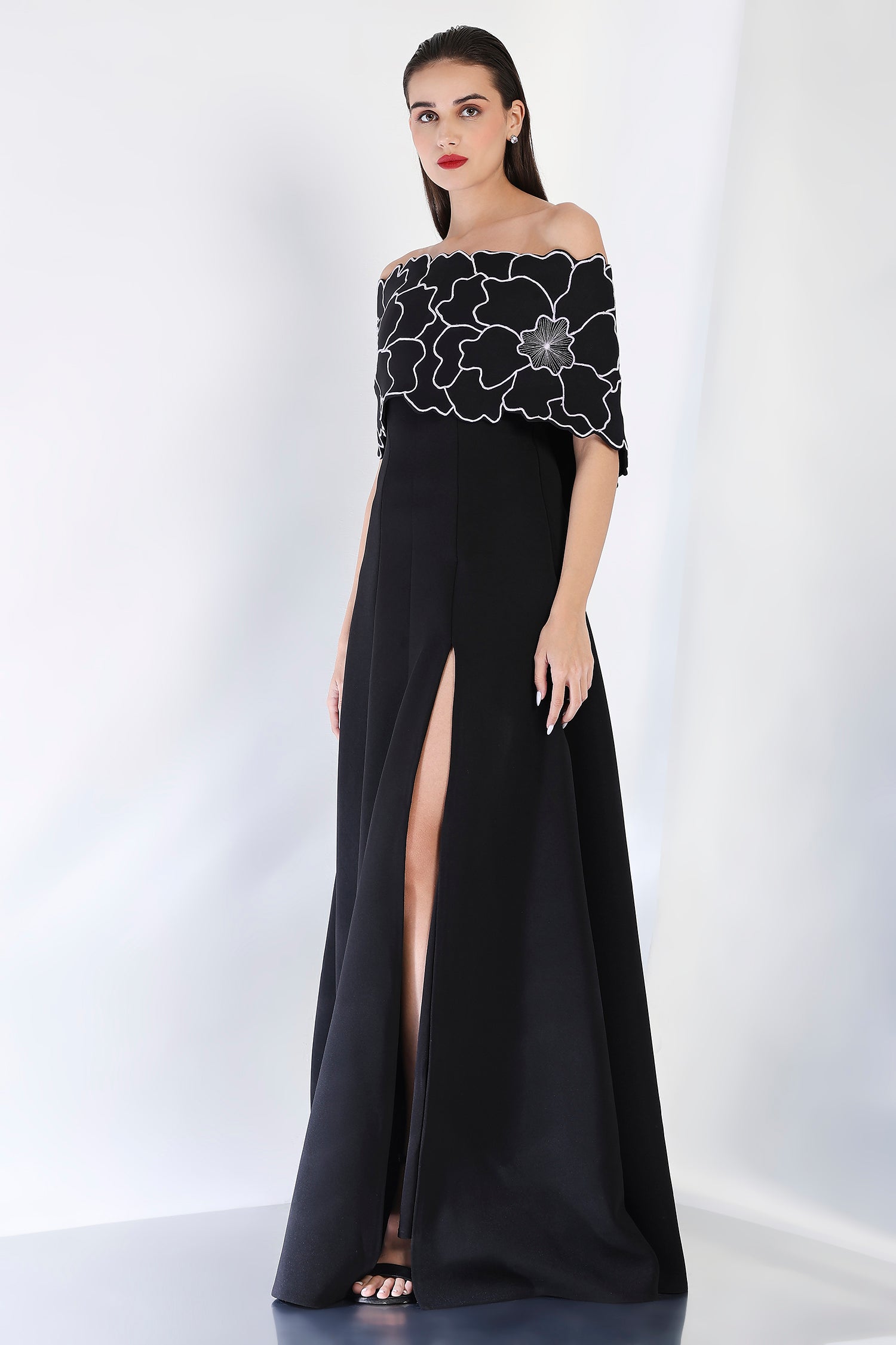 This strapless panel dress with a sultry front slit is paired with the Bella embroidered wrap, which can be styled either one-shoulder or off-shoulder. The intricate embroidery adds an element of artistry and refinement, making this an exquisite choice for an evening event where sophistication and style are a must.