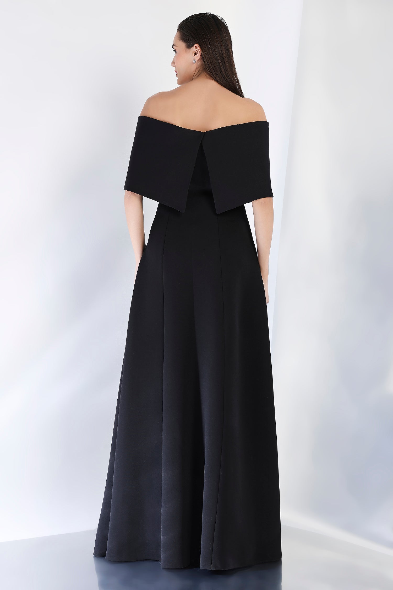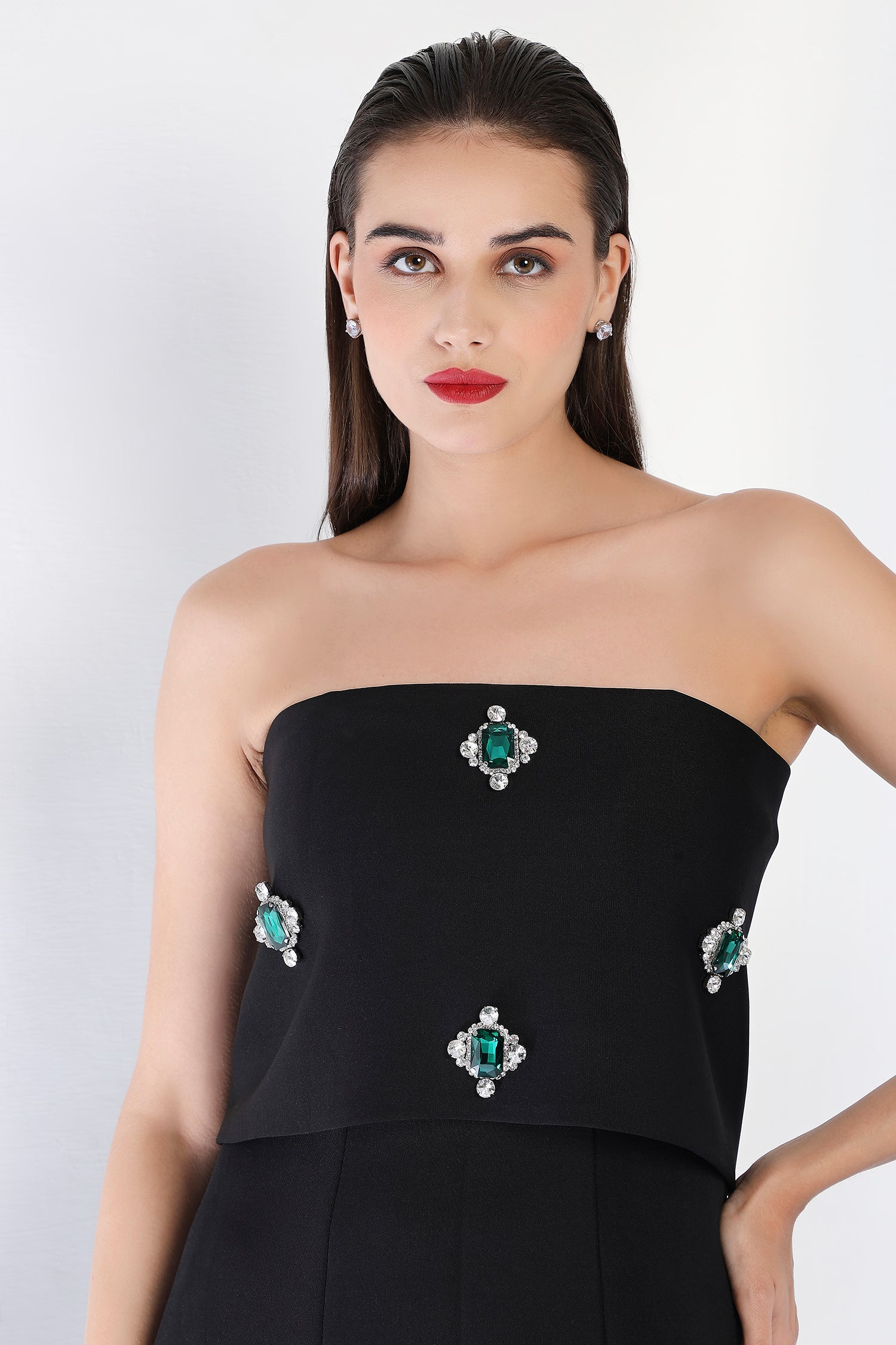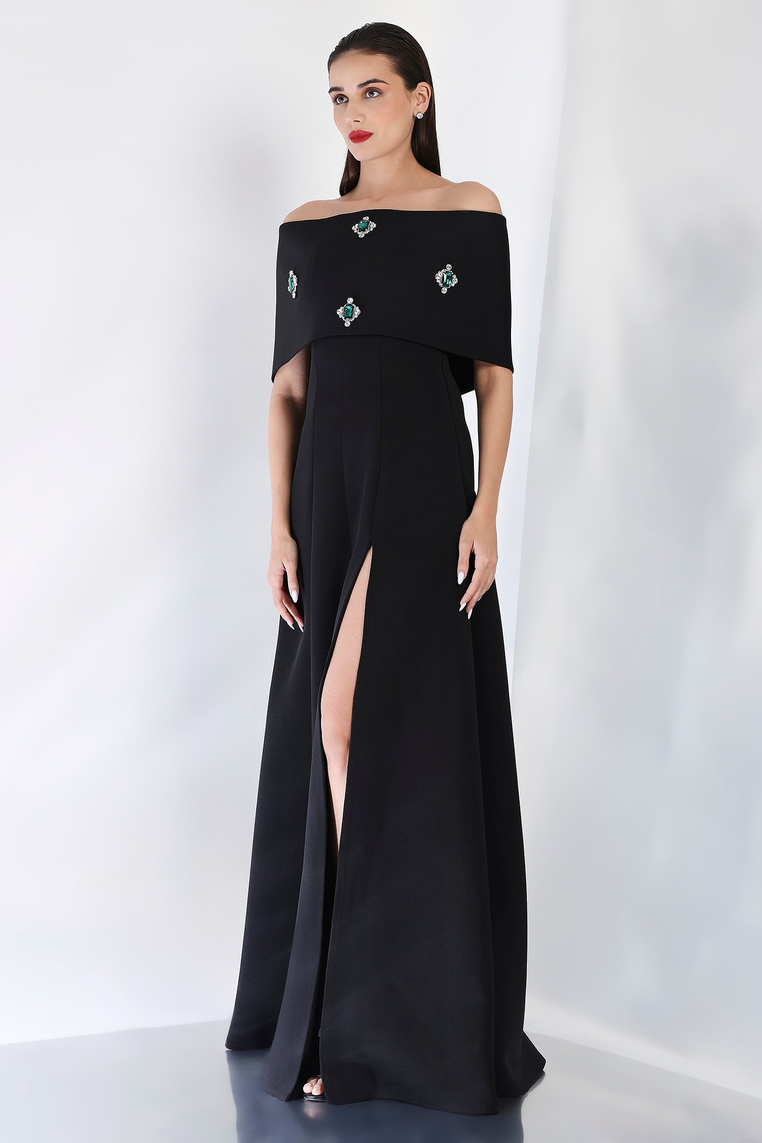 Timeless and luxurious, this strapless panel dress with a front slit creates a sleek, flattering shape. The emerald-studded wrap, positioned at the center, can be styled either one-shoulder or off-shoulder, offering a sparkling focal point to the ensemble. Perfect for those seeking a glamorous and refined look for an evening celebration.
