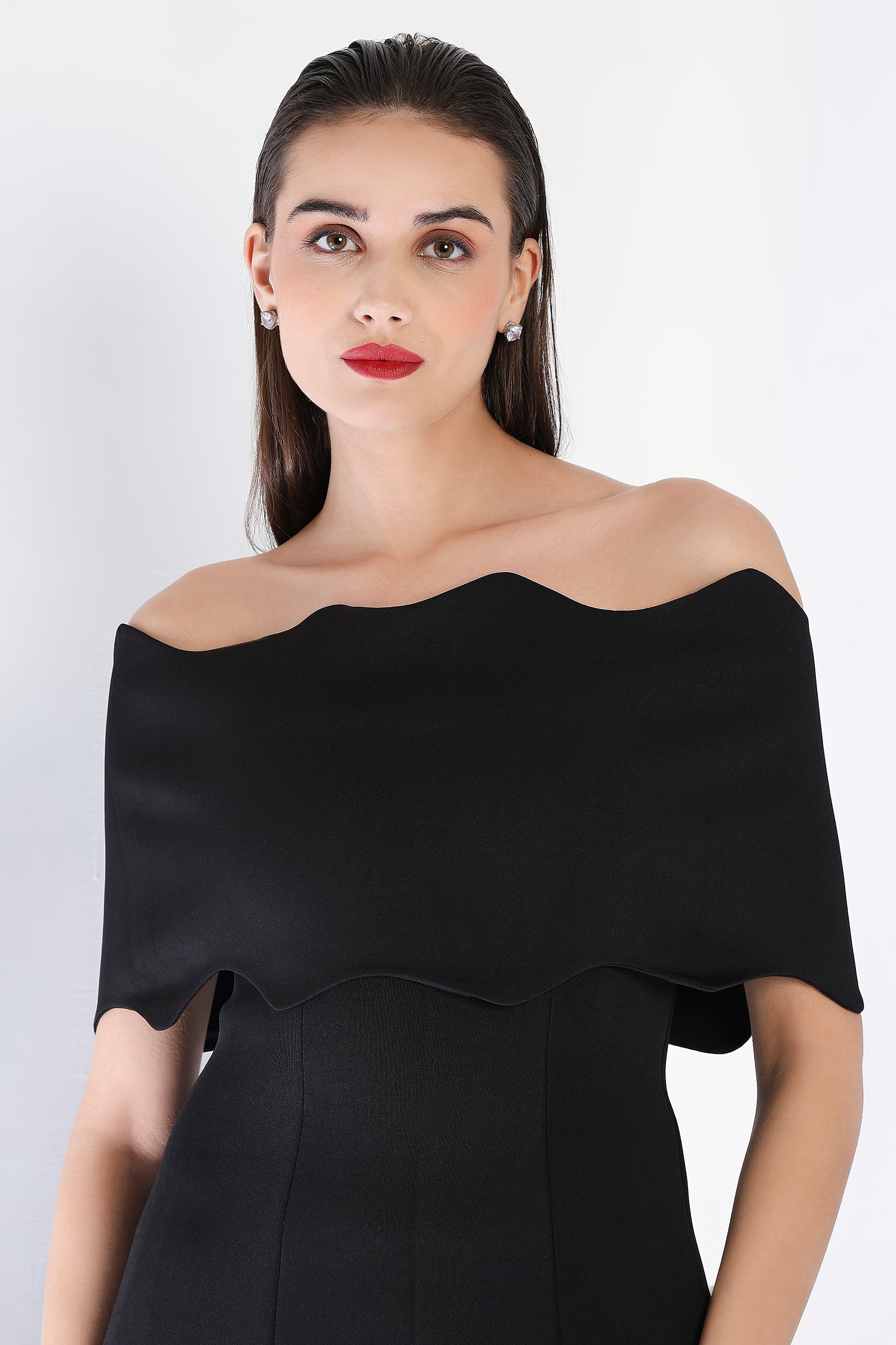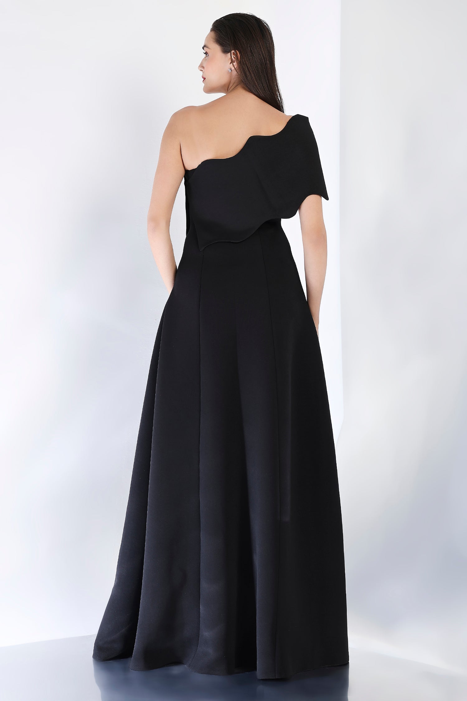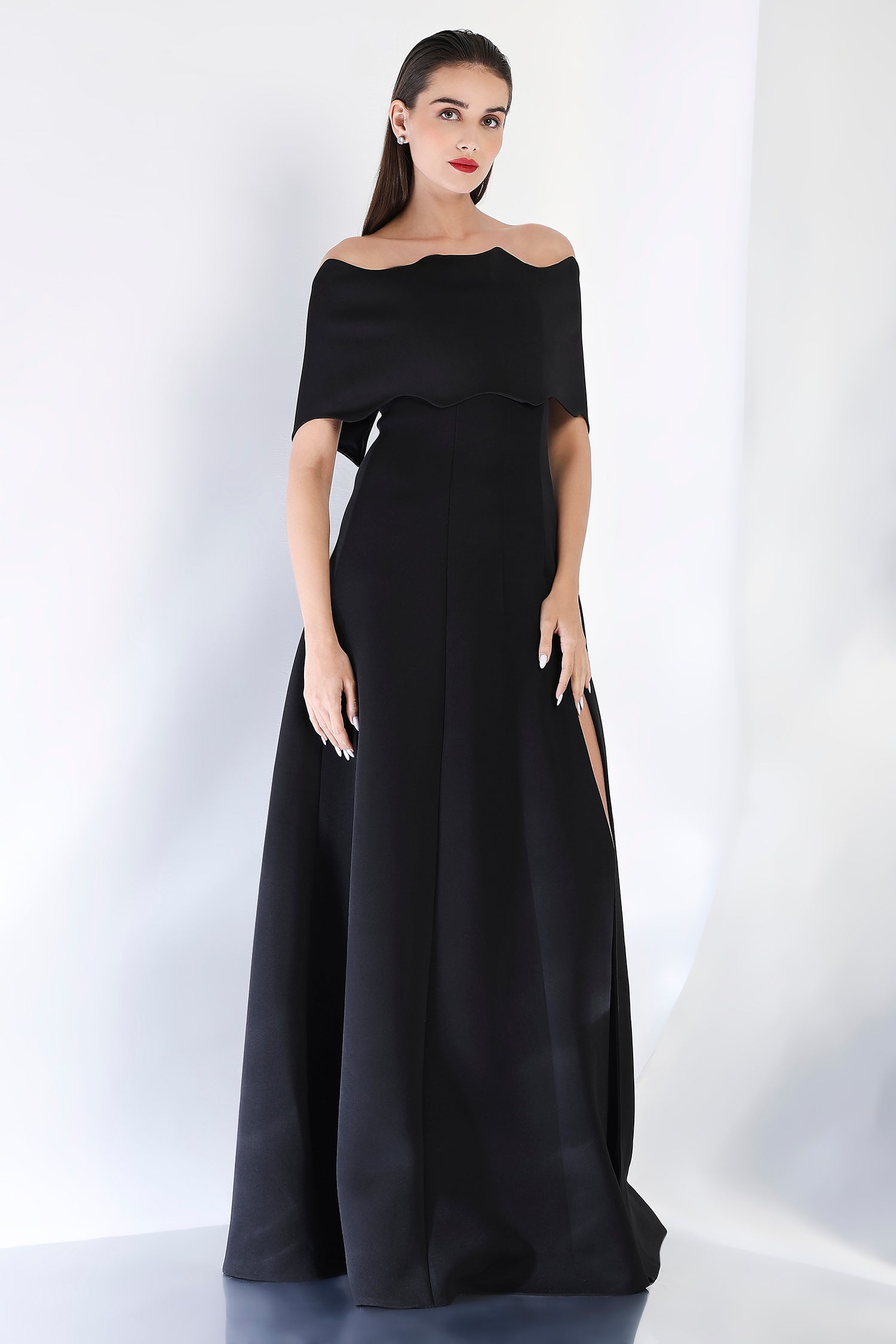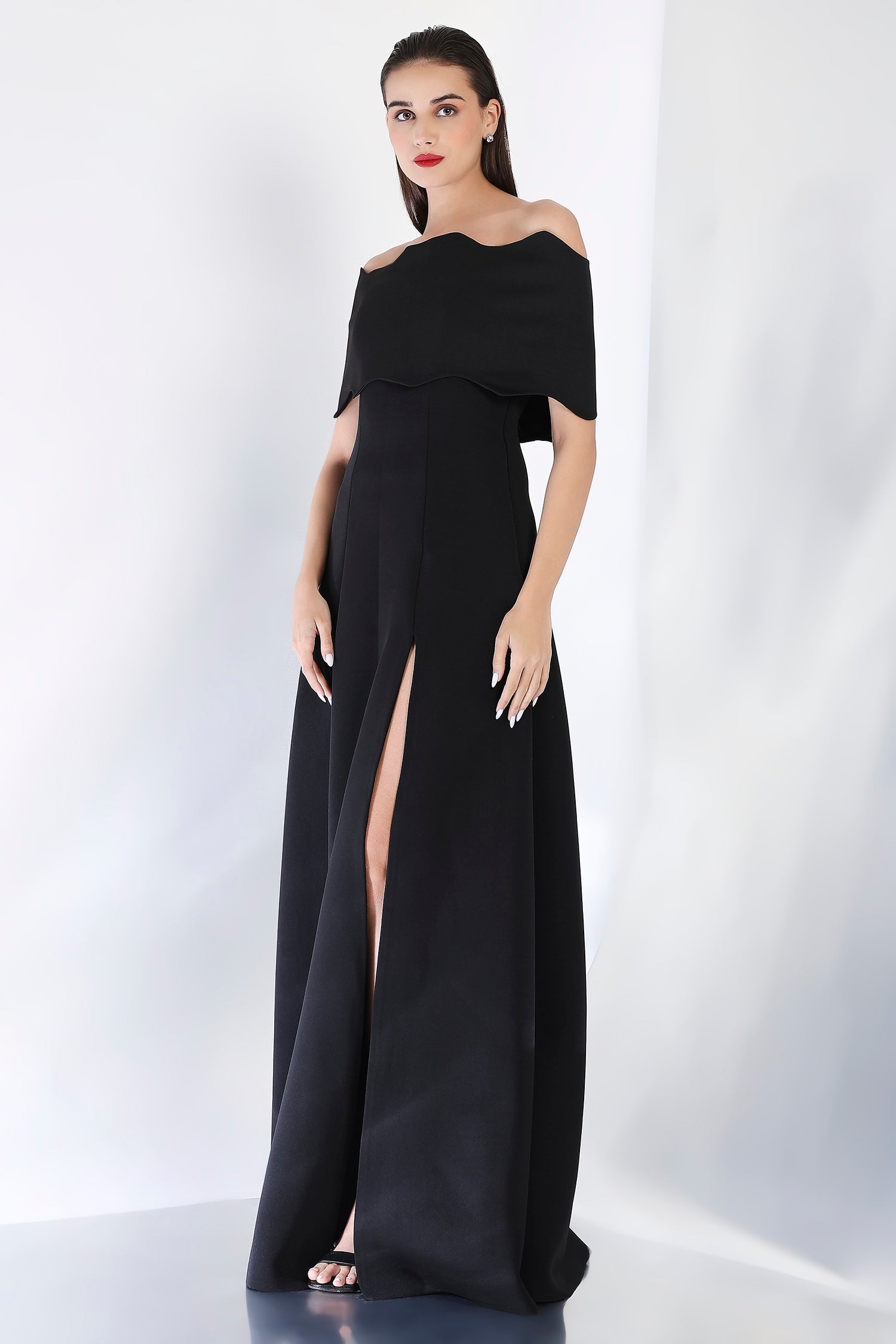 The flattering fit of this strapless panel dress, combined with its front slit maxi length, creates an effortlessly chic silhouette. Paired with a wave wrap that can be styled both one-shoulder or off-shoulder, this ensemble offers a sophisticated twist on modern fashion, perfect for both formal and semi-formal events.