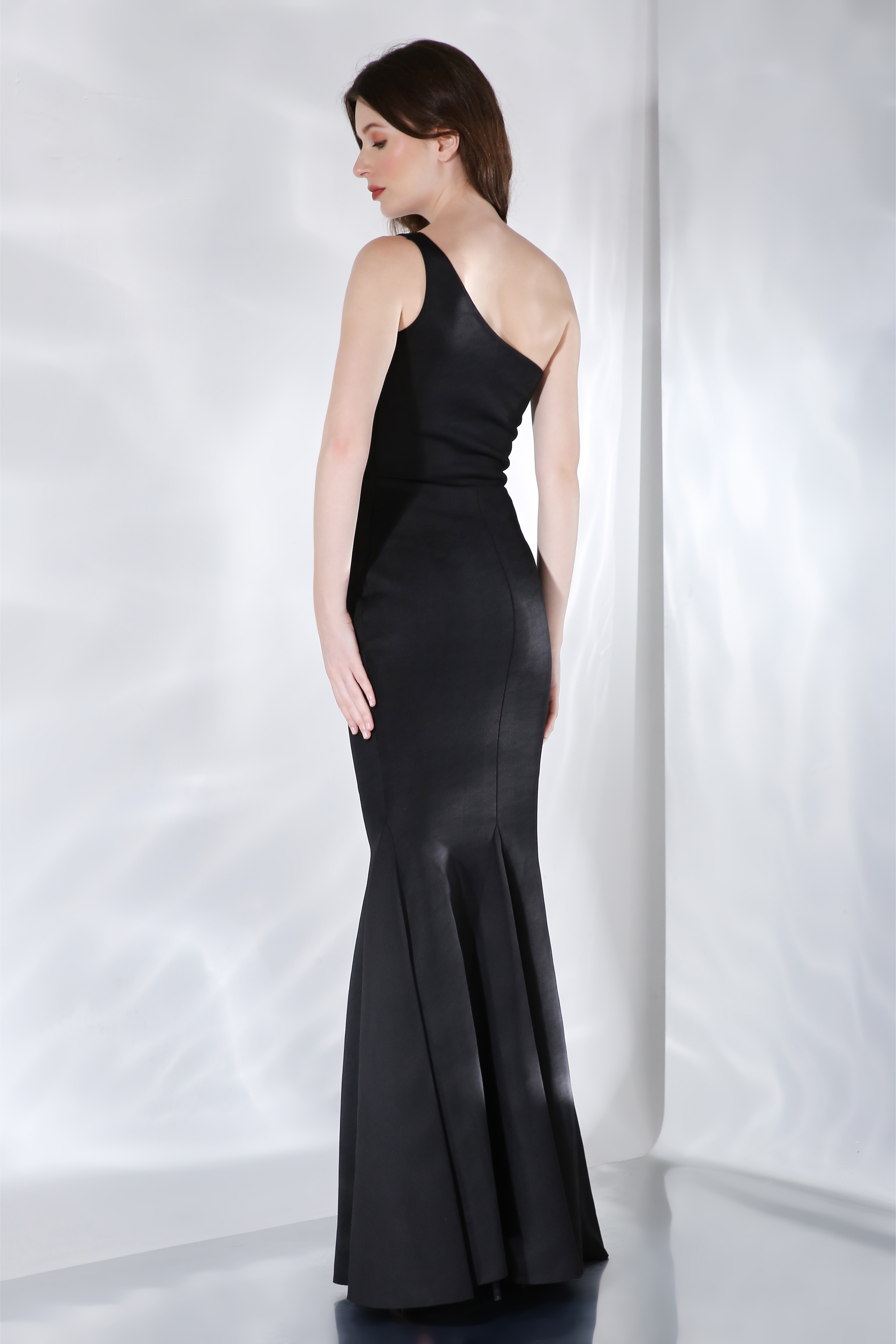 Featuring a one shoulder panelled gown which accentuates your body in a fish cut silhouette. Hugging all your curves perfectly with a flattering fit, since is a made-to-measure product, you can also specify the exact length desired by you.