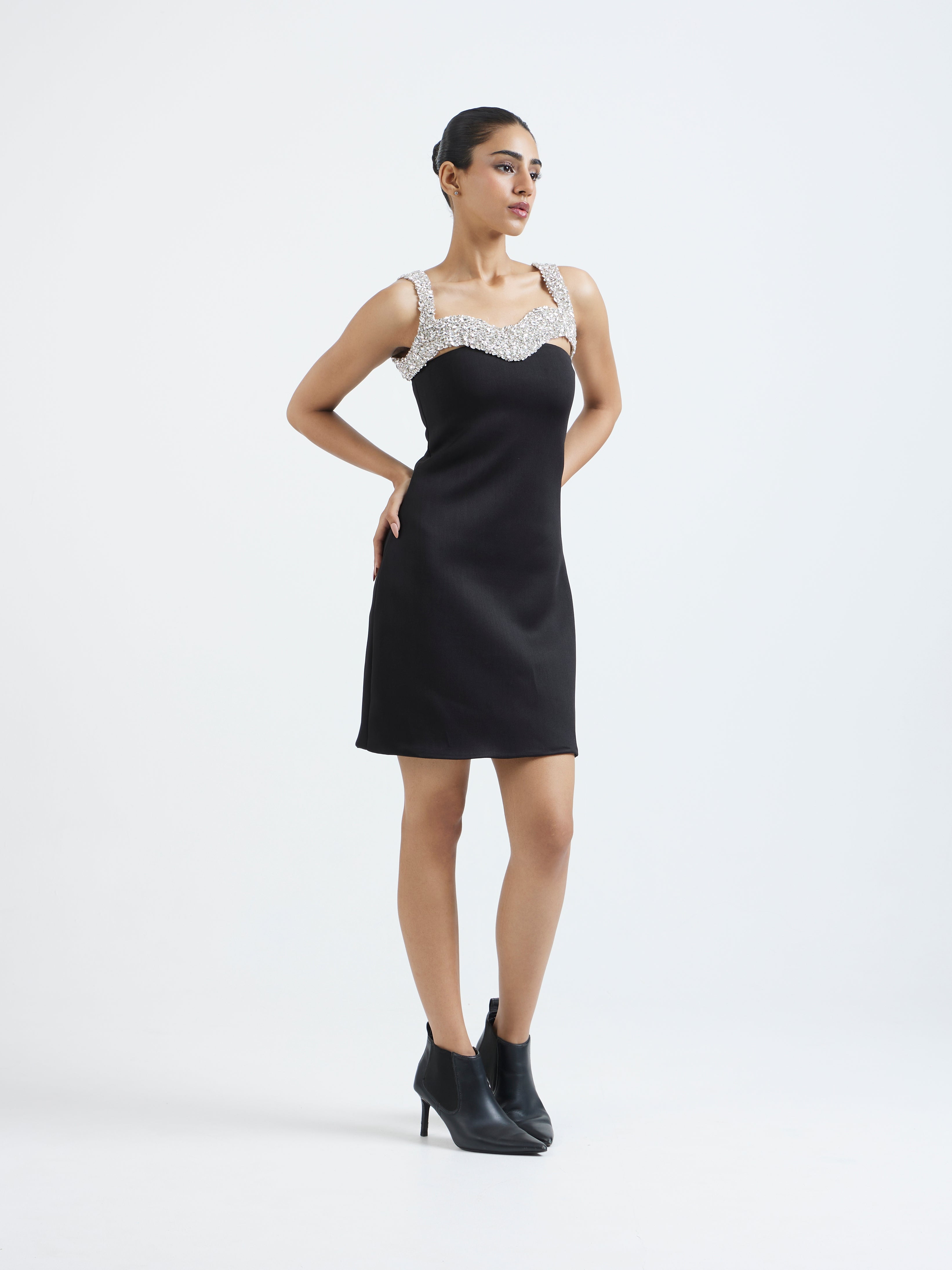 A black neoprene dress elevated with a sculpted embellished overlay that frames the neckline beautifully. The sleek silhouette keeps the look modern and minimal, while the shimmering hand-worked detailing adds just the right amount of glamour.